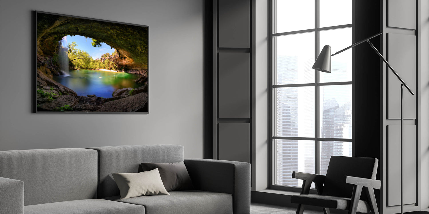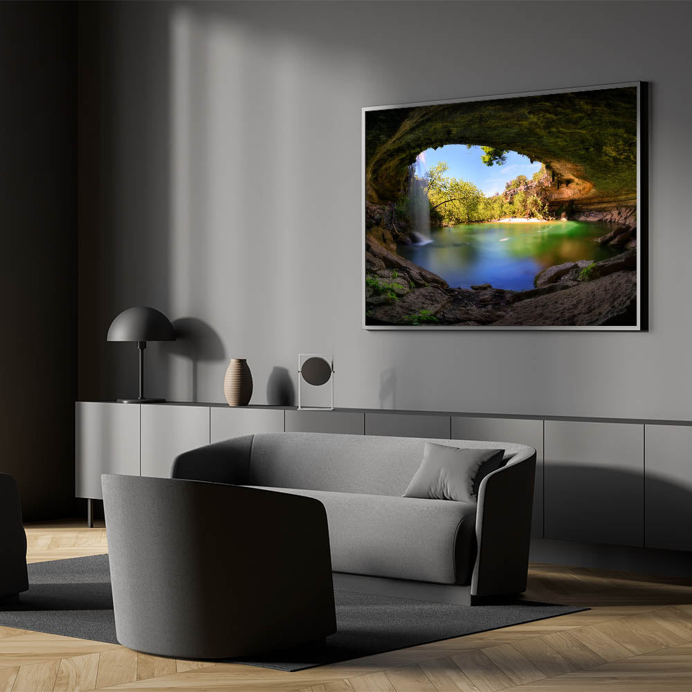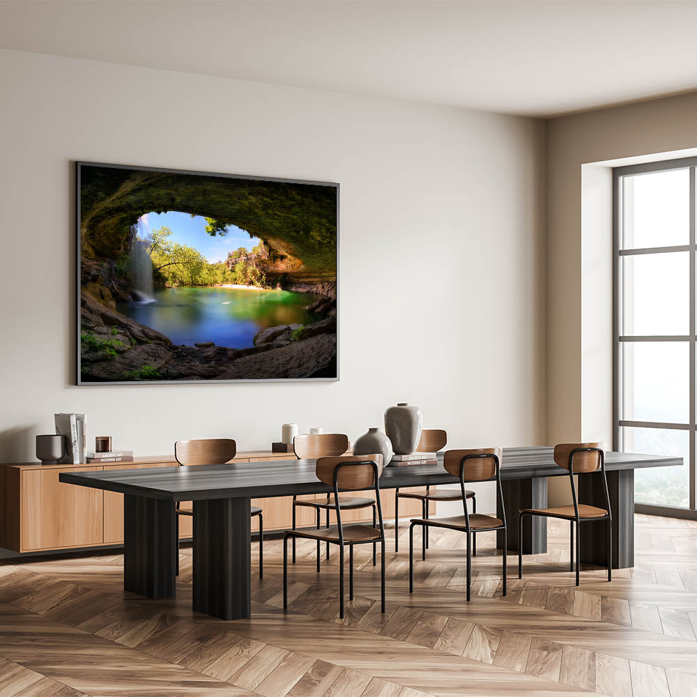 - Breathtaking Detail: The soft waterfall and vibrant greenery are captured in vivid detail, bringing the tranquility of Hamilton Pool into your home.