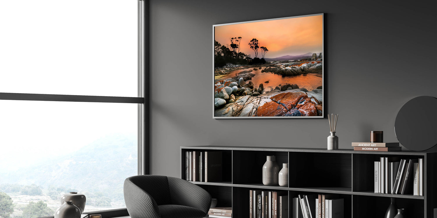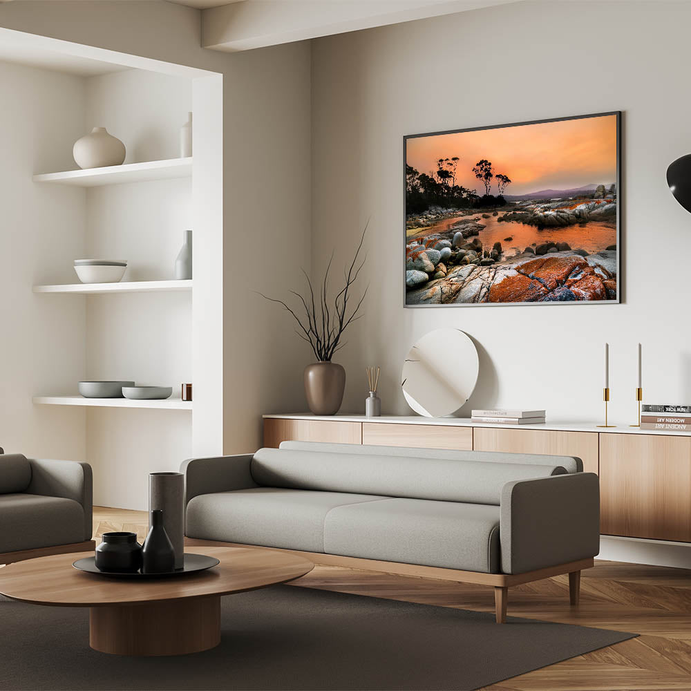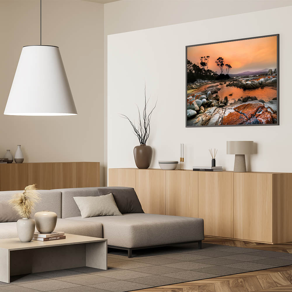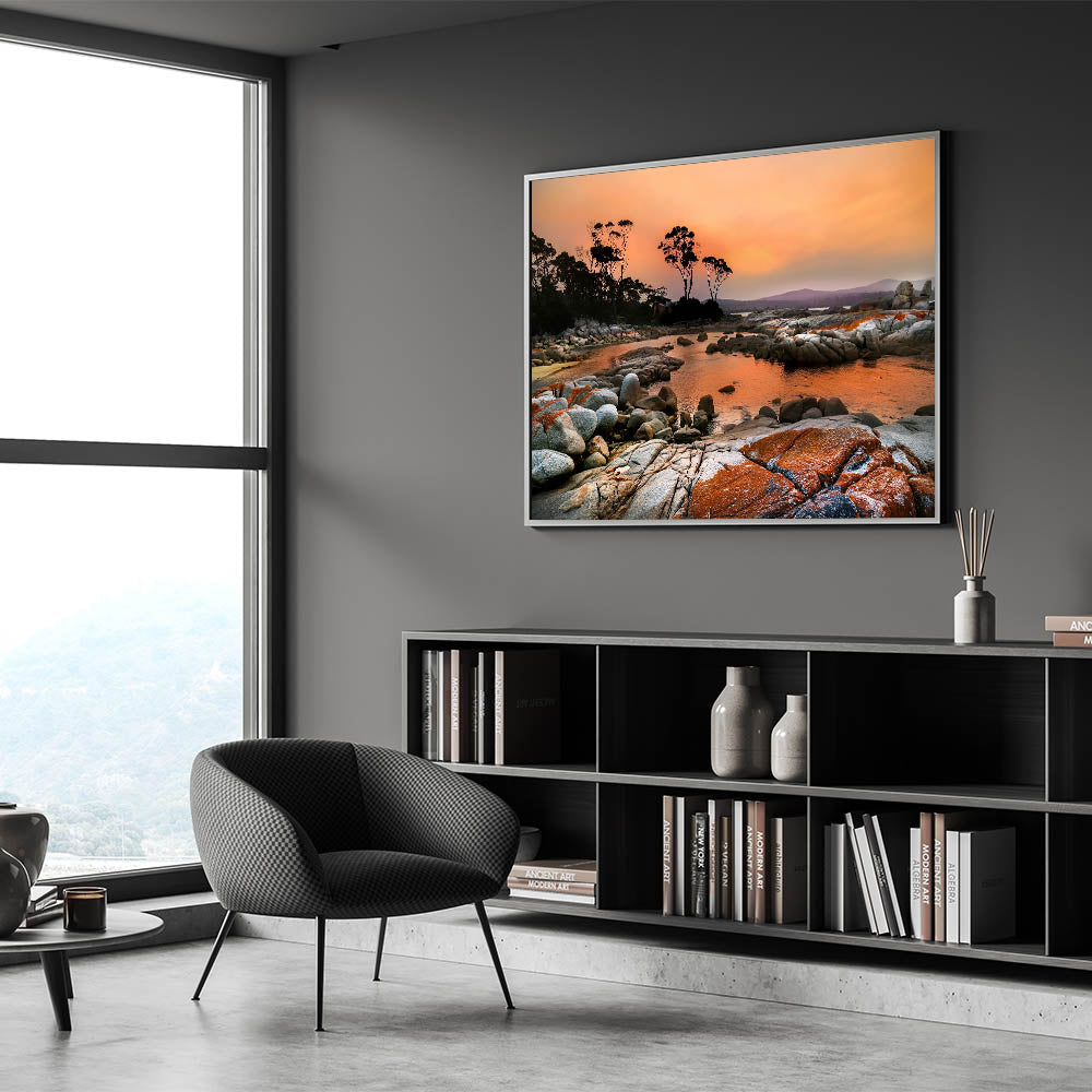 Experience the vibrant beauty of Tasmania’s Bay of Fires with this stunning artwork featuring a fiery sunset over the rocky coastline. The bold contrast of glowing orange skies against the natural gray and orange hues of the rocks creates a dramatic yet serene atmosphere. The gentle reflection of the sunset on the water adds depth and warmth, making this piece an ideal focal point for any room that needs a touch of natural wonder.