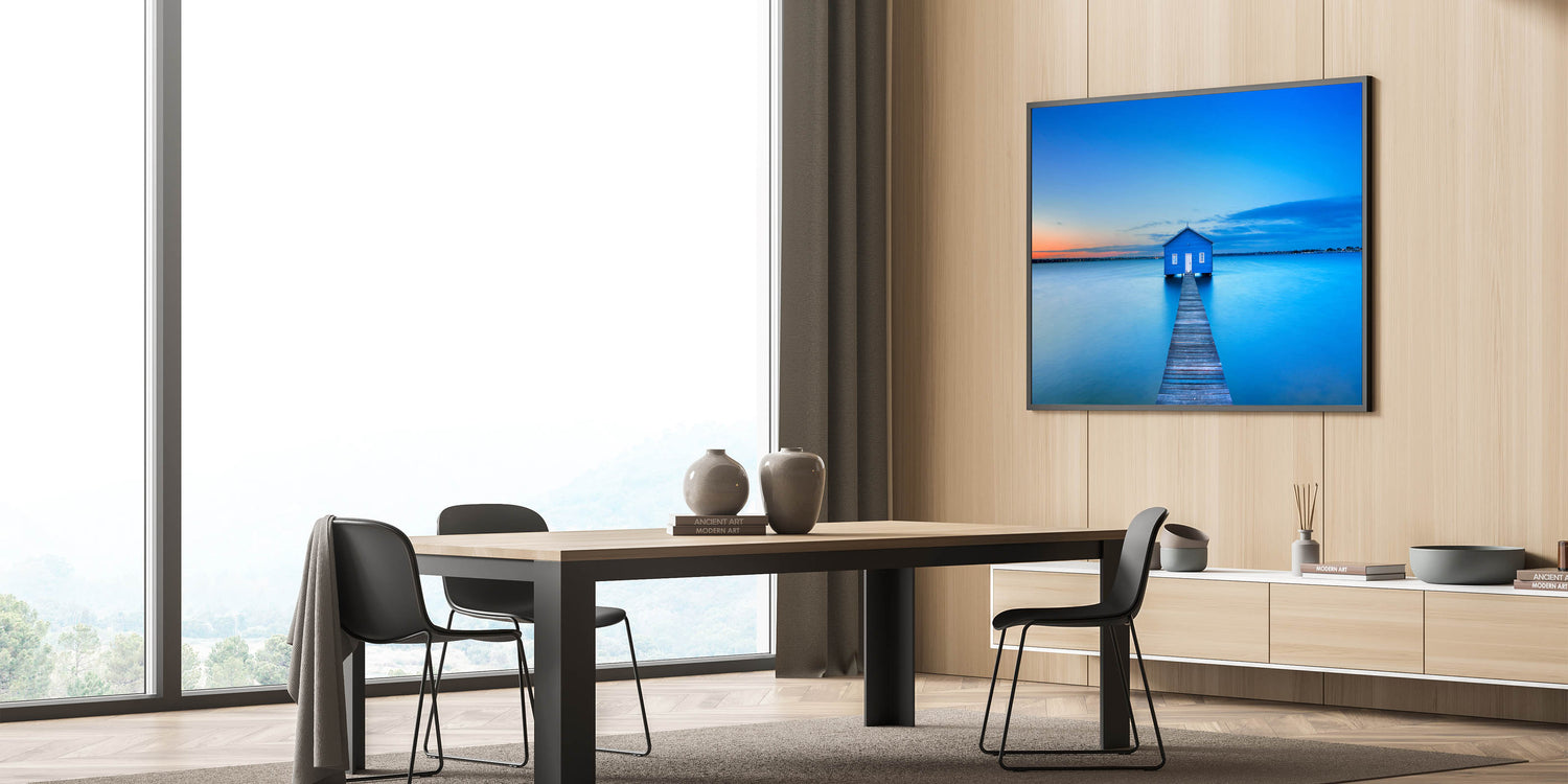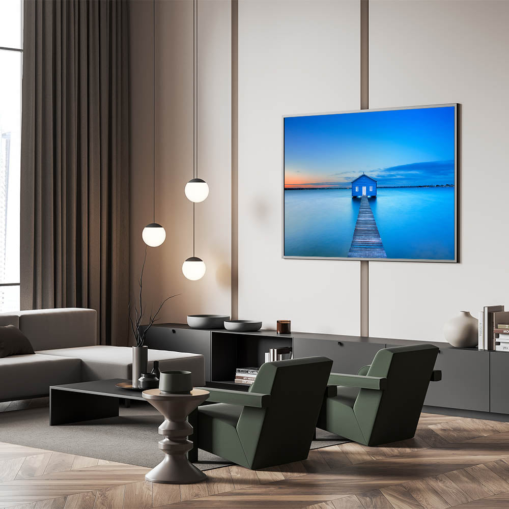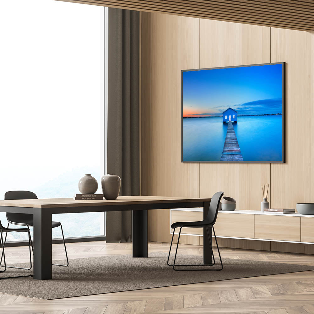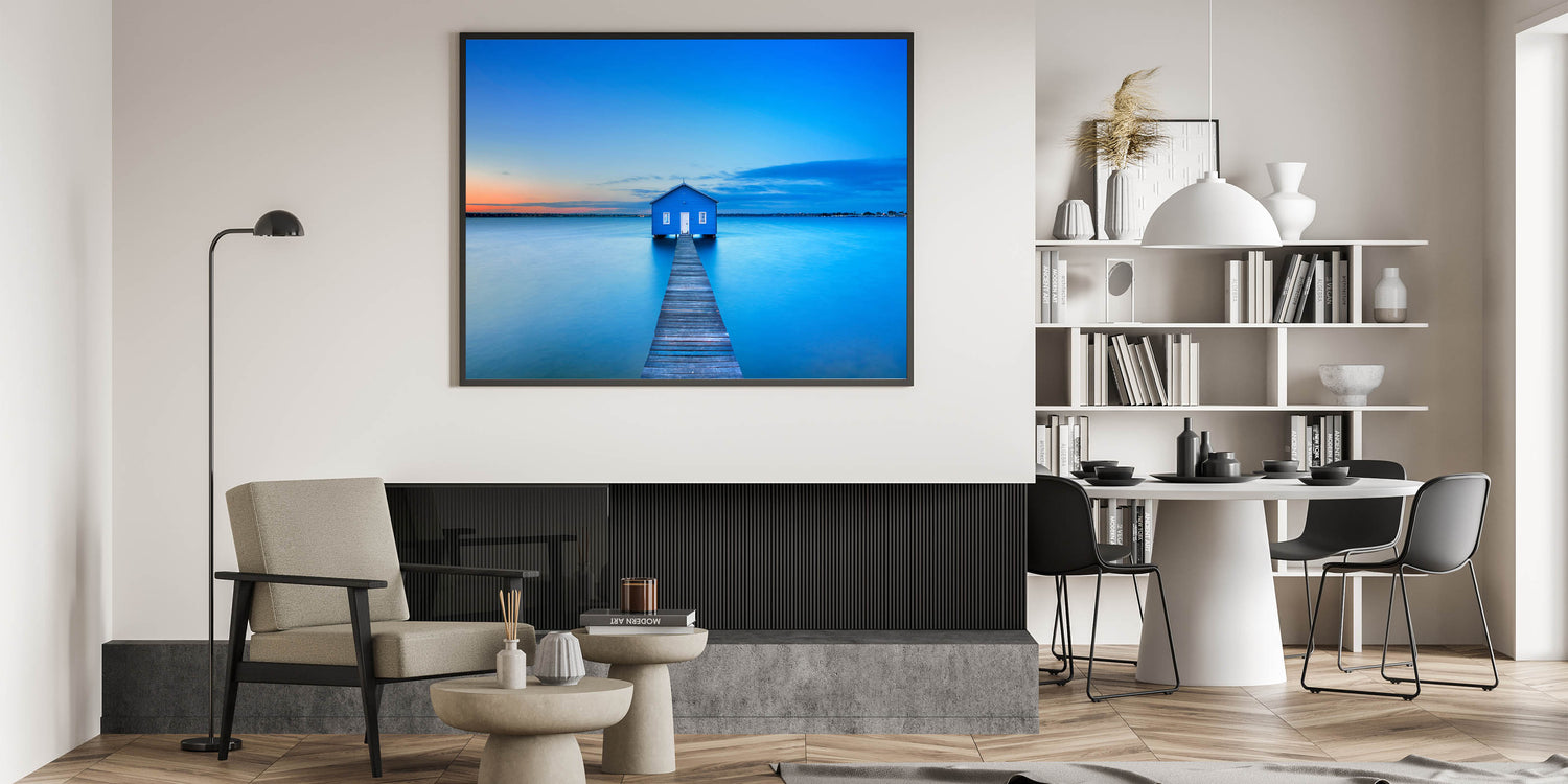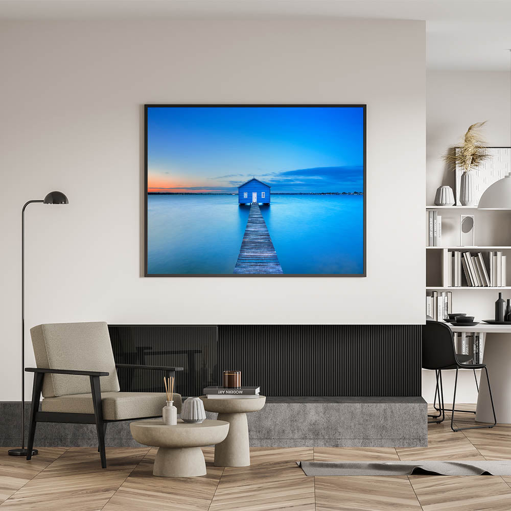Immerse yourself in the serene beauty of Perth with this Perth Wall Art, featuring the iconic Blue Boat House floating on the calm waters at sunset. The soft hues of the sky blend into the tranquil blue of the water, creating a peaceful and relaxing atmosphere that’s perfect for any space.