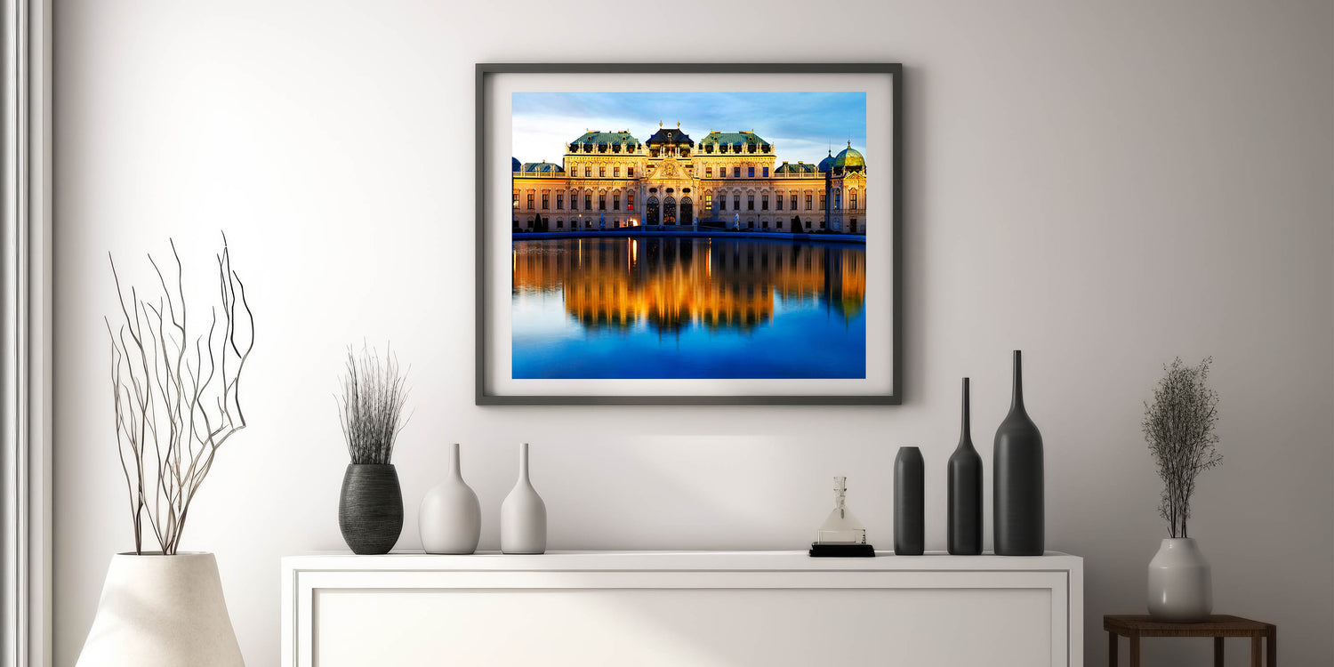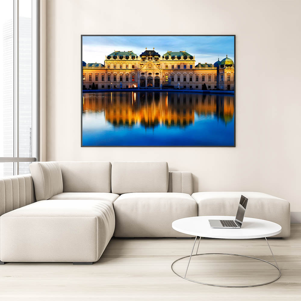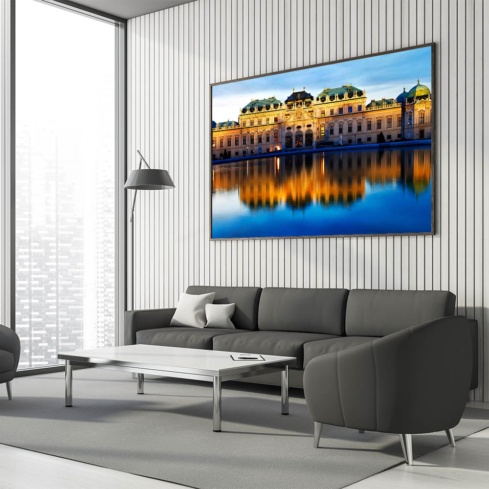 This stunning wall art captures the grandeur of the Belvedere Palace in Vienna, beautifully illuminated at dusk. The serene reflection of the palace on the still waters creates a mesmerizing scene that brings both history and elegance to any space. This Austria wall art is perfect for those who appreciate the beauty of architectural photography and the charm of Vienna’s historical landmarks. Available in multiple formats, including Stretched Canvas, Framed Canvas, and Acrylic Glass, this piece is ideal for adding a touch of Vienna wall decor to your home or office.