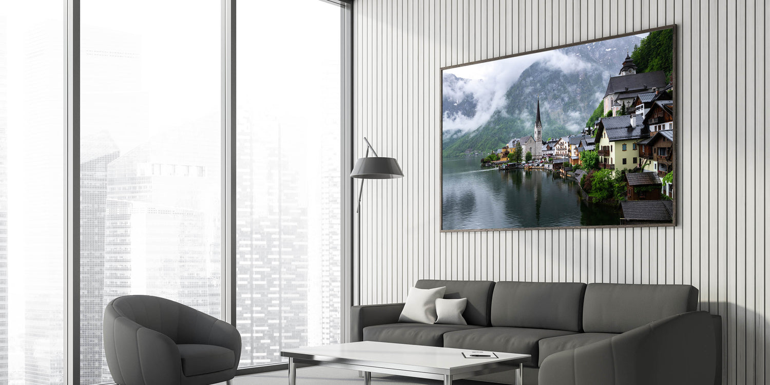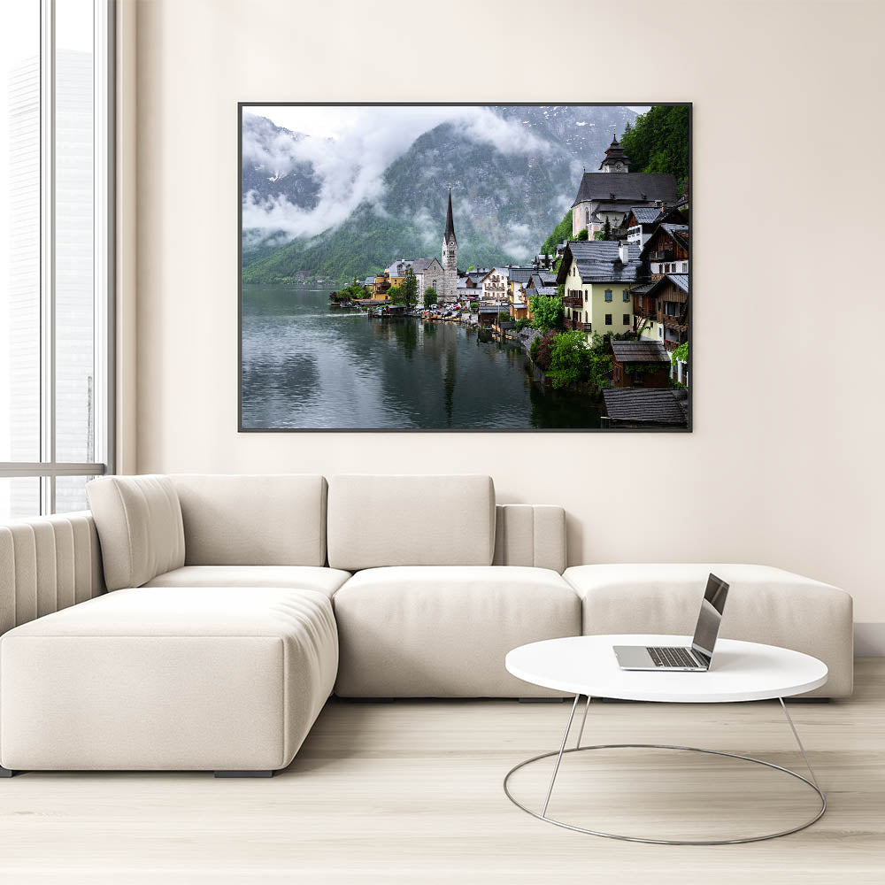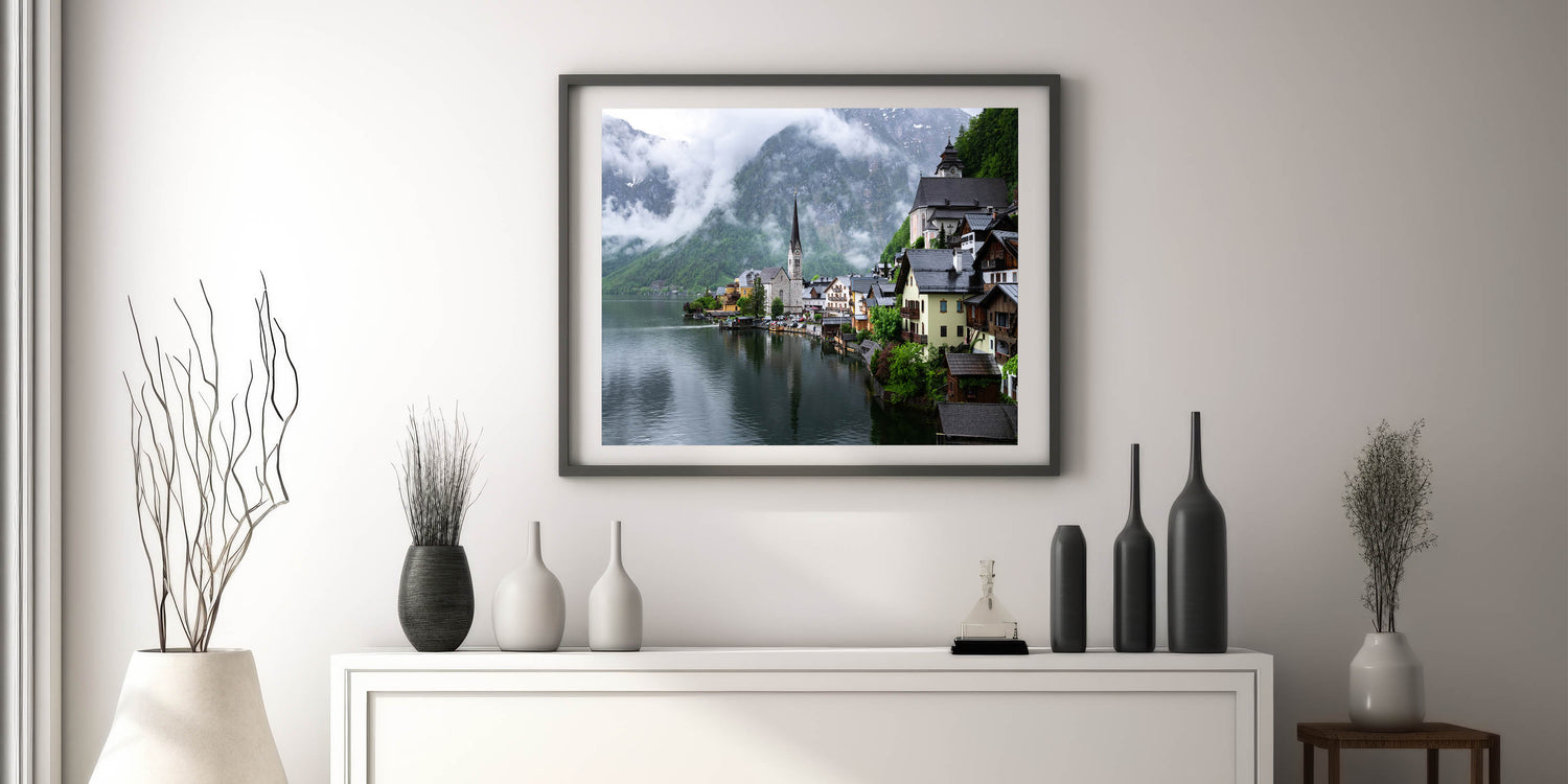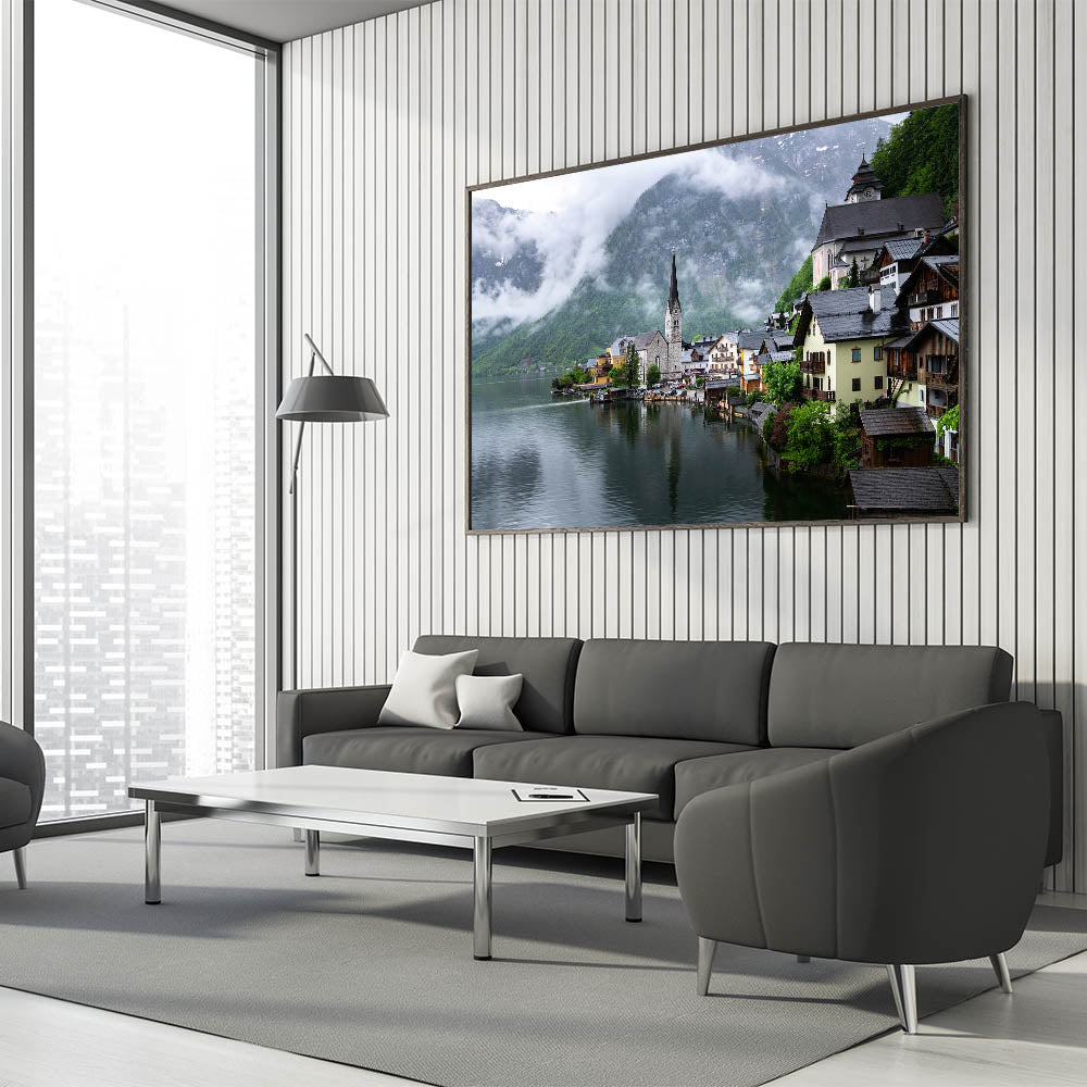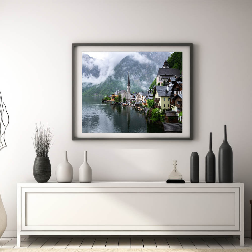 - Art Style: Austrian landscape photography featuring Hallstatt village in the mist