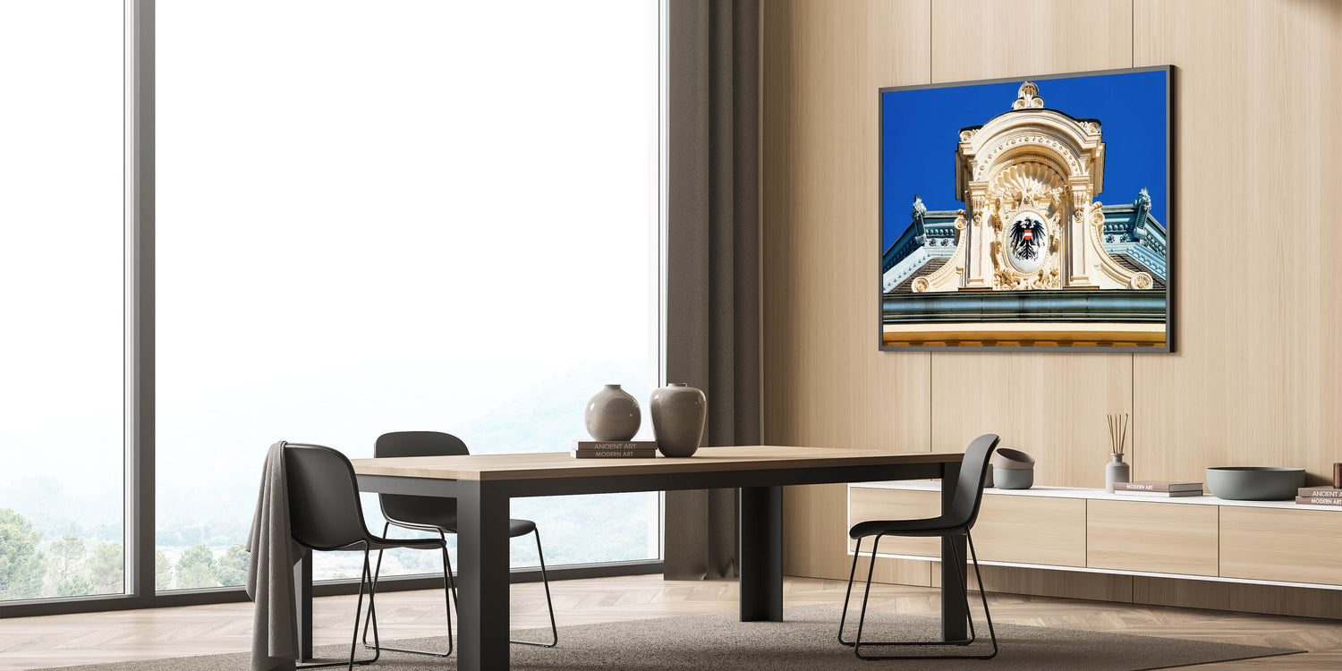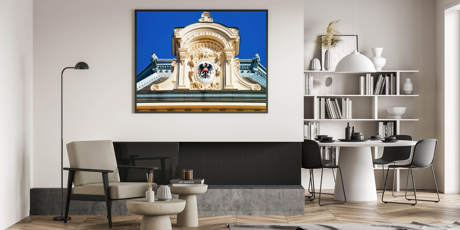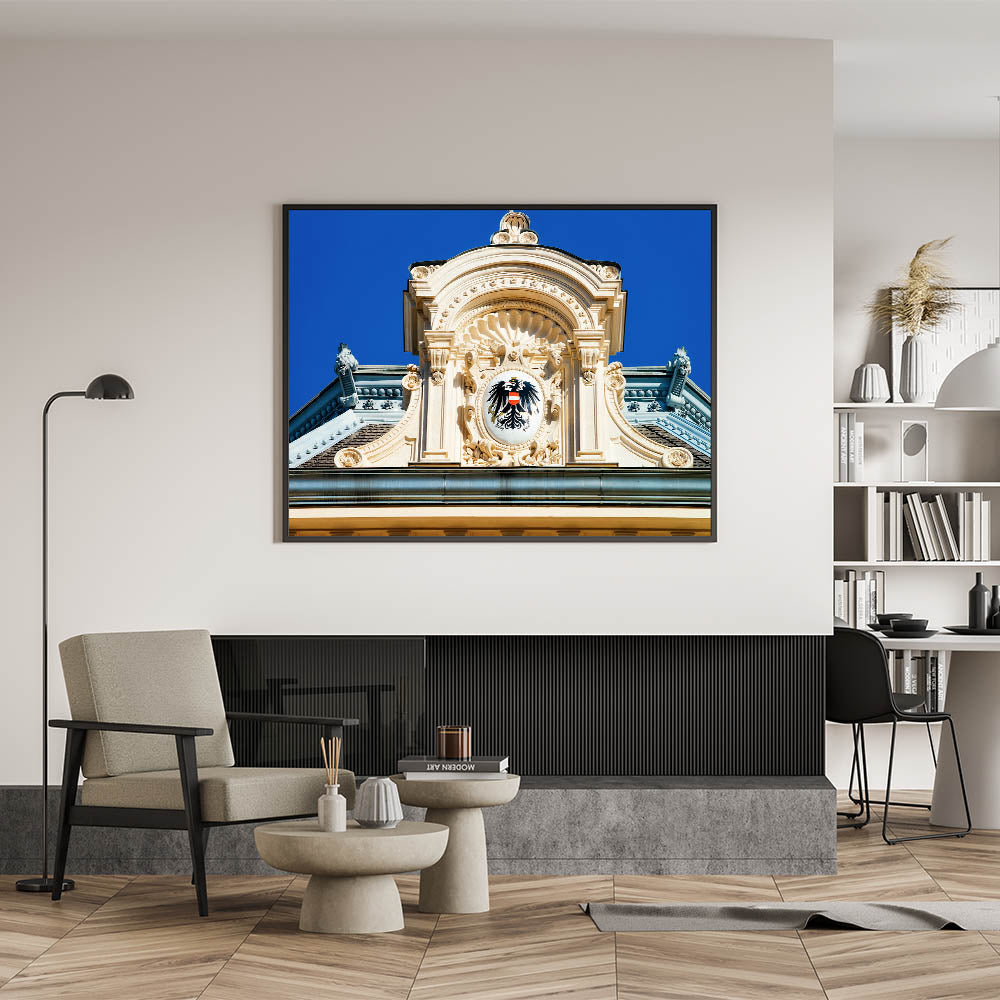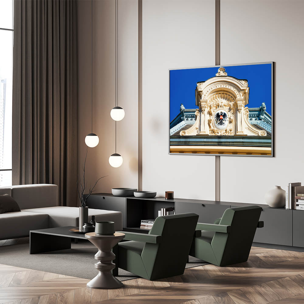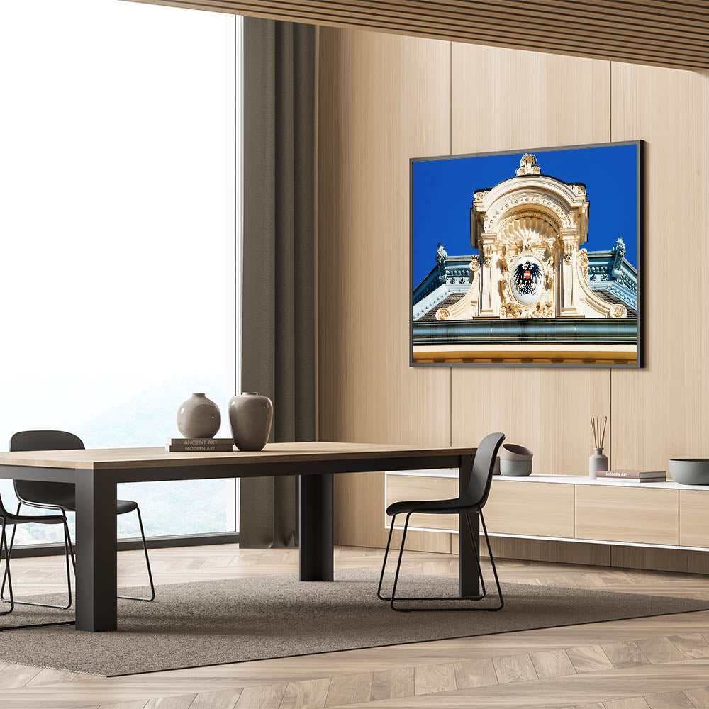 Immerse yourself in the grandeur of Austria’s architectural history with this beautiful Vienna wall decor piece. Featuring the intricate details of an imperial crest on a historic Viennese building, this Austria wall art perfectly captures the rich heritage of Austria’s capital. The stunning details, from the sculpted architecture to the vibrant blue sky, make this artwork a striking addition to your home or office.