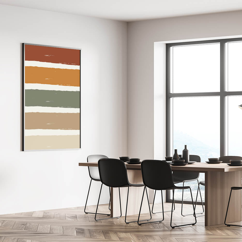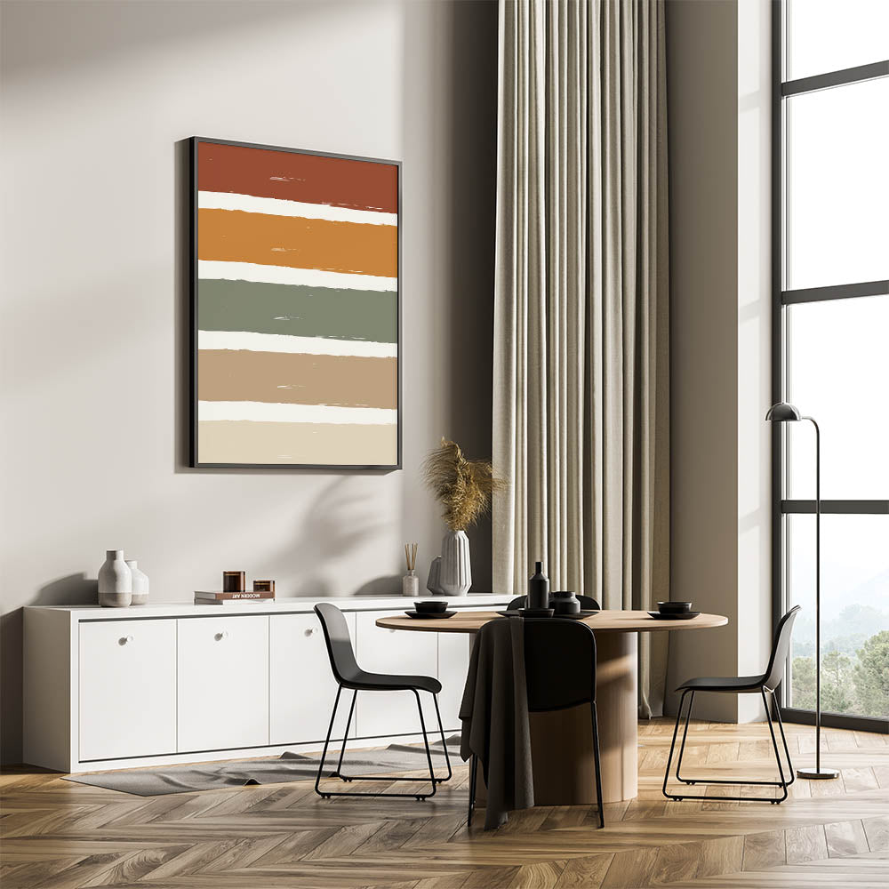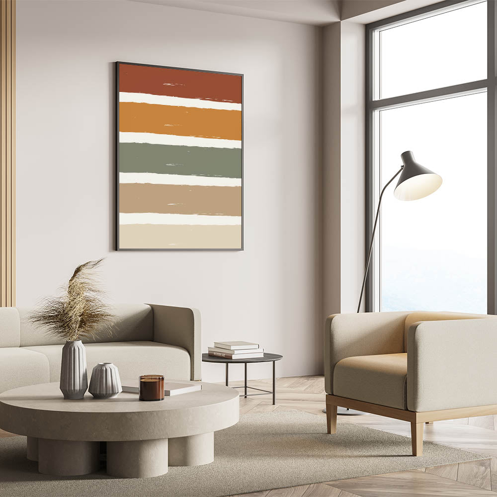 Infuse your space with the rich hues of autumn with this Abstract Fall Color Palette Wall Art. Featuring horizontal brushstroke-style stripes in warm earthy tones, this modern abstract piece captures the essence of fall foliage and seasonal charm. With shades of burnt orange, olive green, beige, and brown, this artwork blends effortlessly into a rustic, farmhouse, or modern decor style.