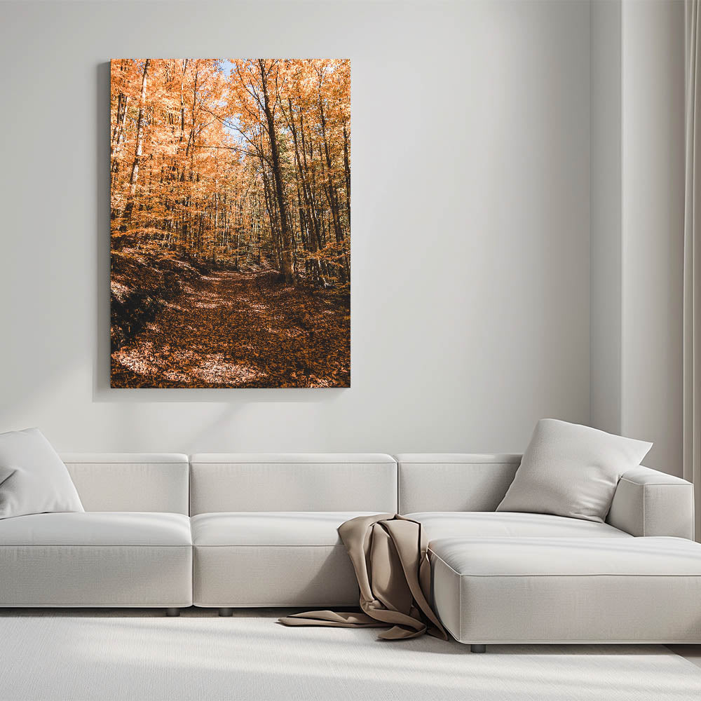 Step into the heart of autumn with this enchanting fall wall art, capturing a scenic forest path blanketed in golden leaves. The warm hues of orange, brown, and gold create a cozy atmosphere, making this autumn canvas art a perfect addition to any rustic or nature-inspired decor. Sunlight filters through the canopy, highlighting the intricate textures of the foliage and the soft shadows on the path below.
