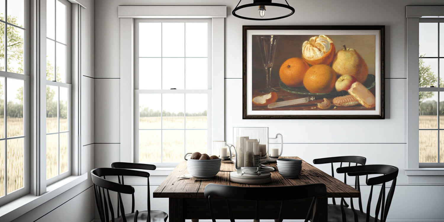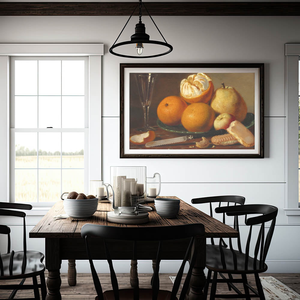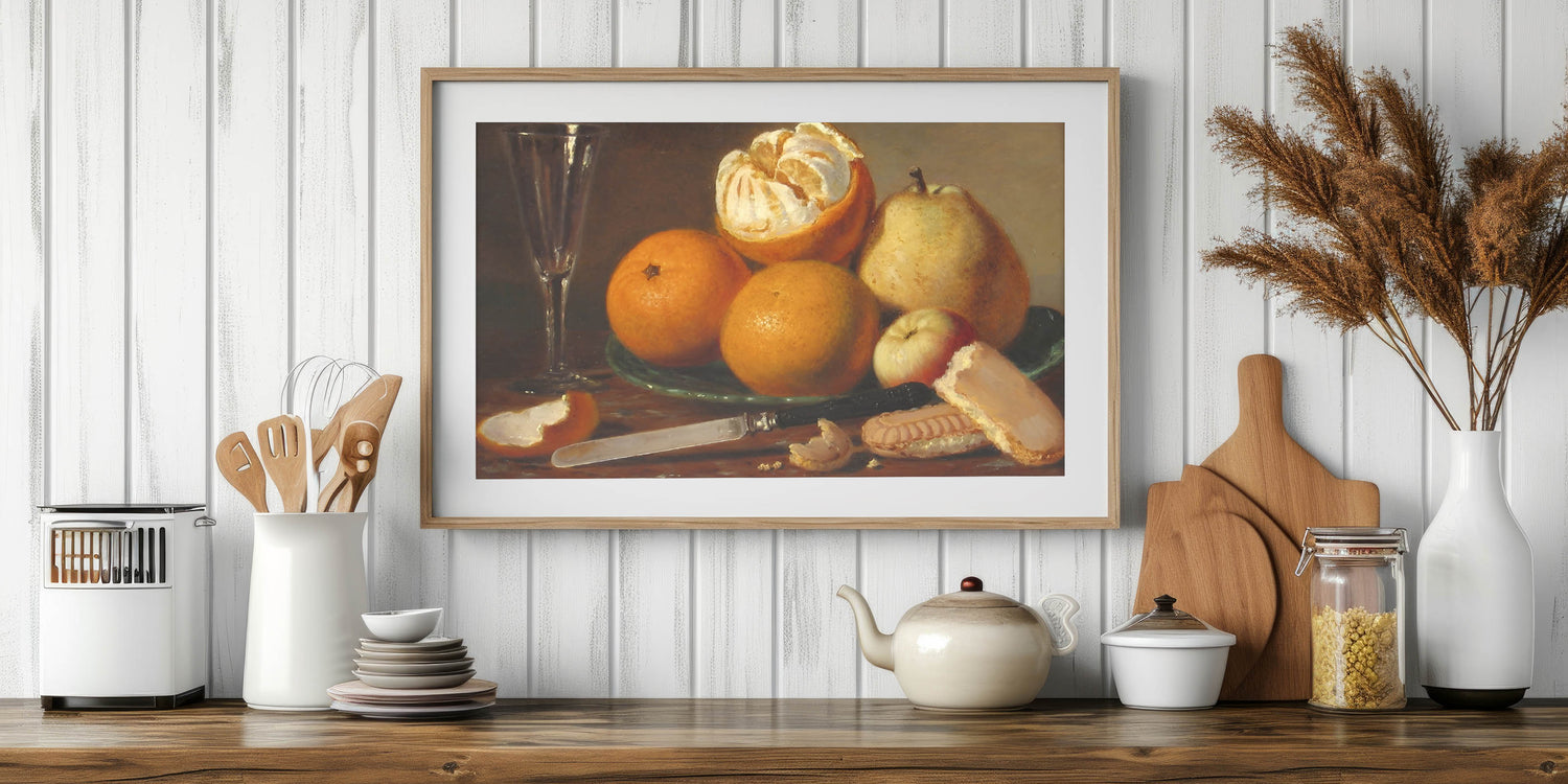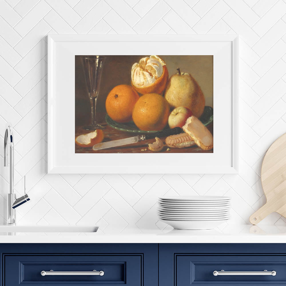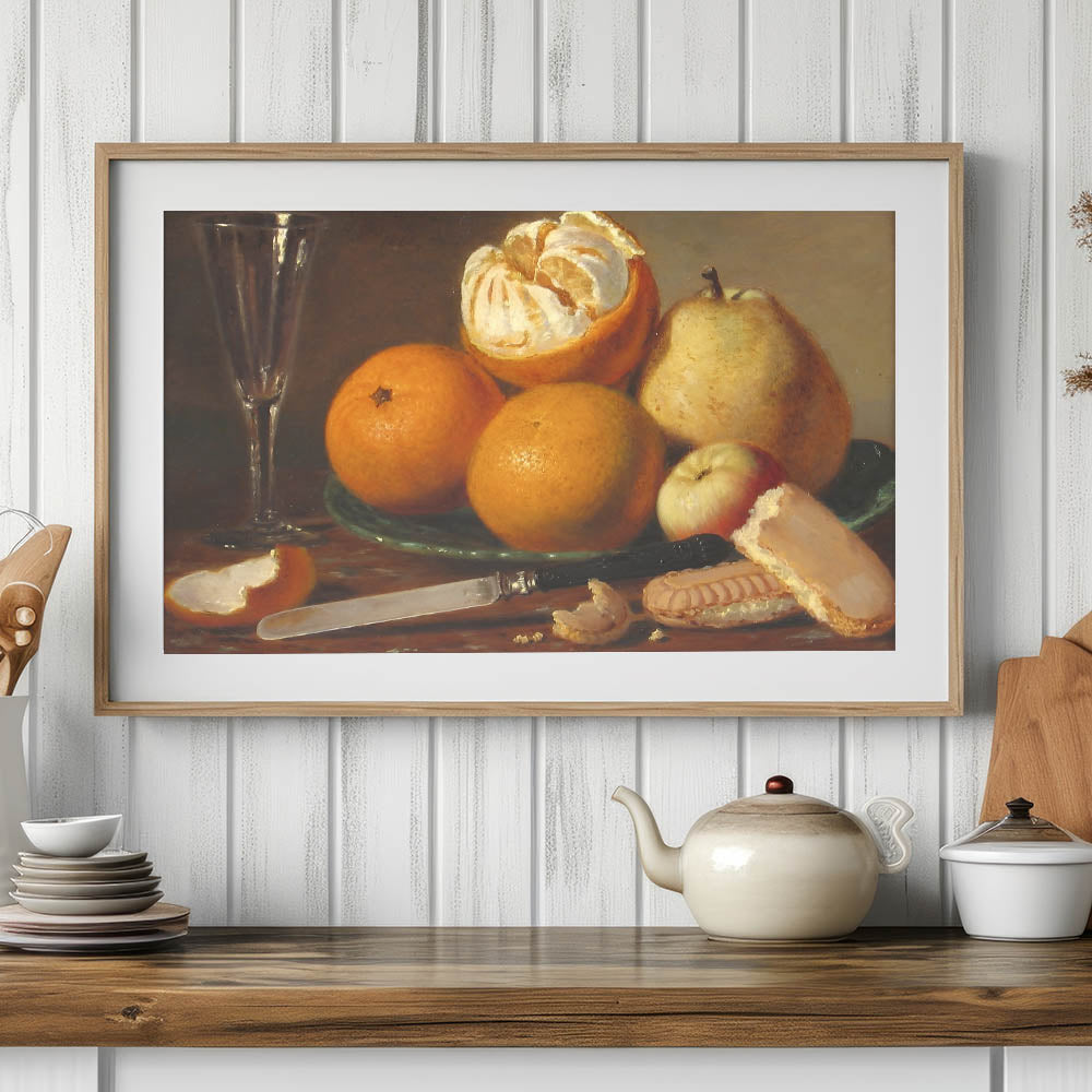 Enhance your space with this classic fruit still life Fruits Wall Art, featuring a beautifully detailed composition of oranges, a pear, and an apple arranged with a glass and pastries. The rich, warm tones and masterful realism make this Fruit Art Print a timeless addition to any home, kitchen, or dining area. Perfect for those who appreciate elegant, traditional aesthetics, this Kitchen Fruit Decor piece captures the beauty of everyday life in exquisite detail.