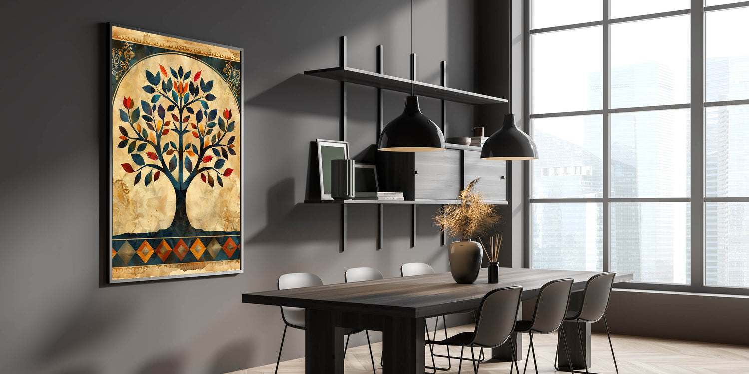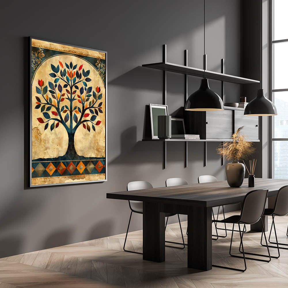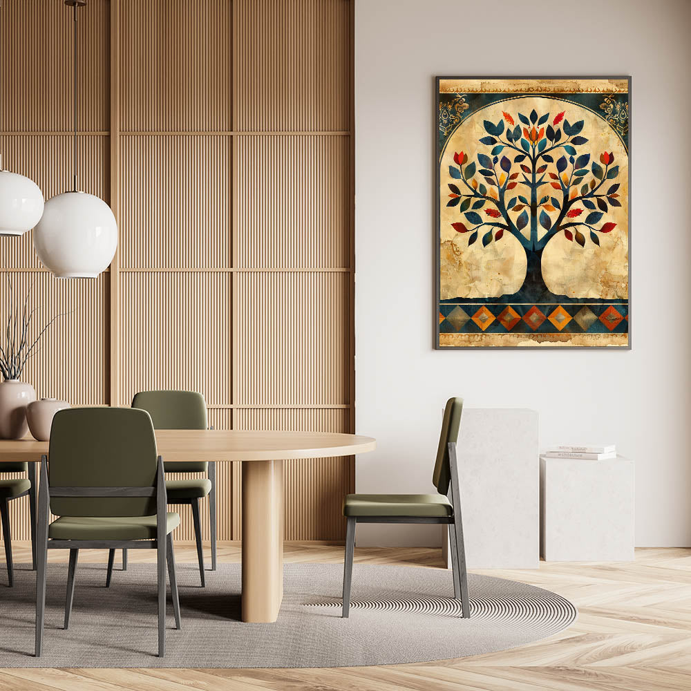 Bring warmth and sophistication to your dining space with this elegant dining room wall art, featuring a striking Tree of Life design. The intricate details and rich color palette of deep blues, warm oranges, and earthy beige create a timeless masterpiece, blending traditional and contemporary aesthetics effortlessly. This framed dining room print adds depth and charm, making it a perfect centerpiece for your dining area.