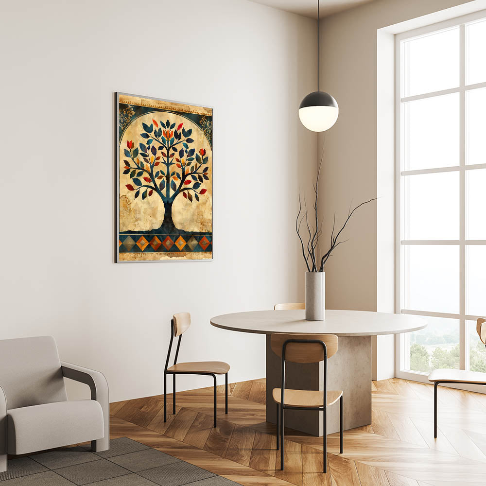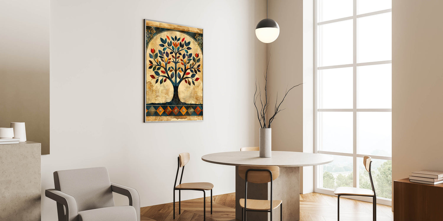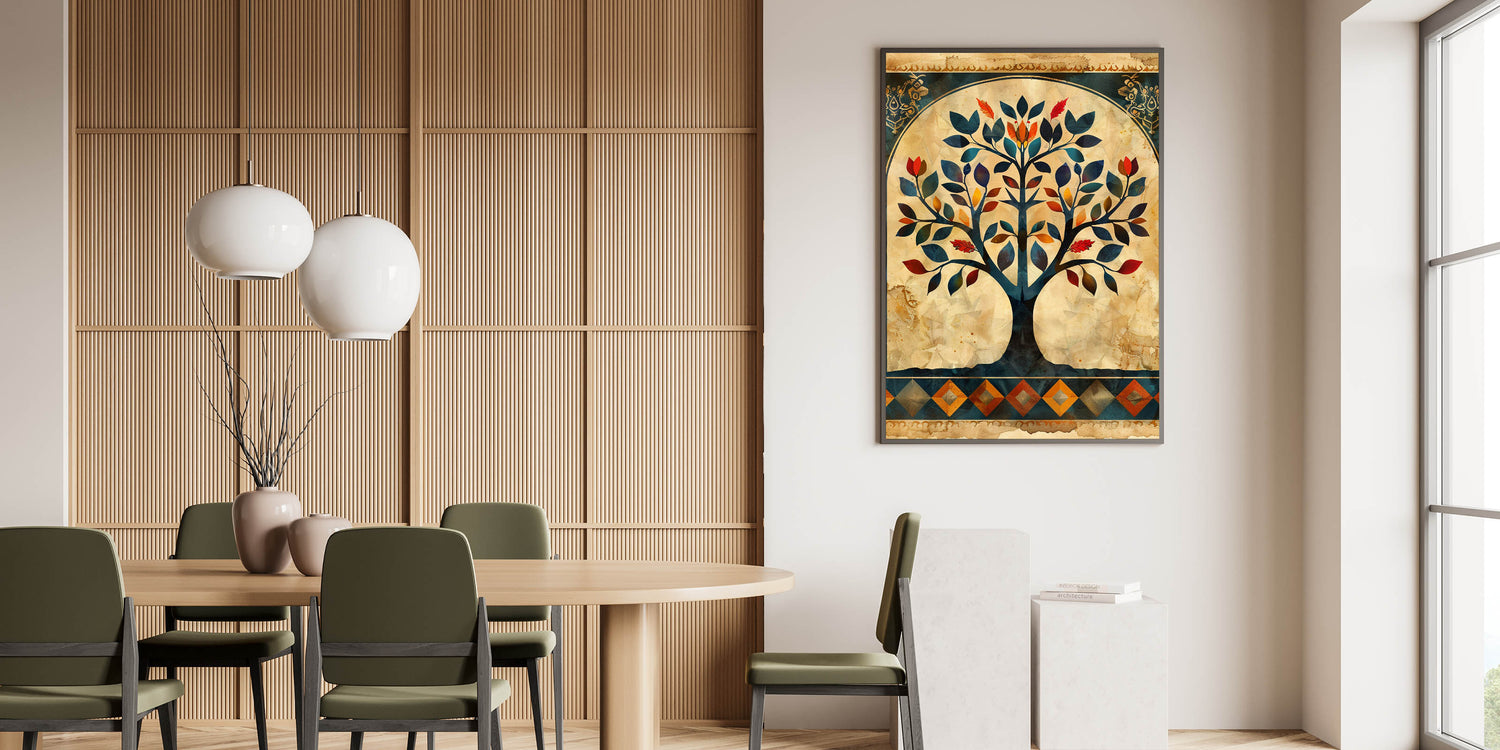 Bring warmth and sophistication to your dining space with this elegant dining room wall art, featuring a striking Tree of Life design. The intricate details and rich color palette of deep blues, warm oranges, and earthy beige create a timeless masterpiece, blending traditional and contemporary aesthetics effortlessly. This framed dining room print adds depth and charm, making it a perfect centerpiece for your dining area.