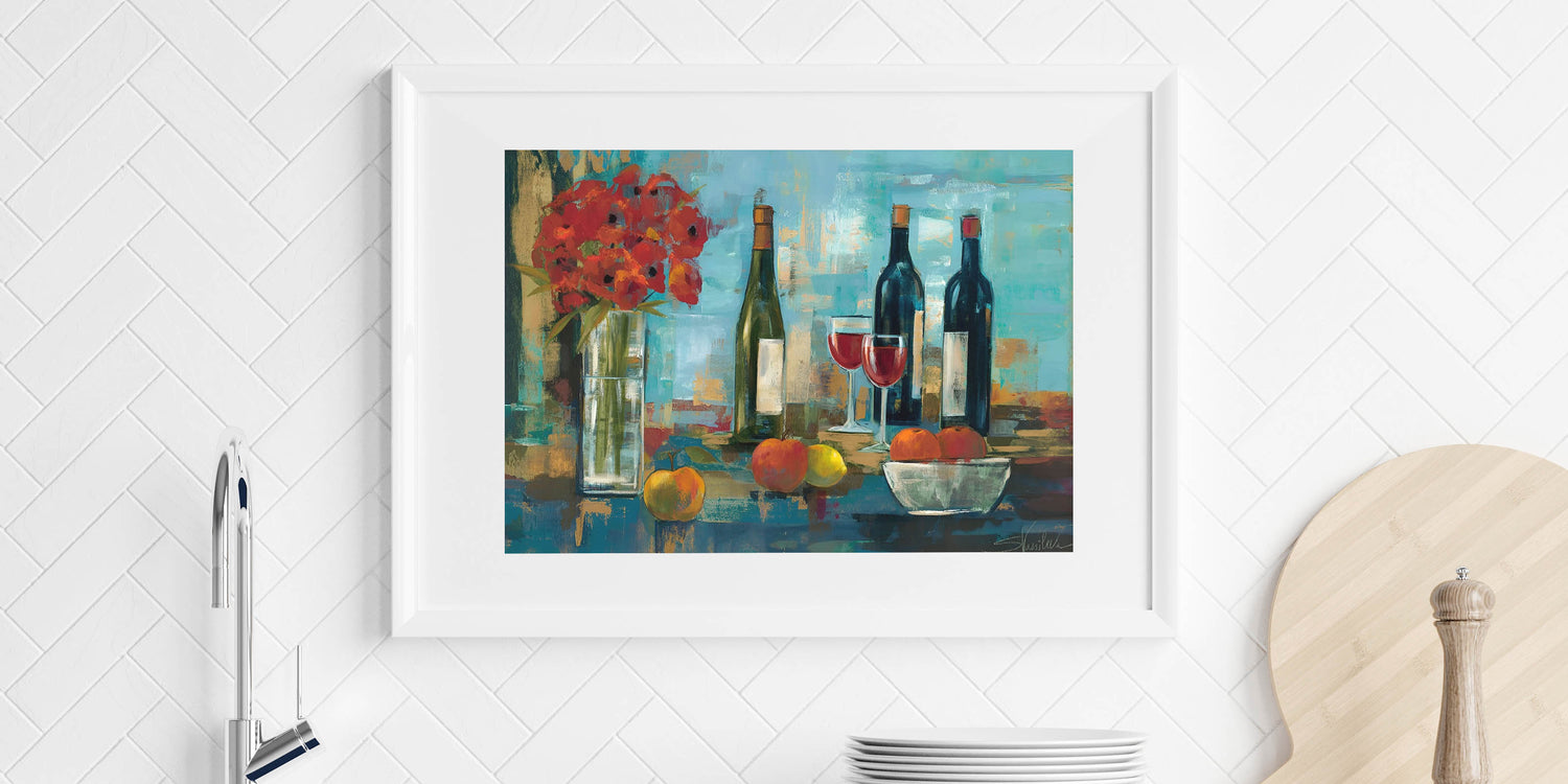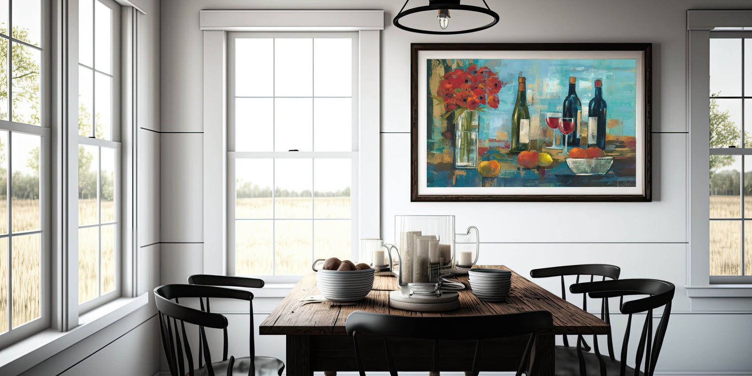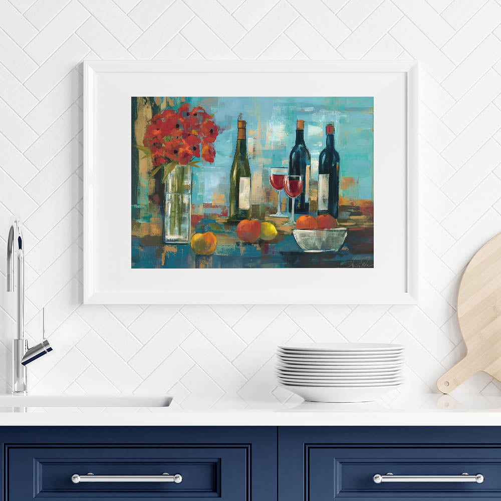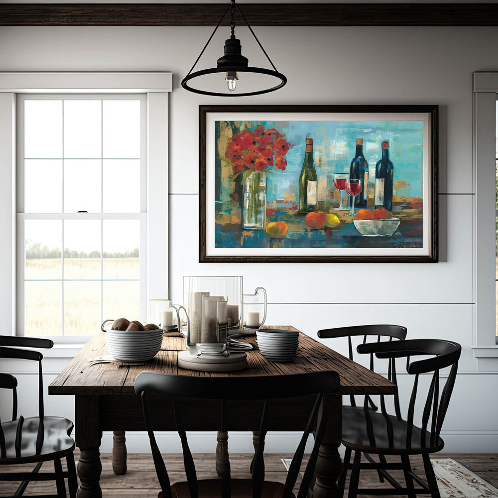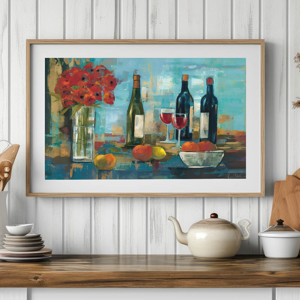 Enhance your dining room or wine bar with this stunning wine-themed wall art, featuring an artistic still life of red wine bottles, glasses, fresh fruit, and a vase of vibrant red flowers. The bold blue and gold tones create a modern yet rustic feel, making this beverage wall art a perfect focal point for kitchens, bars, and dining spaces.