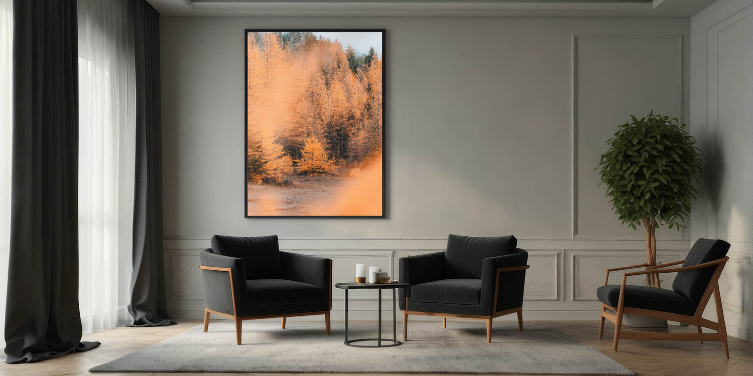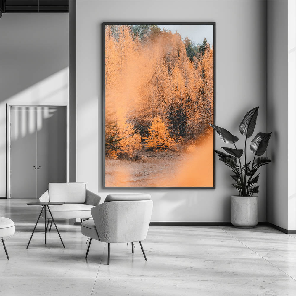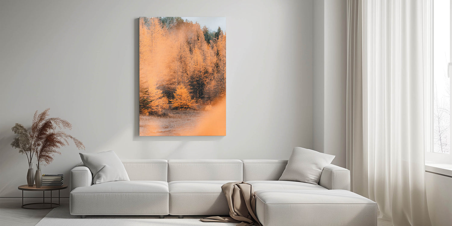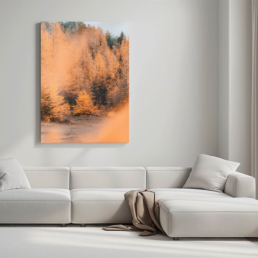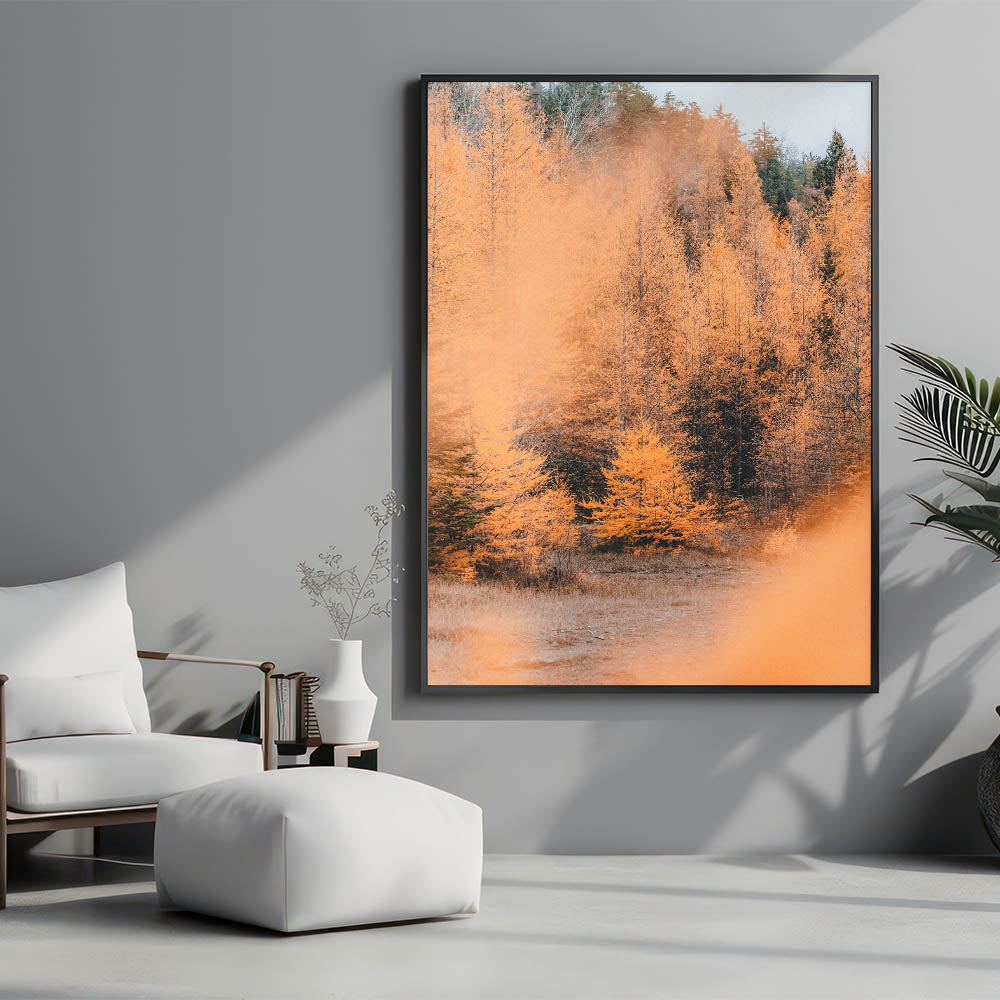 Step into the beauty of autumn with this mesmerizing fall wall art, featuring a radiant golden forest bathed in soft seasonal light. The contrast of burnt orange, deep forest green, and warm beige creates a breathtaking landscape, capturing the essence of autumn canvas art. The misty ambiance and intricate details of the trees make this piece a stunning focal point for any space.