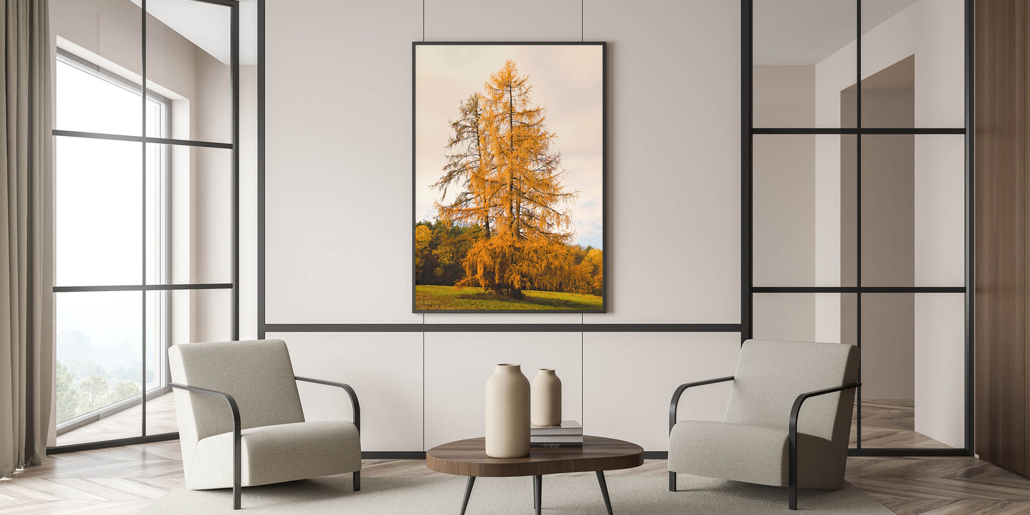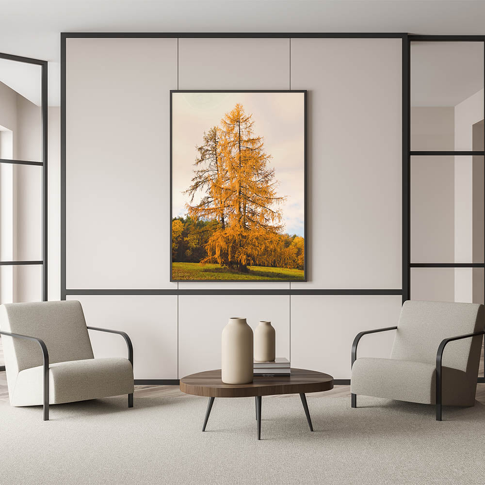 Immerse yourself in the beauty of autumn with this striking fall wall art, featuring a majestic golden tree standing tall in a peaceful meadow. The warm hues of the foliage contrast beautifully with the soft sky and lush greenery, making this autumn canvas art a perfect addition to any nature-inspired space. This artwork captures the essence of fall’s tranquility and rustic charm.