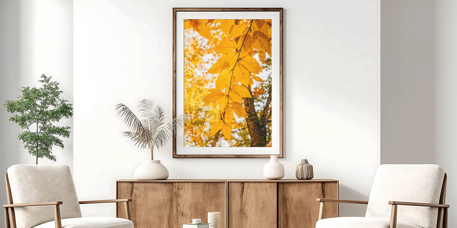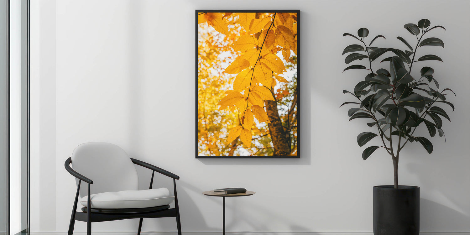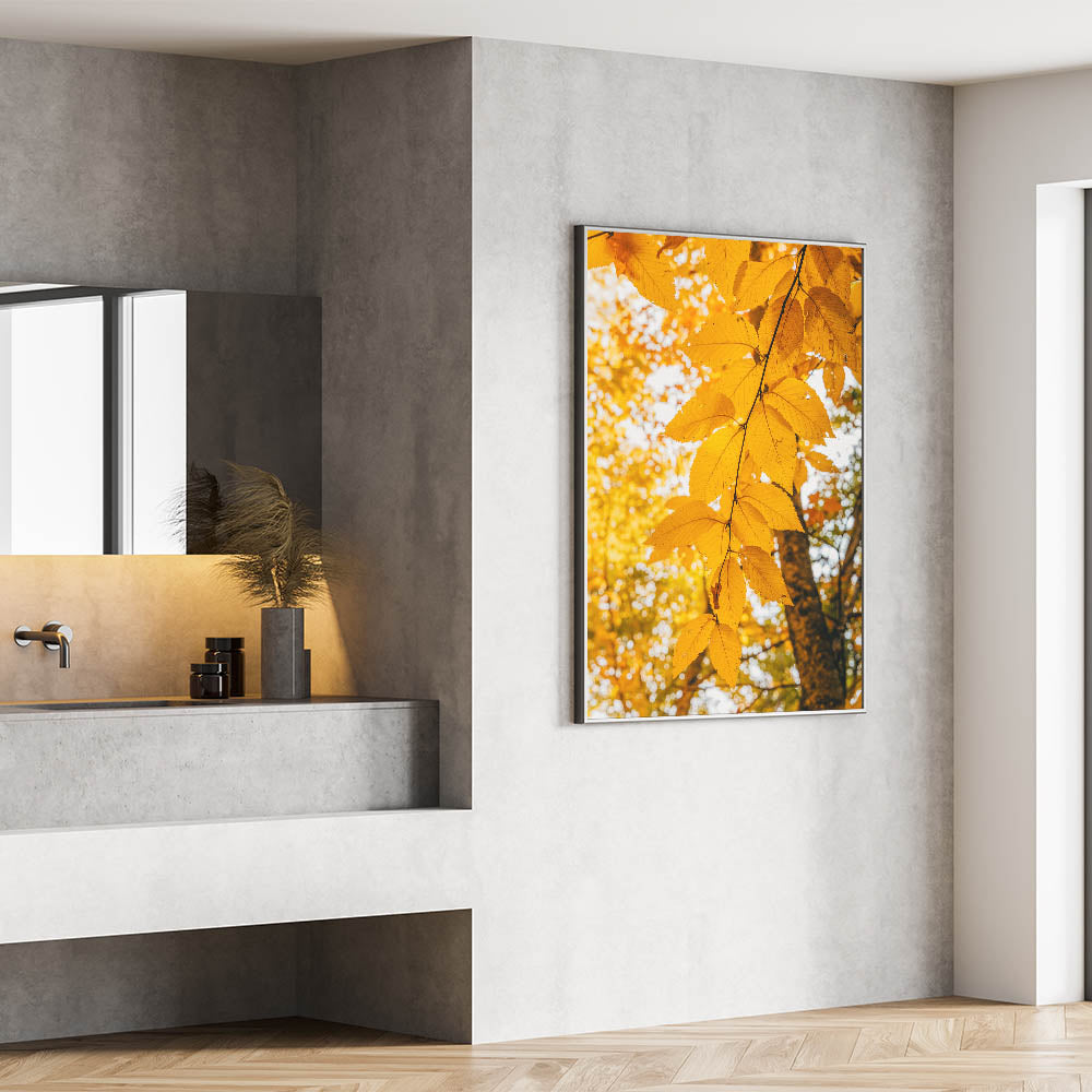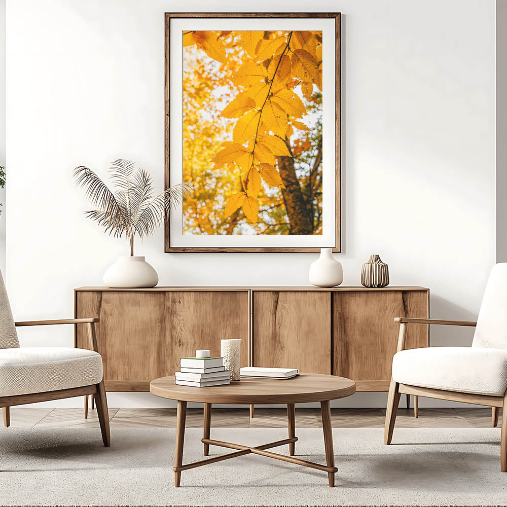 Golden Yellow Leaves in Sunlight – Fall Wall Art for Cozy Decor