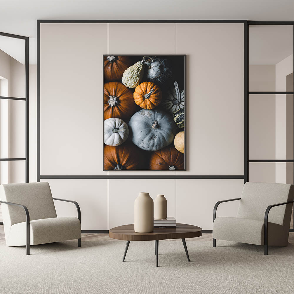 Celebrate the richness of fall with this Harvest Pumpkin Collection Fall Wall Art, a stunning close-up of textured pumpkins and gourds in earthy autumn tones. Featuring deep orange, soft gray, creamy white, and muted green hues, this artwork embodies the warmth and charm of harvest season and cozy farmhouse decor.
