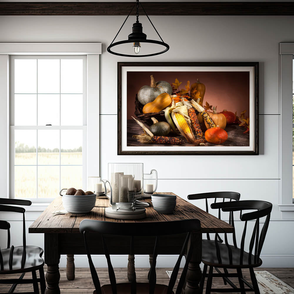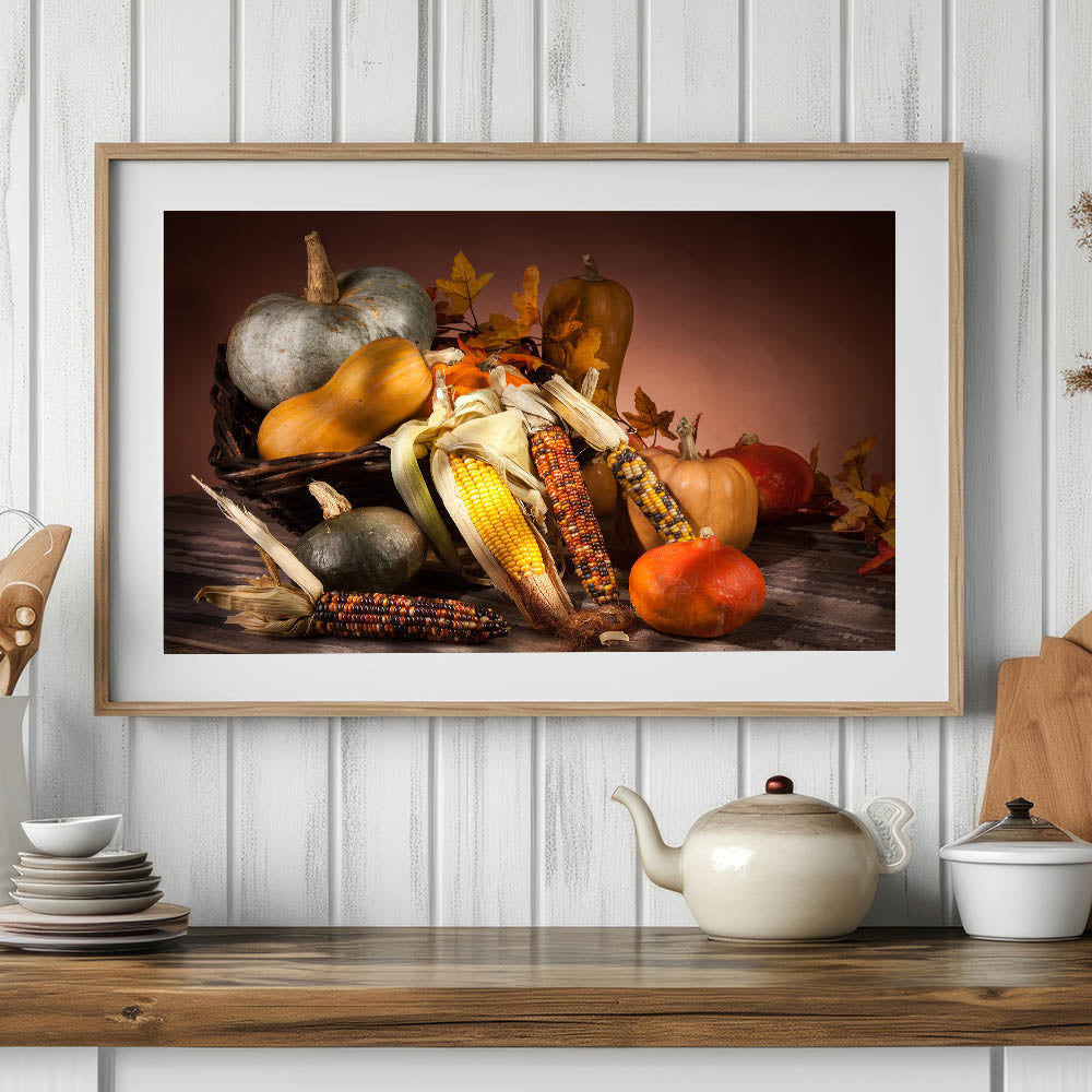 Celebrate the beauty of autumn with this harvest season kitchen art, featuring a rustic arrangement of pumpkins, Indian corn, and dried husks in warm, earthy tones. The deep browns, golden yellows, and burnt oranges create a cozy ambiance, making this the perfect addition to your kitchen wall decor.