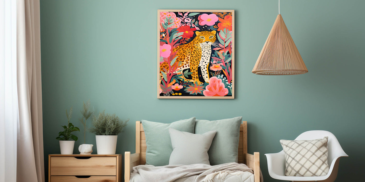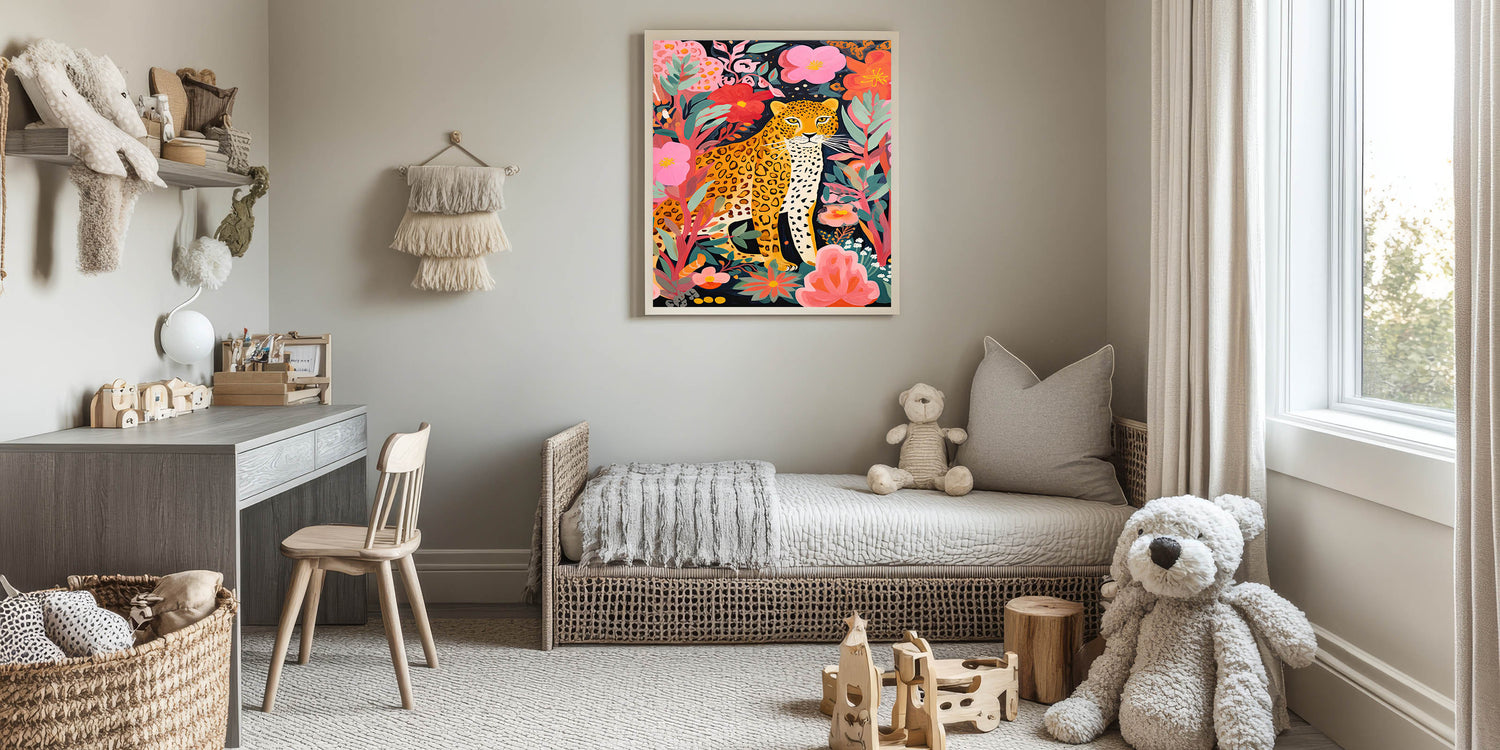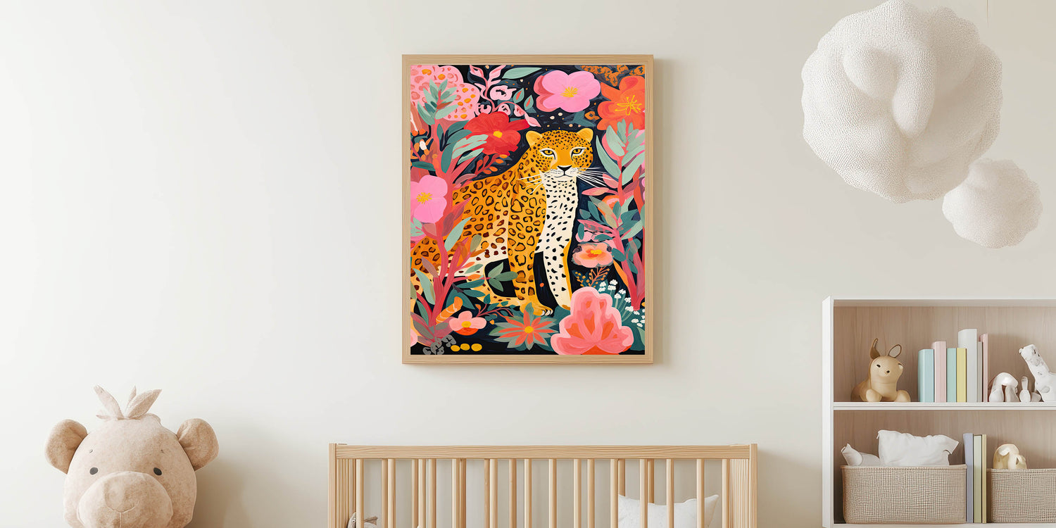Bring the wild beauty of the jungle into your child’s space with this kids room wall art, featuring a stunning leopard surrounded by vibrant floral elements. This children’s wall art print is a perfect blend of adventure and nature, making it ideal for nurseries, playrooms, and bedrooms.