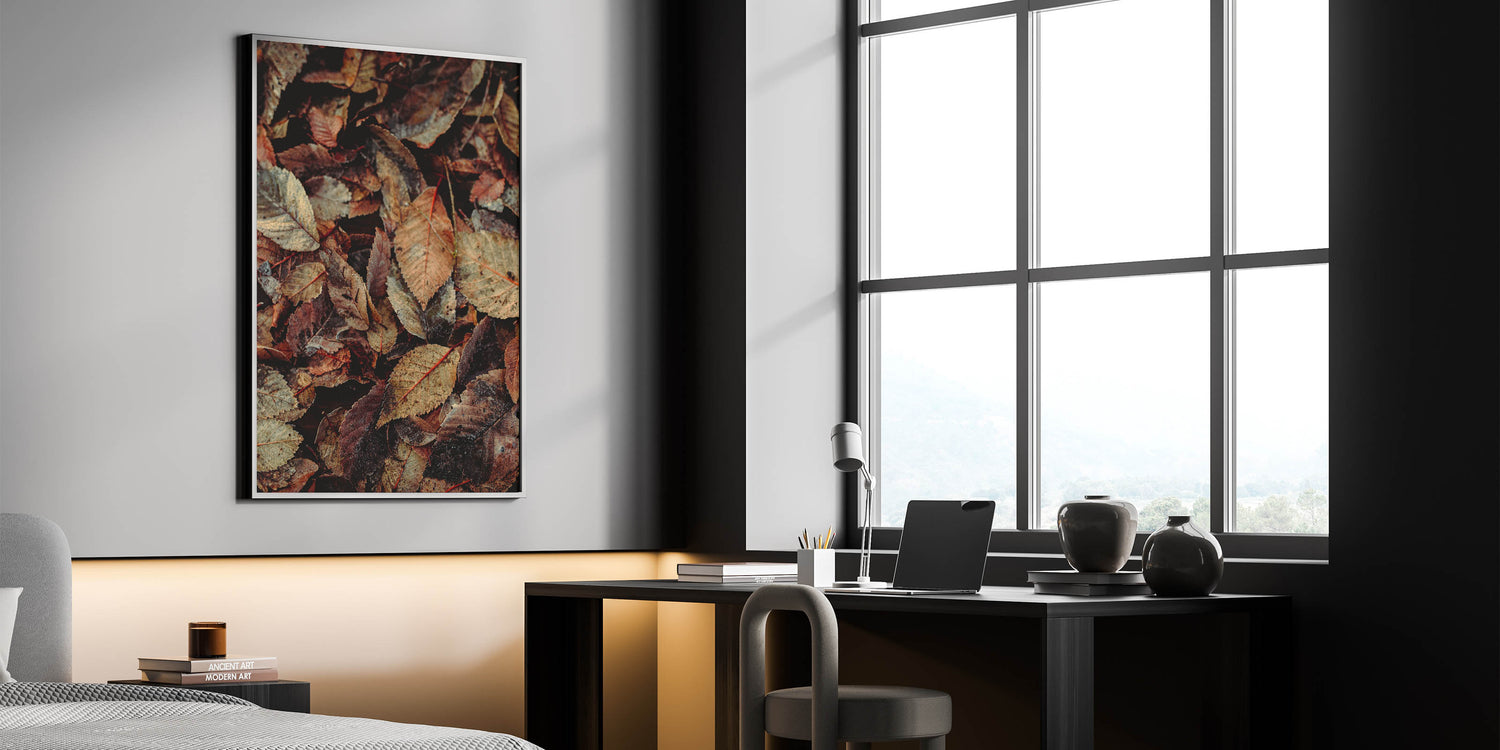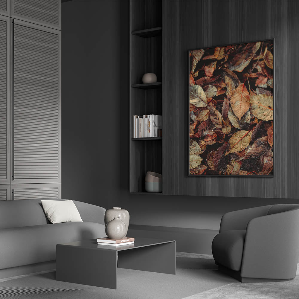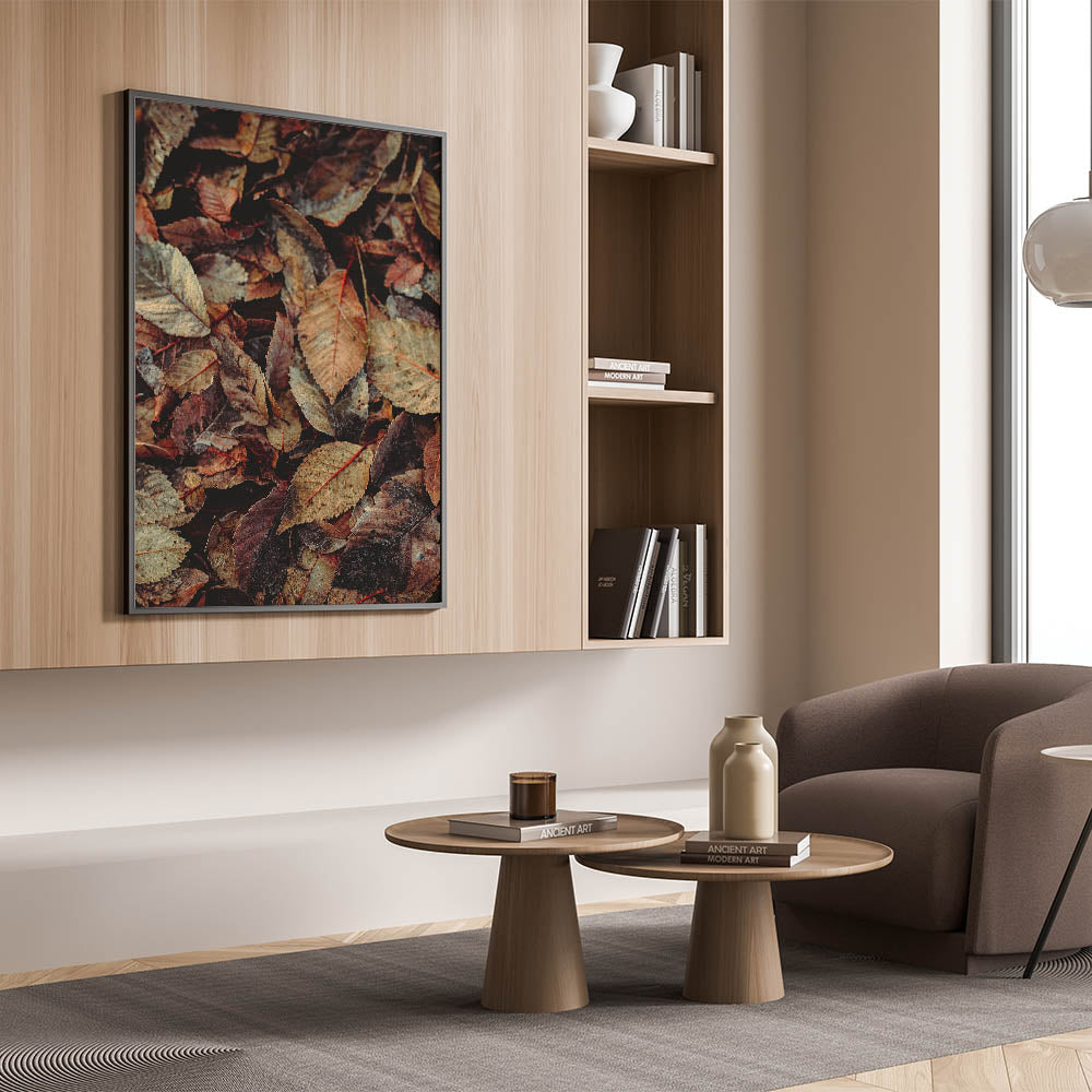 Immerse yourself in the beauty of fall with this fall wall art featuring a stunning close-up of rustic autumn leaves. The intricate details of the crisp, weathered foliage in rich shades of brown, beige, and muted red capture the essence of the season. This autumn wall art is a perfect addition to rustic, farmhouse, or nature-inspired interiors, bringing warmth and texture to any space.