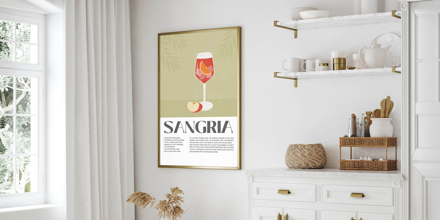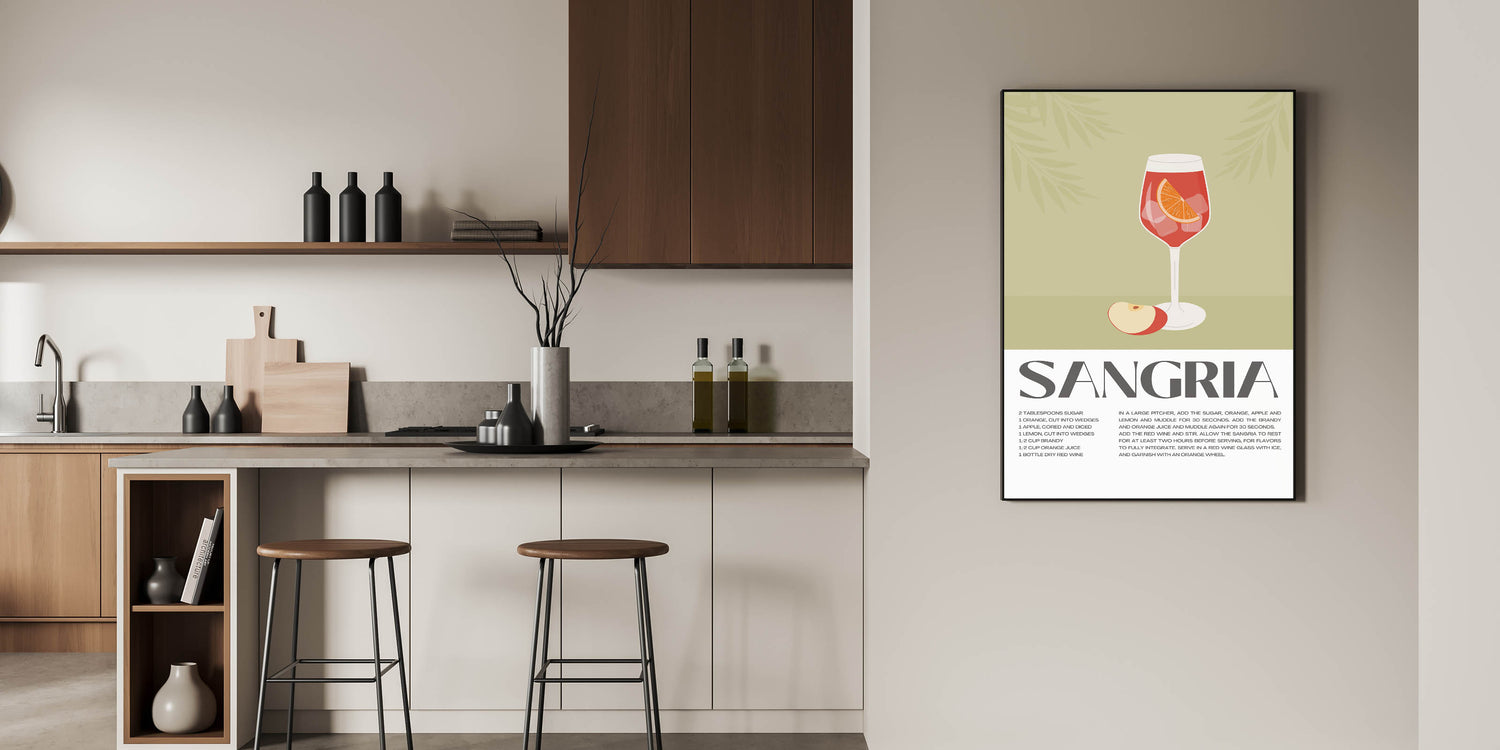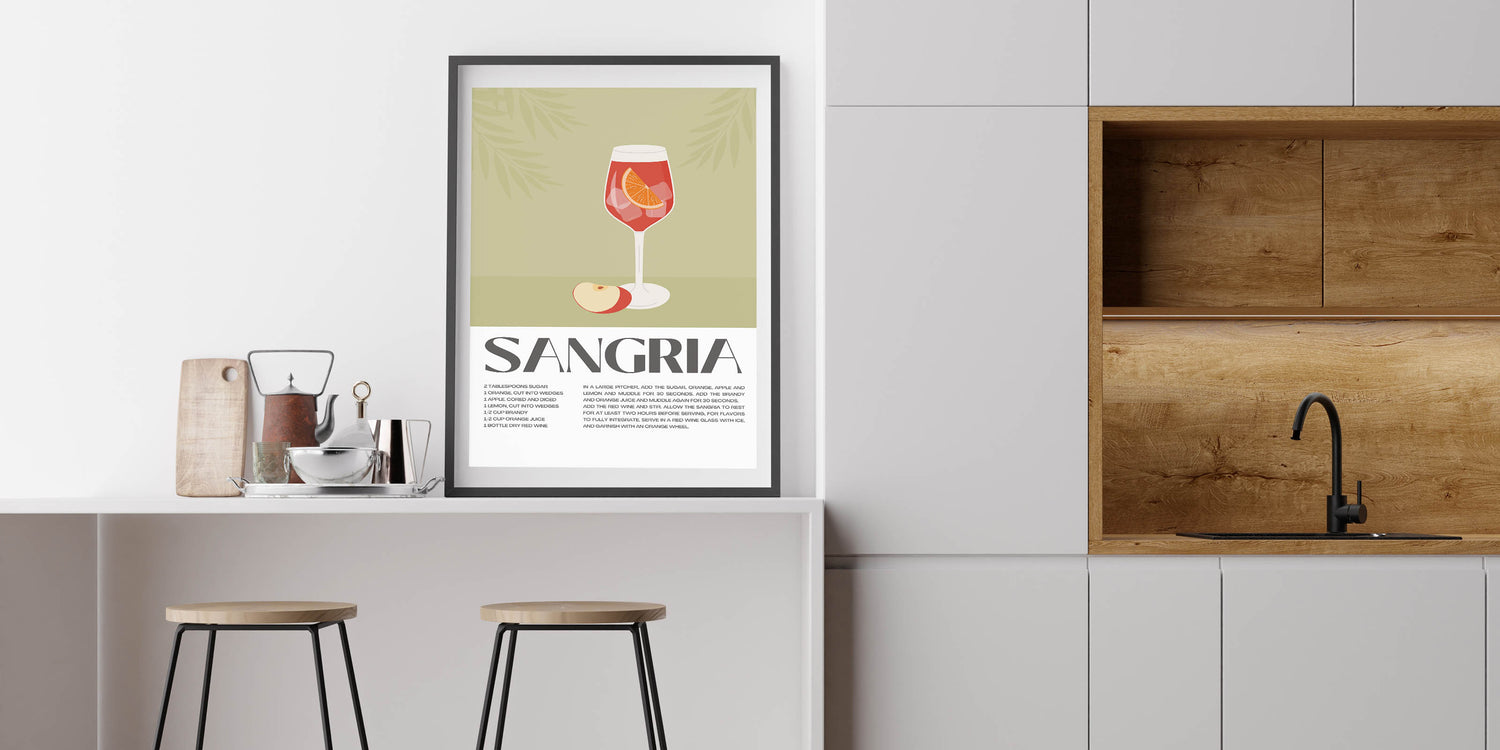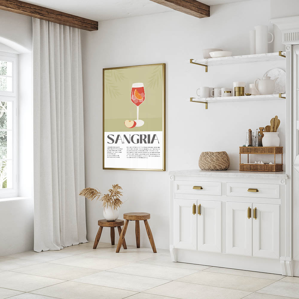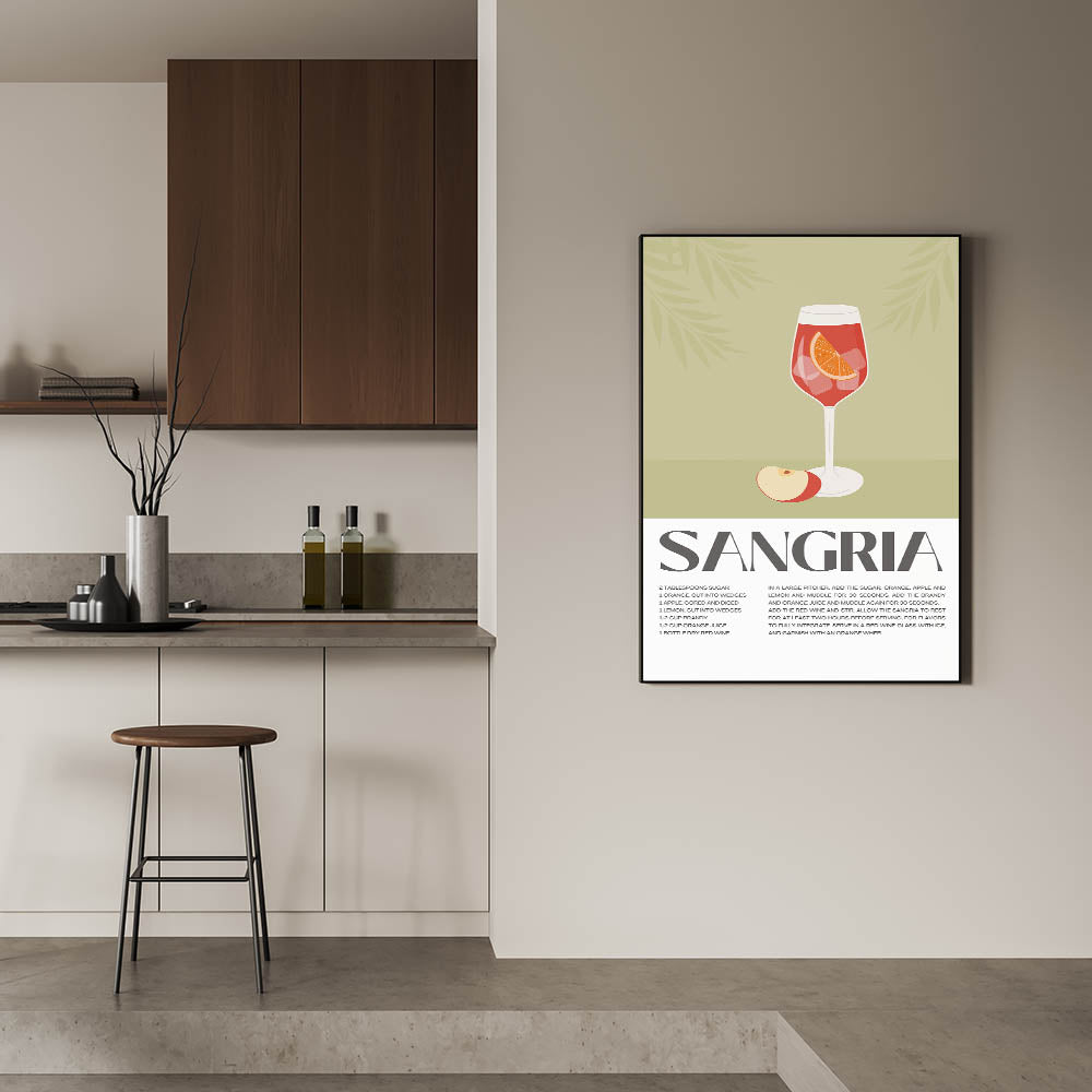 Add a splash of Mediterranean charm to your space with this Sangria Cocktail Wall Art. Featuring a beautifully illustrated sangria glass filled with rich red wine, ice cubes, and an orange slice garnish, this drink-themed art print is perfect for bar decor, kitchen wall decor, or a lively dining space. The soft olive-green background and stylish typography make this wine art decor a sophisticated and refreshing addition to any interior.