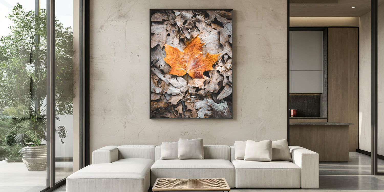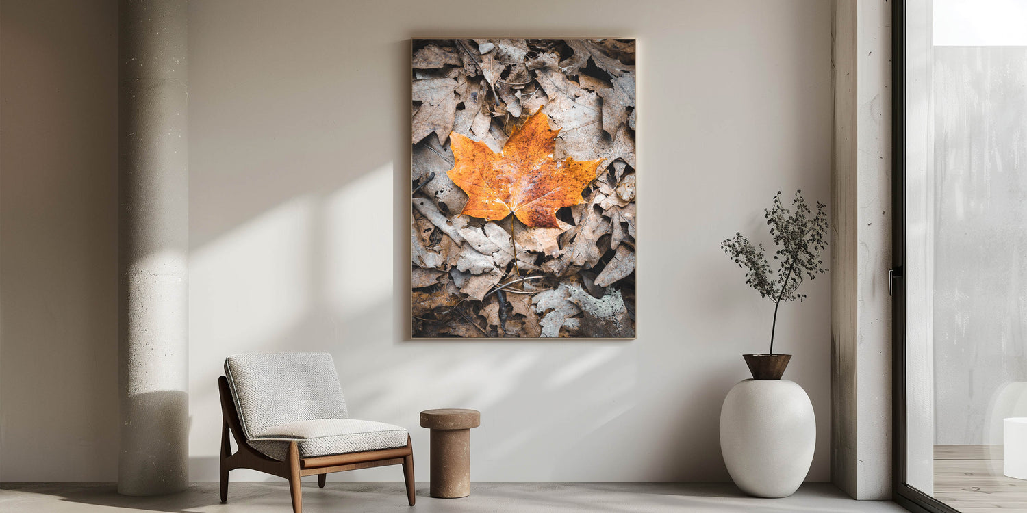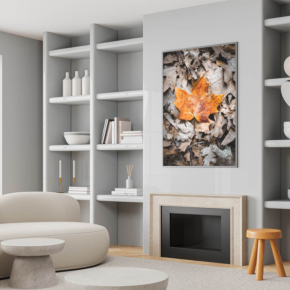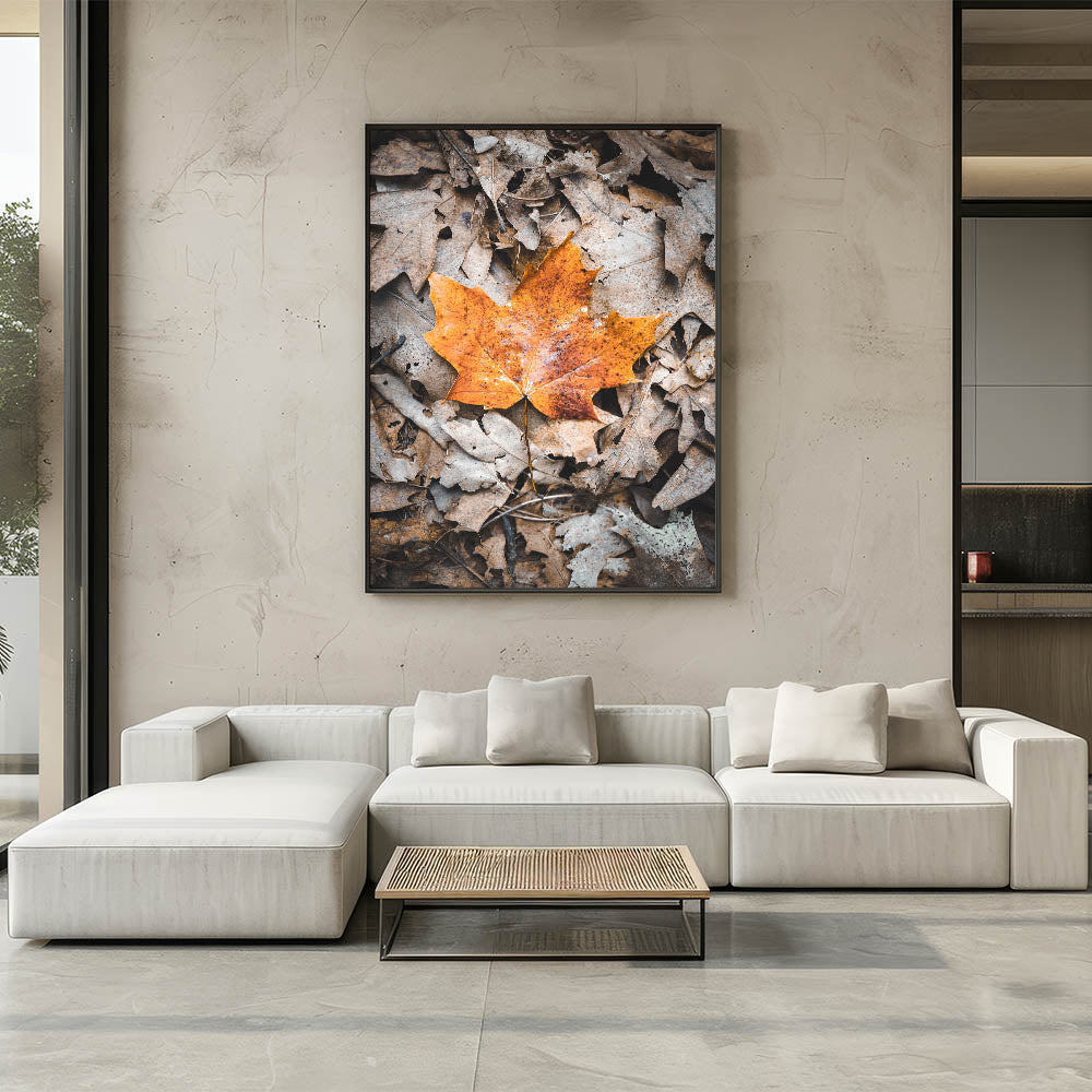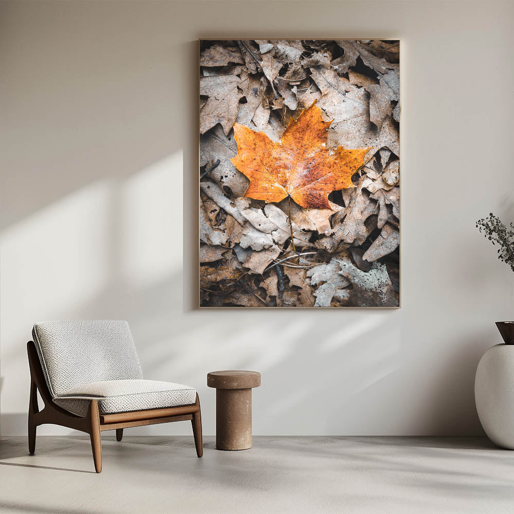 Embrace the beauty of autumn with this captivating fall wall art, featuring a single golden-orange maple leaf resting among dried foliage on the forest floor. The rich textures and earthy tones create a rustic yet elegant aesthetic, making this autumn canvas art a perfect addition to any nature-inspired space. This artwork captures the essence of the season—where each fallen leaf tells a story of change and renewal.