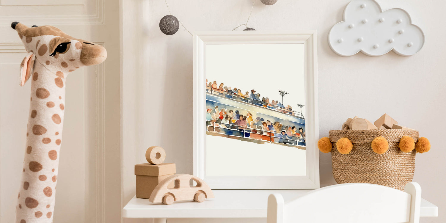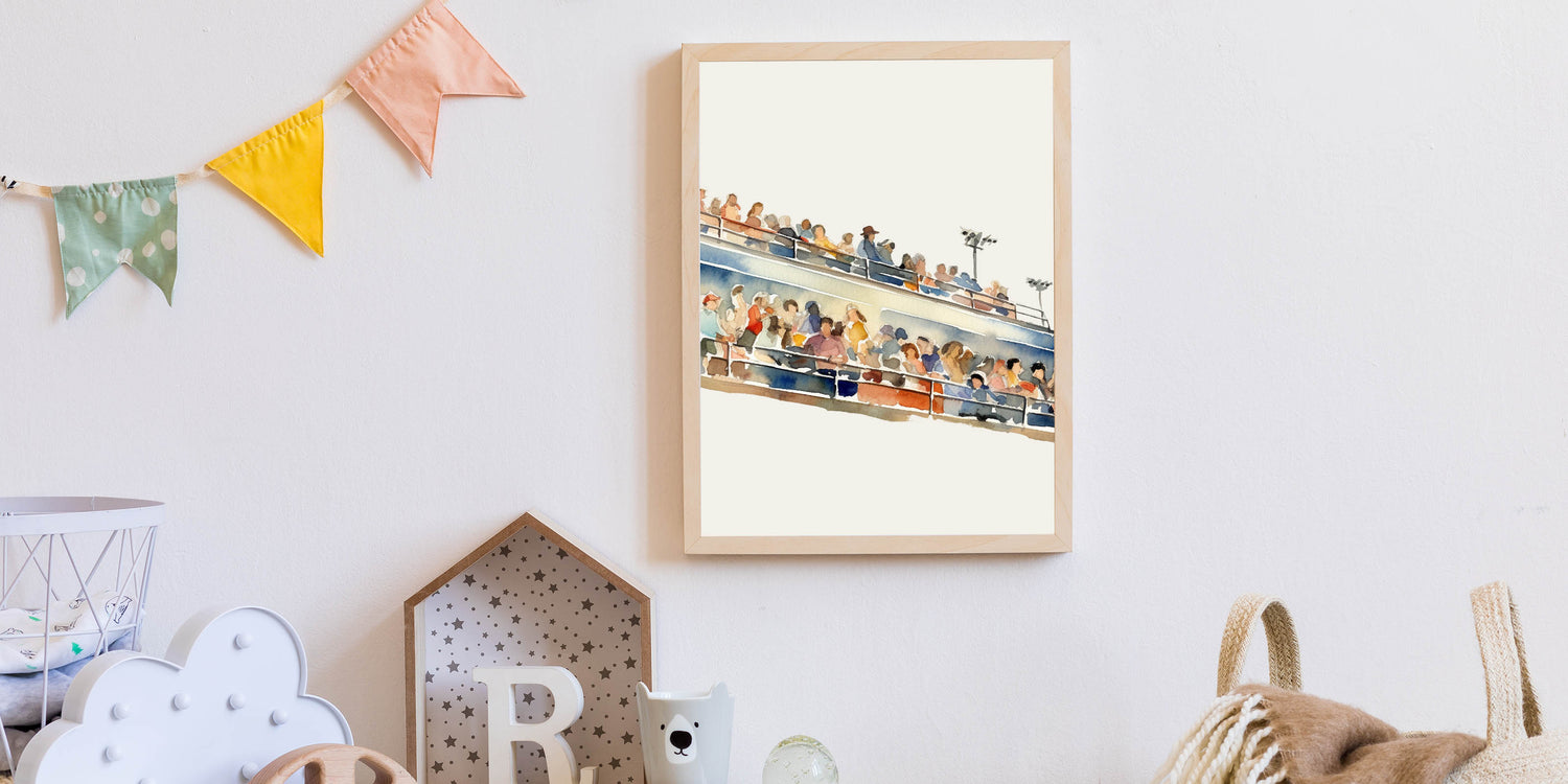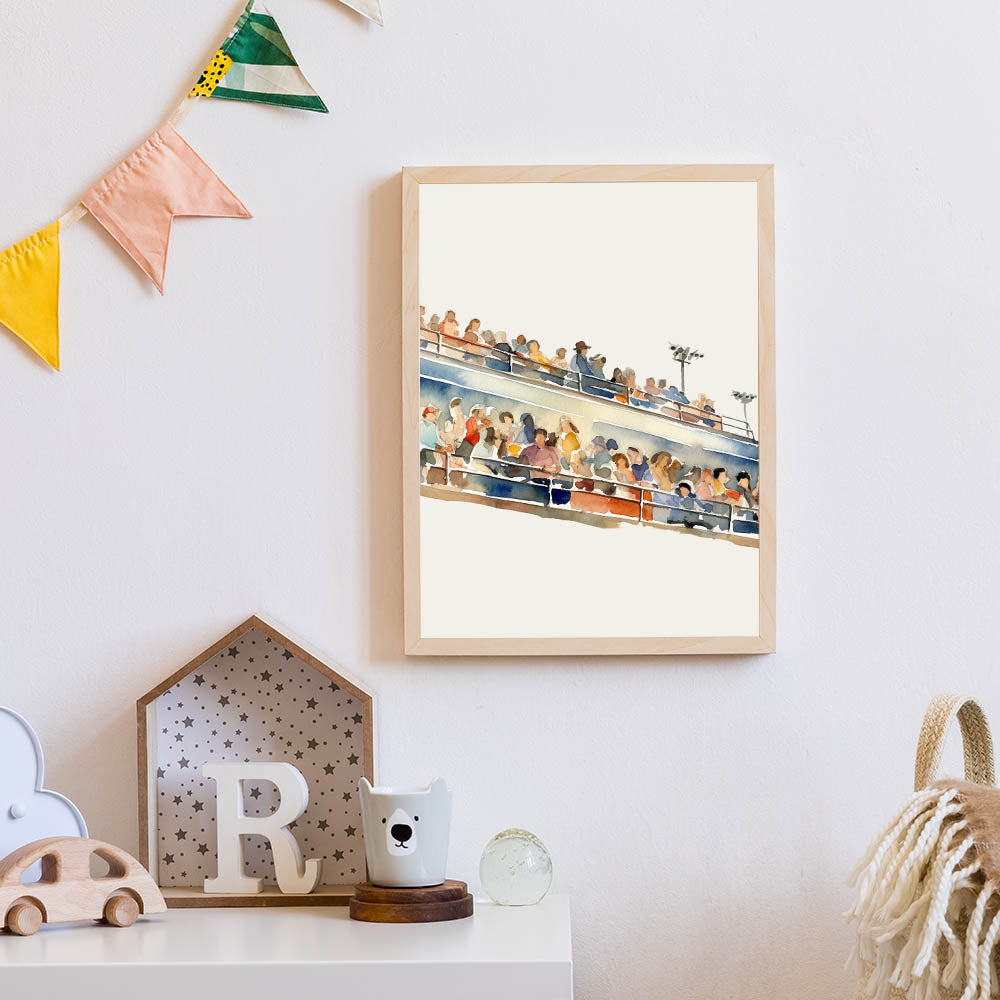 Bring the energy of a stadium to life with this stunning Stadium Crowd Watercolor wall art. Featuring a beautifully painted scene of spectators in the stands, this children's room decor captures the excitement of live sports and the joy of shared moments. Whether you're decorating a nursery wall art display or creating an inspiring boys bedroom art collection, this piece adds warmth and character.