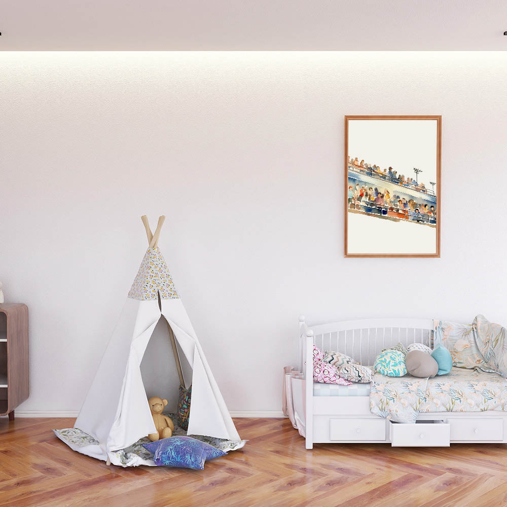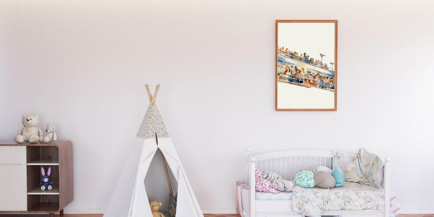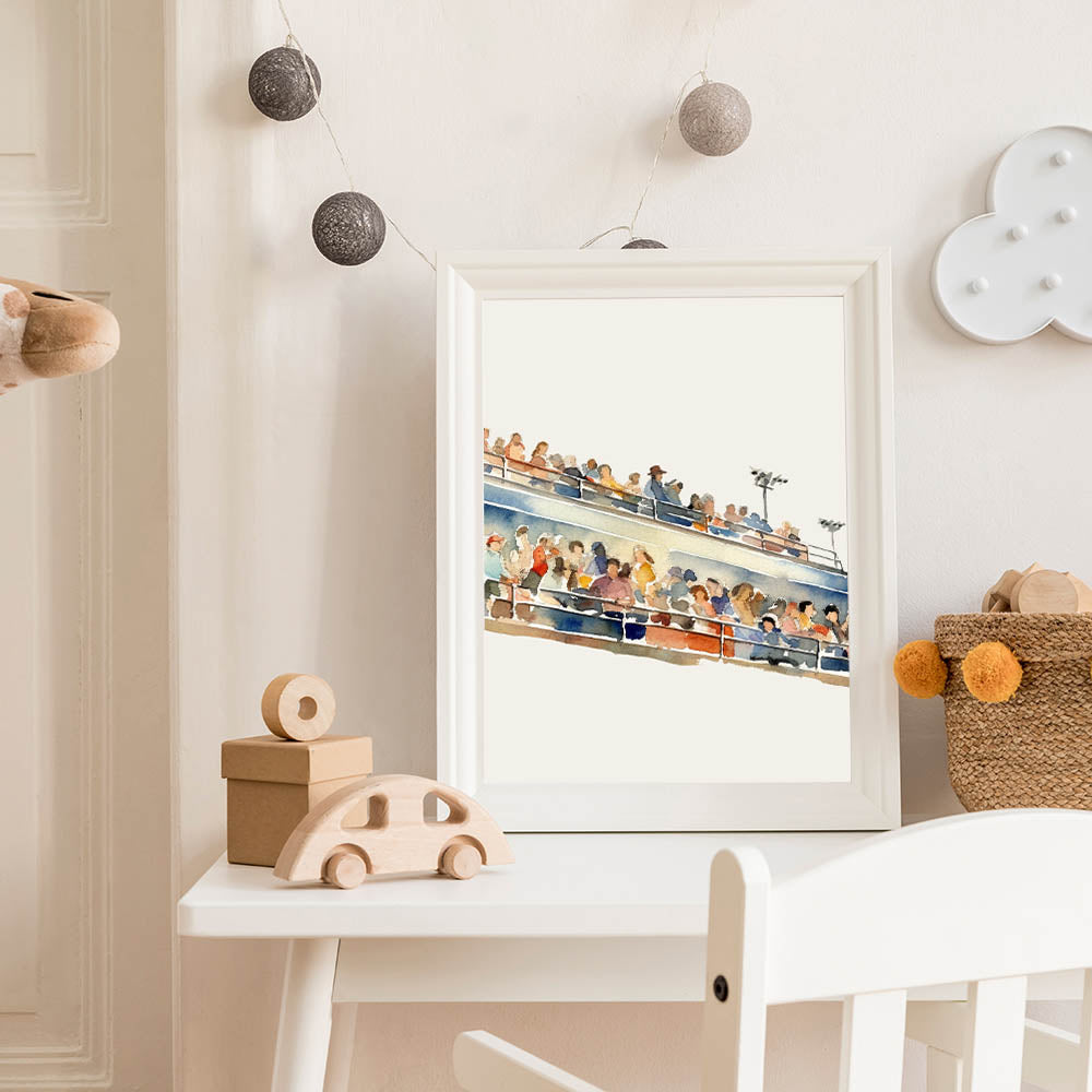 Bring the energy of a stadium to life with this stunning Stadium Crowd Watercolor wall art. Featuring a beautifully painted scene of spectators in the stands, this children's room decor captures the excitement of live sports and the joy of shared moments. Whether you're decorating a nursery wall art display or creating an inspiring boys bedroom art collection, this piece adds warmth and character.