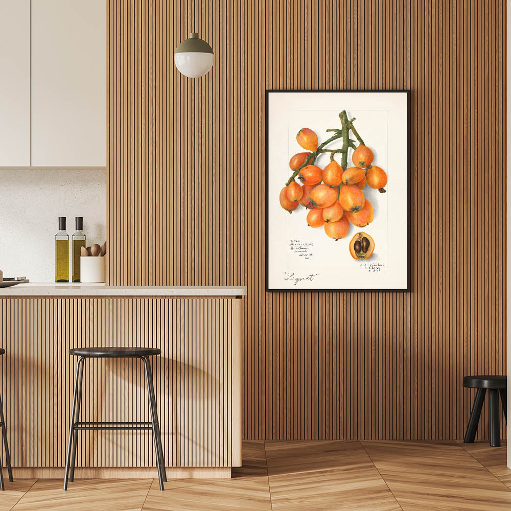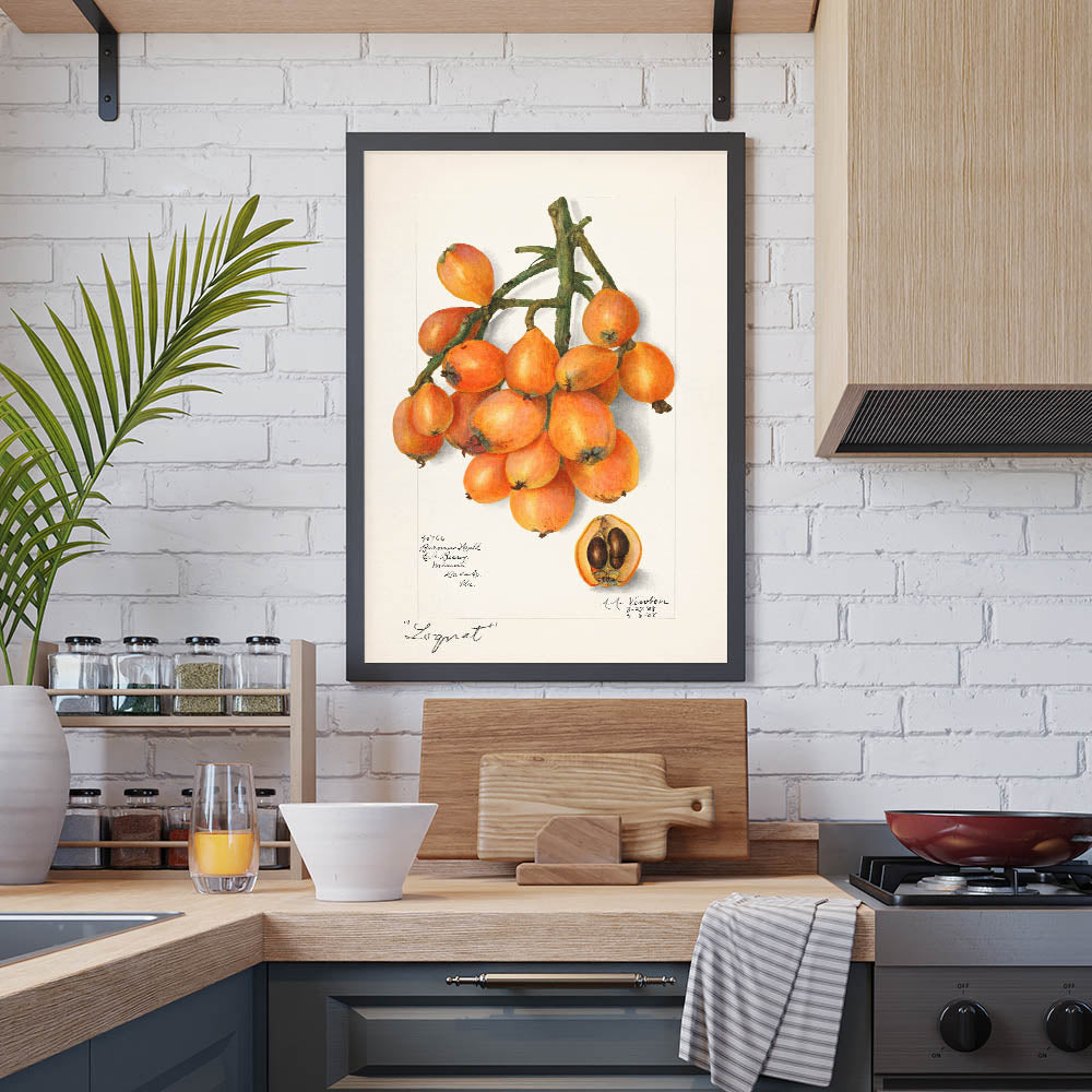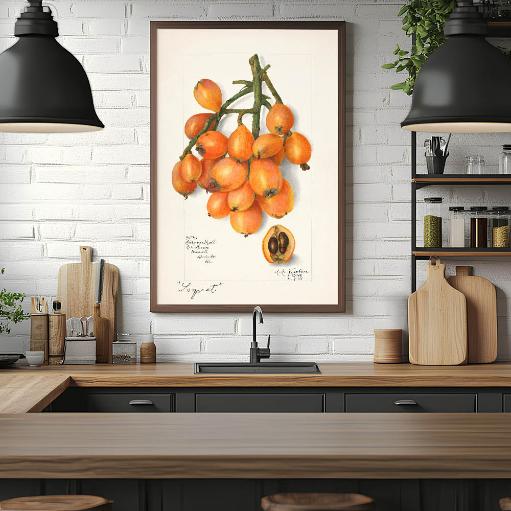 Add a touch of timeless beauty to your space with this fruit-themed wall art, a vintage botanical illustration of loquats. Featuring a delicately detailed fruit illustration print, this artwork captures the natural texture and rich orange and brown tones of this exotic fruit. The classic design makes it an ideal fruit botanical print for kitchens, dining areas, and cafés.