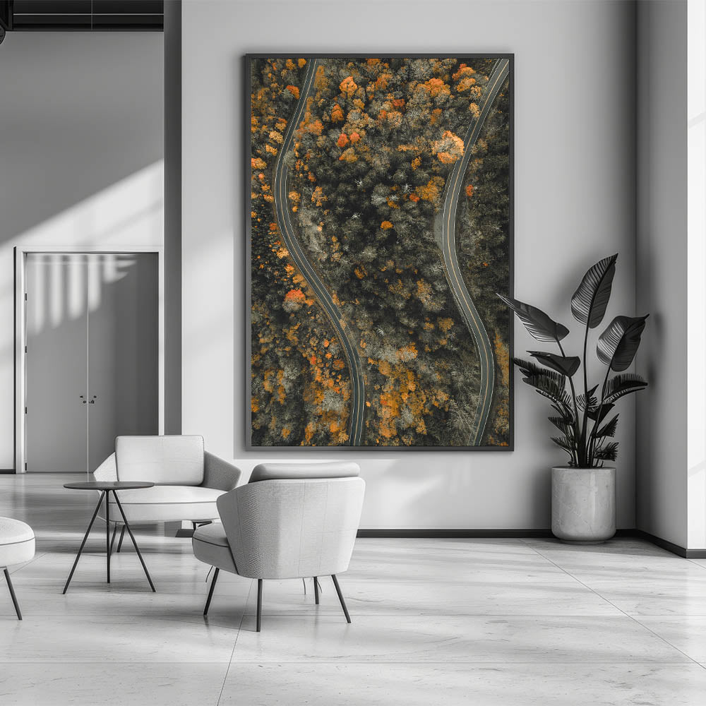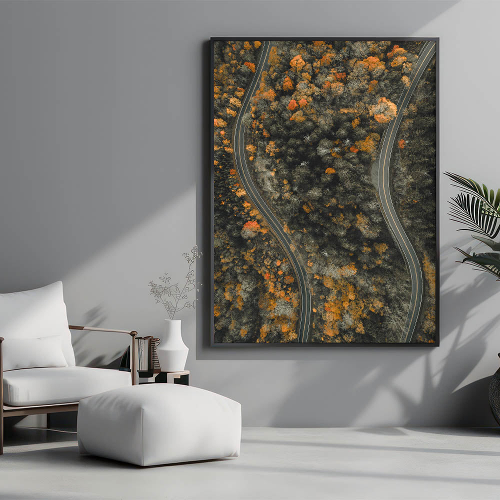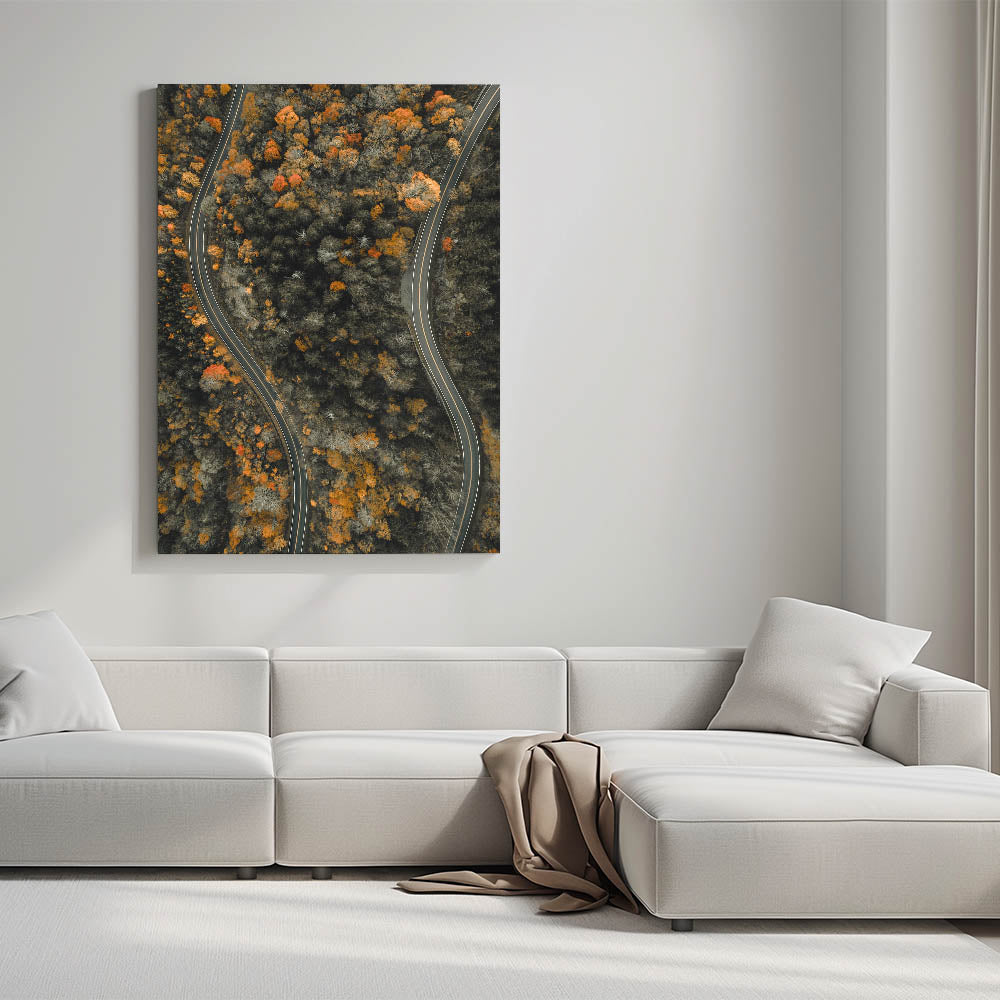 Experience the breathtaking beauty of fall with this fall wall art, featuring an aerial view of a winding road cutting through a forest adorned in autumn’s golden hues. The contrasting tones of deep forest green, burnt orange, and muted gray create a striking visual that embodies the essence of autumn canvas art. The meandering roads invite you on a journey through nature’s seasonal transformation, making this piece a stunning focal point in any space.