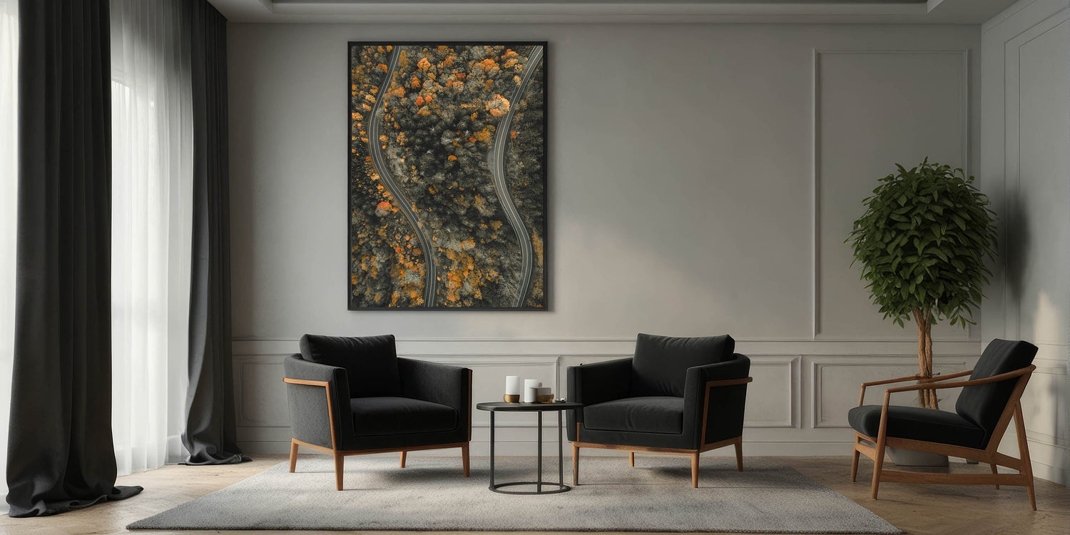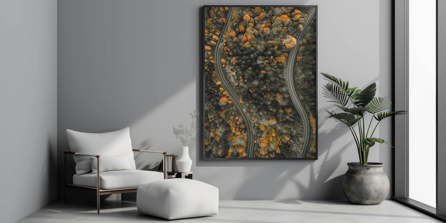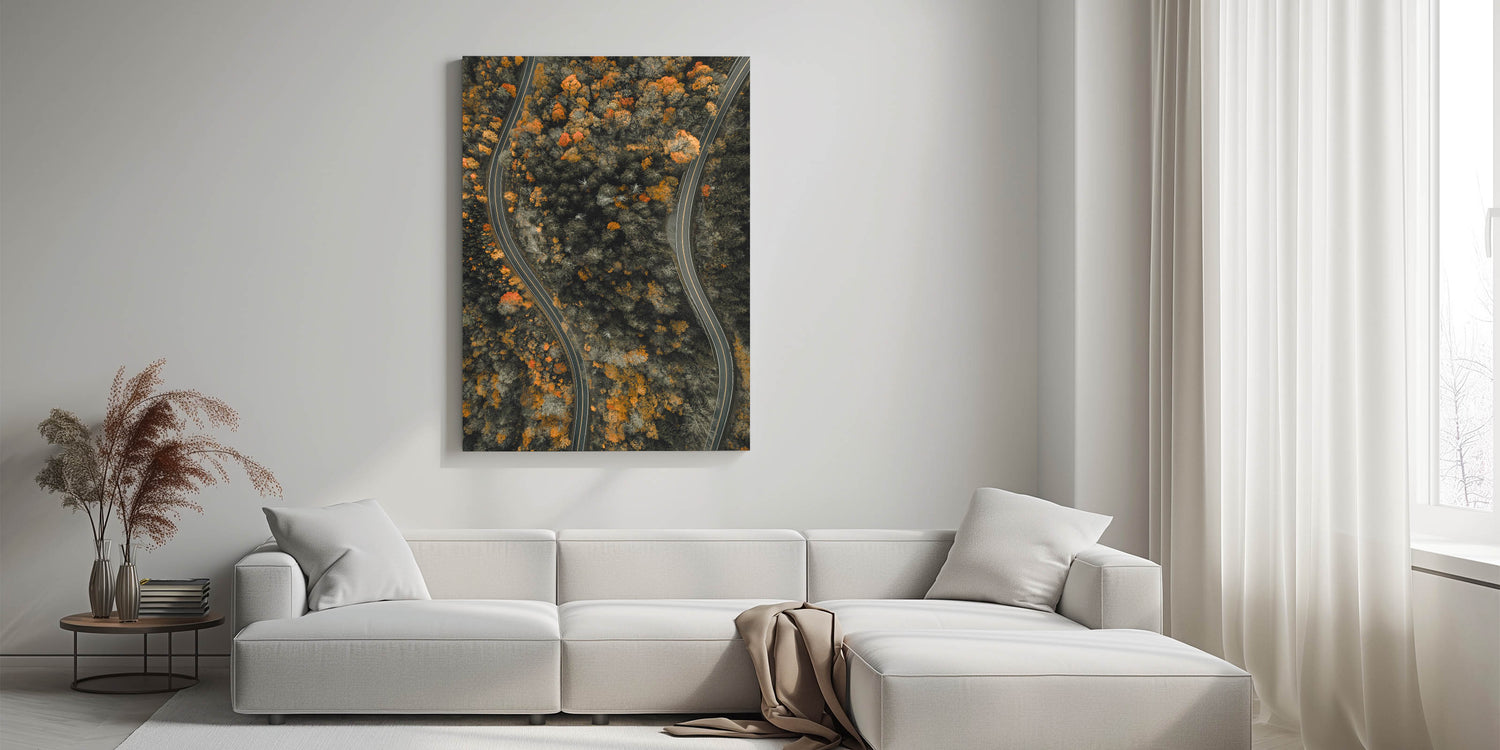 Experience the breathtaking beauty of fall with this fall wall art, featuring an aerial view of a winding road cutting through a forest adorned in autumn’s golden hues. The contrasting tones of deep forest green, burnt orange, and muted gray create a striking visual that embodies the essence of autumn canvas art. The meandering roads invite you on a journey through nature’s seasonal transformation, making this piece a stunning focal point in any space.