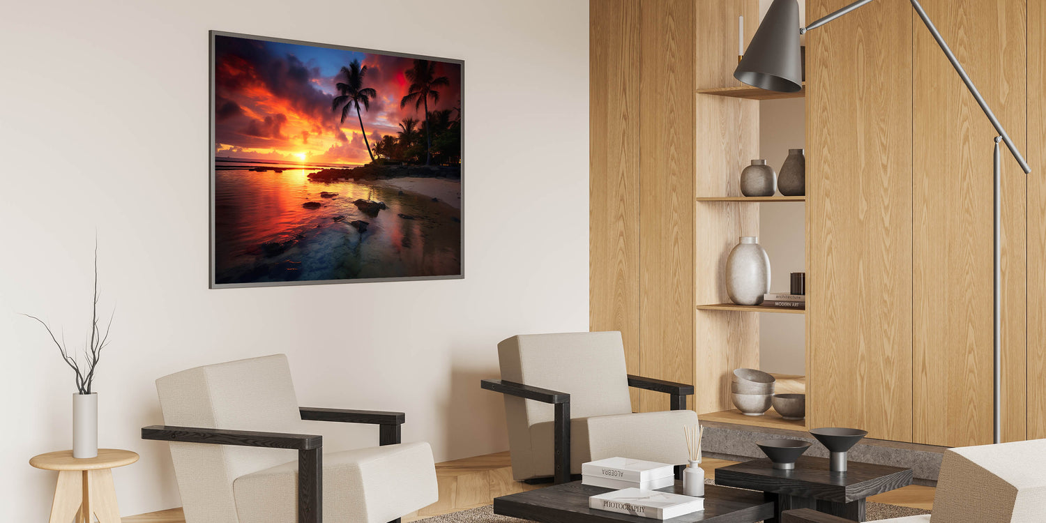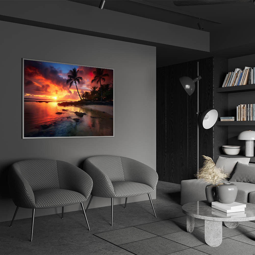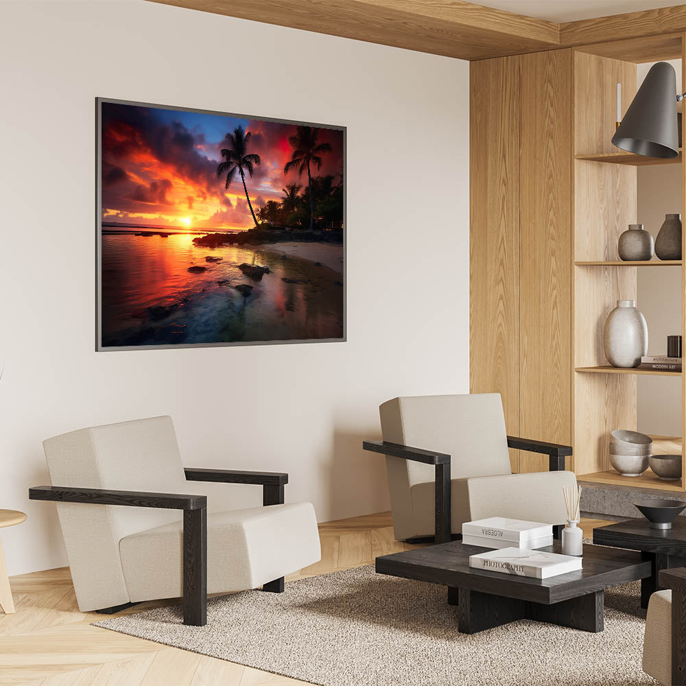 Bring the breathtaking beauty of a Bahamas sunset into your home with this stunning beach painting. Featuring a dramatic sky ablaze with fiery hues of orange, red, and purple, the scene is accentuated by palm trees silhouetted against the colorful sky. The peaceful waters reflect the rich tones of the sunset, creating a calming yet vibrant tropical atmosphere. This artwork is perfect for anyone looking to enhance their living space with a touch of Caribbean elegance and warmth.