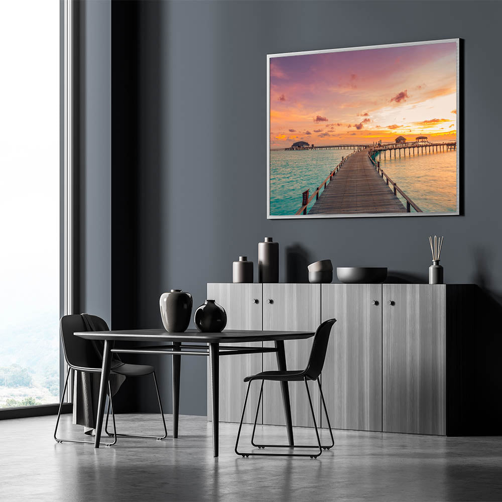 Capture the breathtaking beauty of a Caribbean sunset with this captivating Bahamas beach painting. The artwork showcases a wooden pier extending over the turquoise waters, set against a backdrop of vibrant, glowing skies. The warm hues of orange, purple, and pink blend seamlessly to create a serene and peaceful atmosphere, perfect for enhancing any space with a touch of tropical paradise.