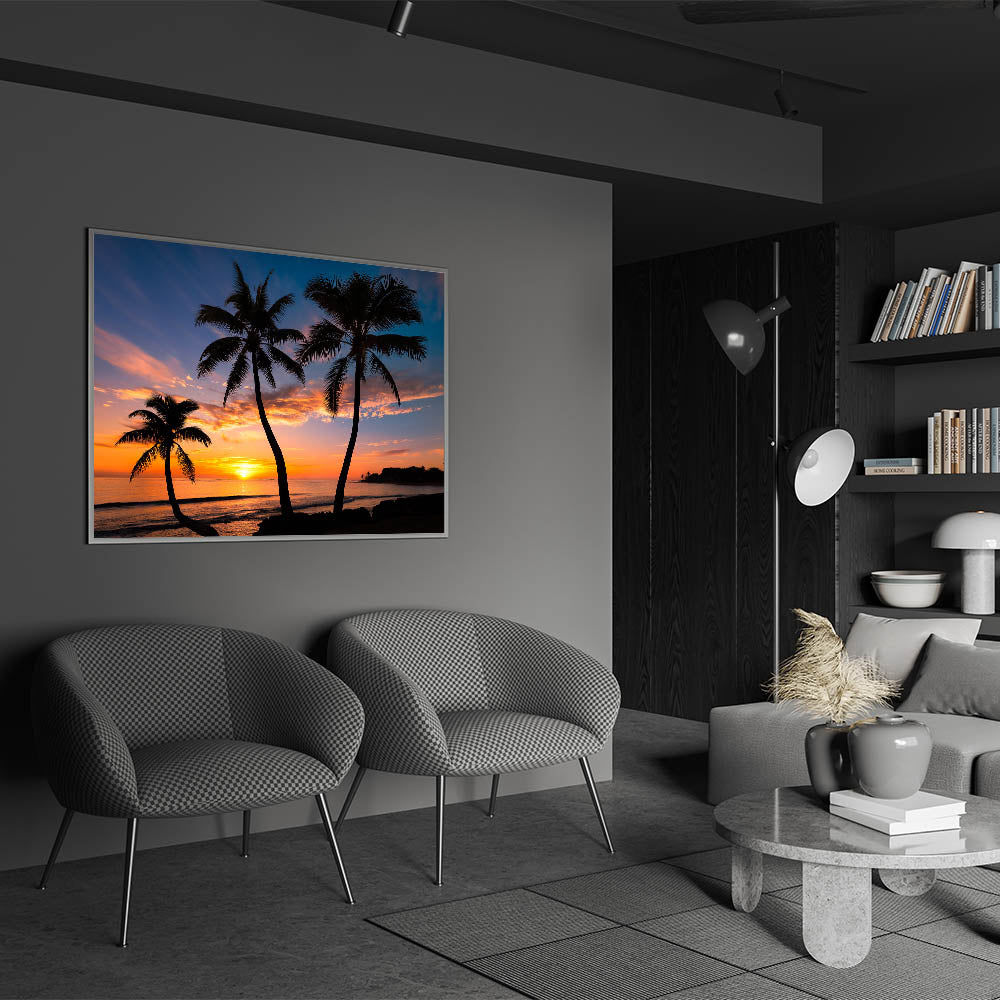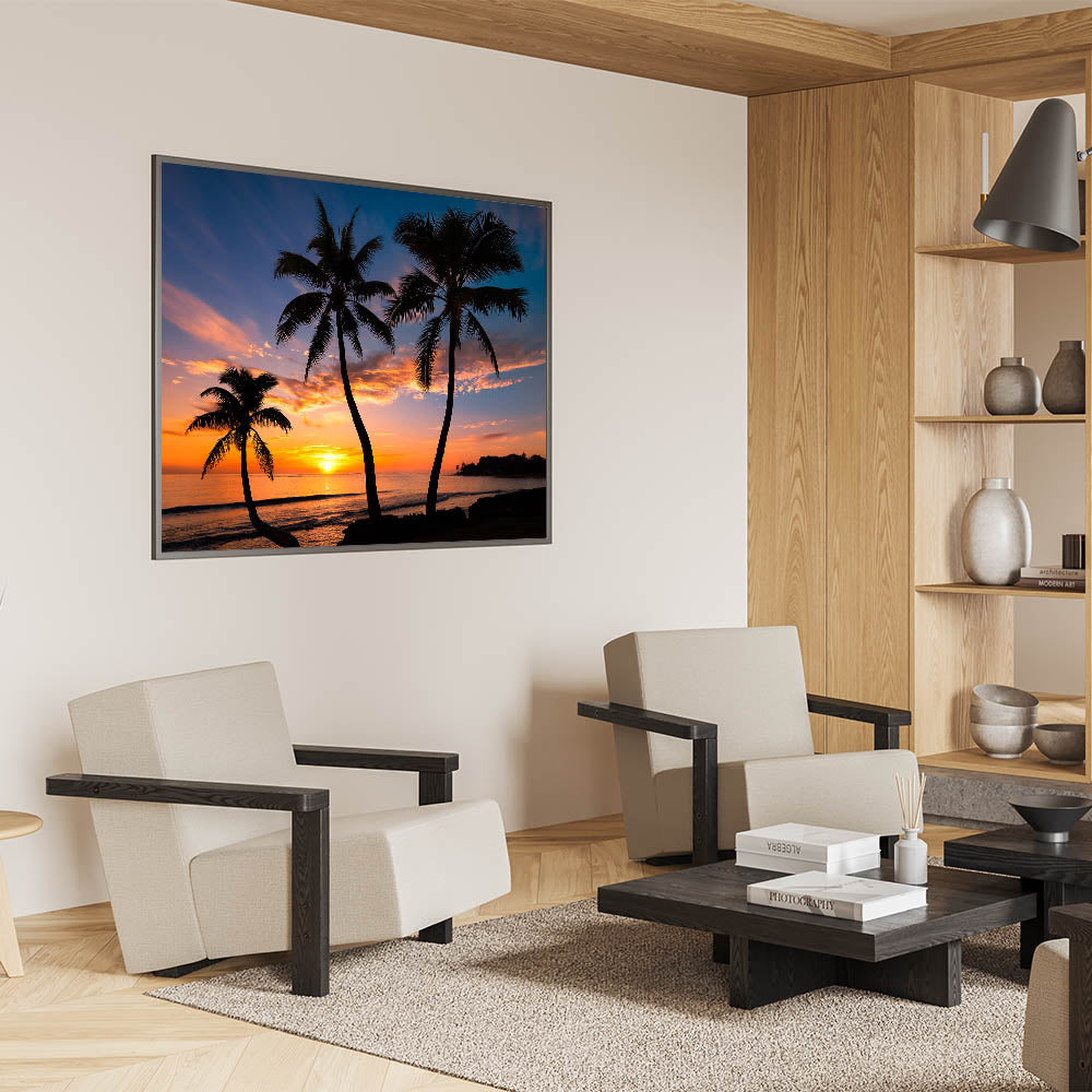 Immerse yourself in the beauty of the Caribbean with this stunning piece of Caribbean scenery art. This artwork features silhouetted palm trees set against a vibrant sunset over the tranquil waters of the Bahamas. The striking colors of orange, pink, and deep blue blend perfectly, creating a captivating and serene tropical scene that adds warmth and elegance to any space.