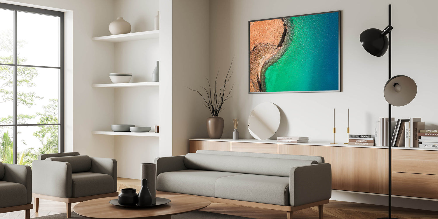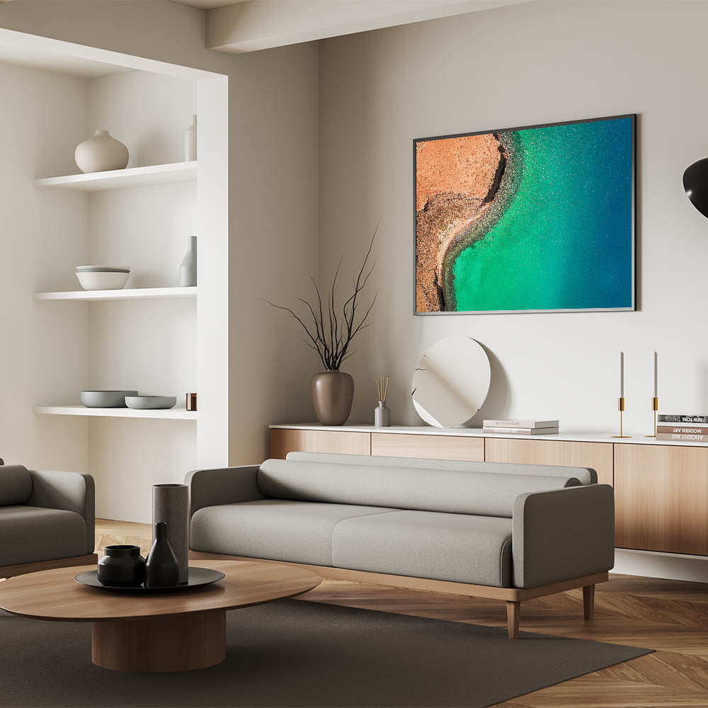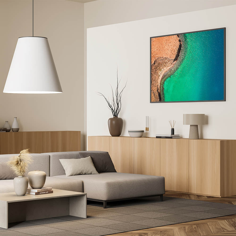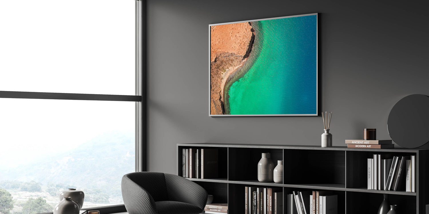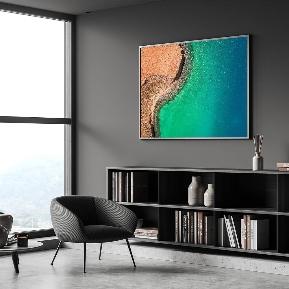 Elevate your space with the breathtaking beauty of Baja California Sur through this stunning wall art, featuring a striking aerial view of a vibrant turquoise coastline. The dramatic contrast between the rugged, reddish-brown land and the shimmering blue-green waters creates a captivating scene that embodies the natural allure of Baja's coastal landscapes.