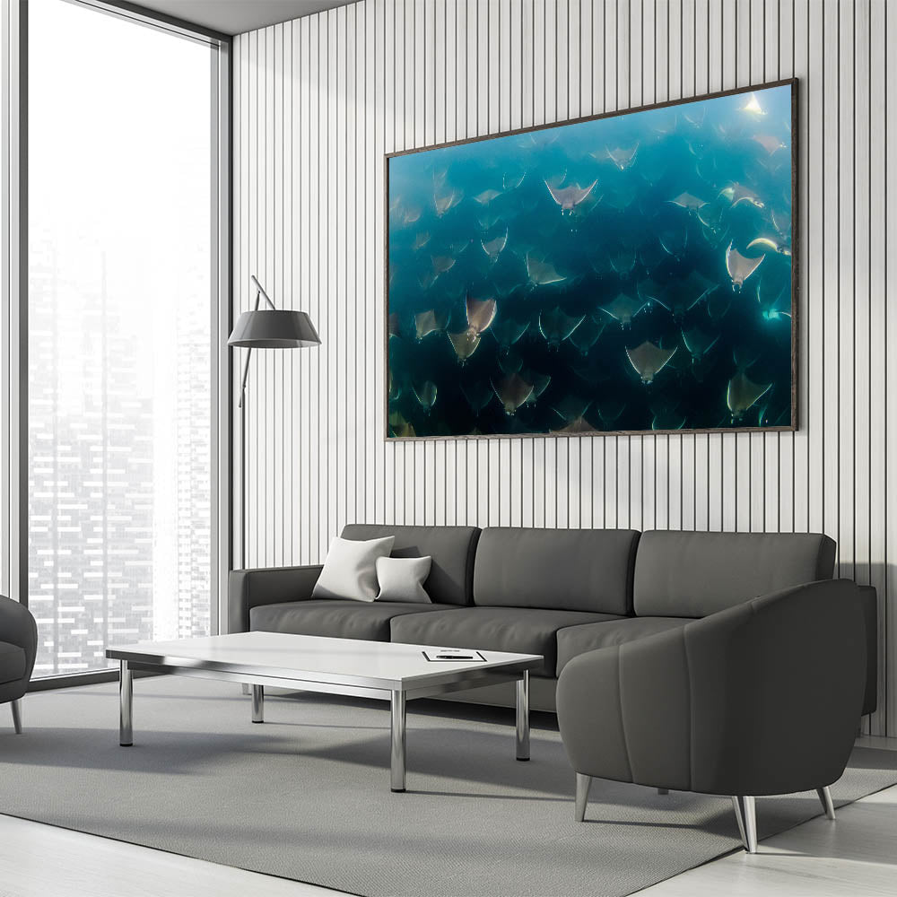 Dive into the mesmerizing underwater world of Baja California Sur with this captivating wall art, featuring a breathtaking school of rays gliding gracefully through the turquoise waters of the Gulf of California. The intricate patterns and graceful movement of the rays create a serene and awe-inspiring scene that captures the beauty and mystery of marine life in Mexico's coastal waters.