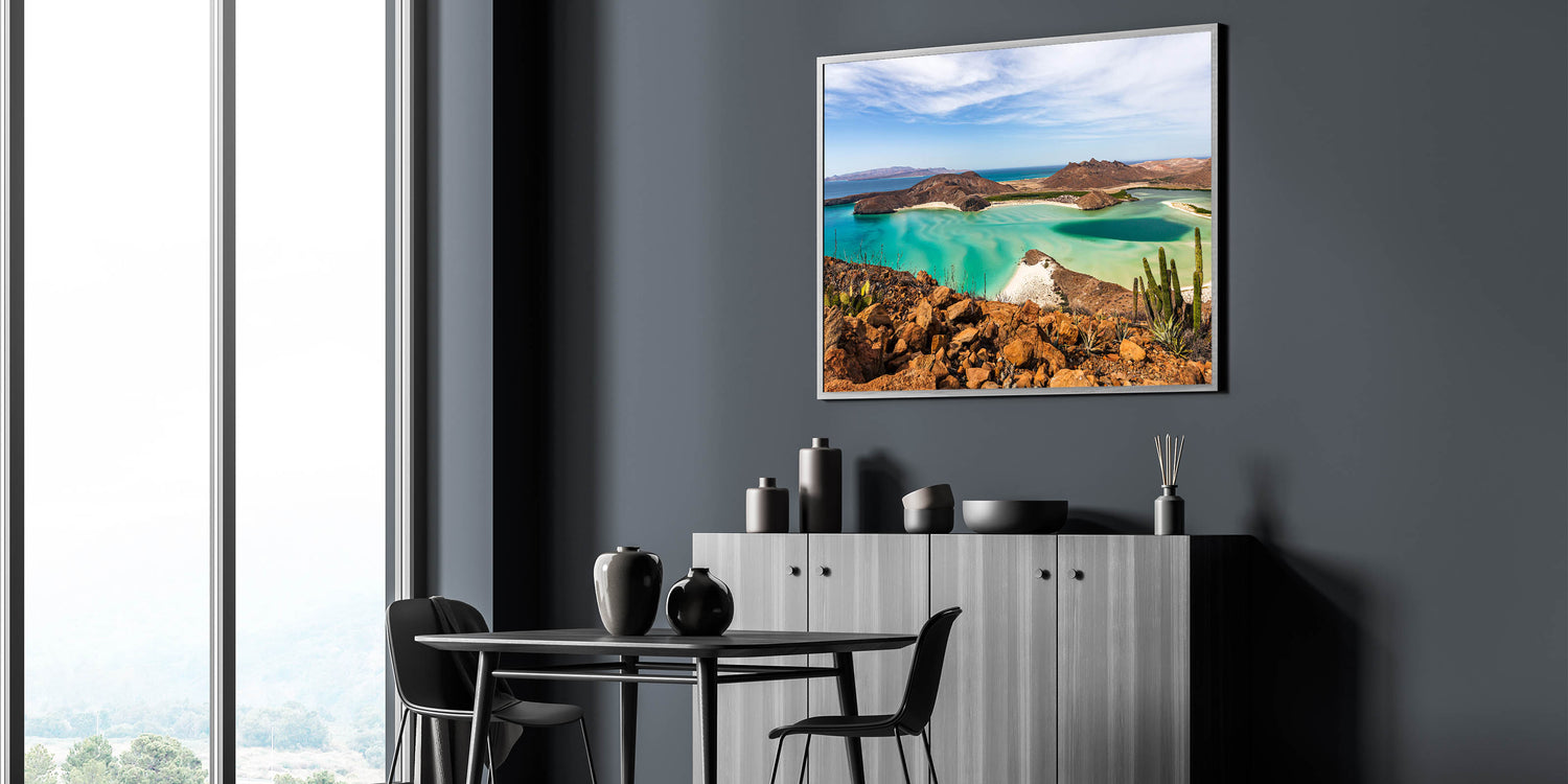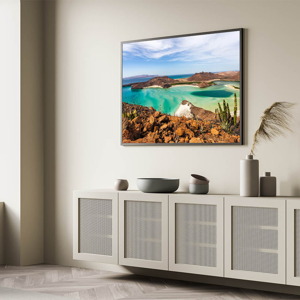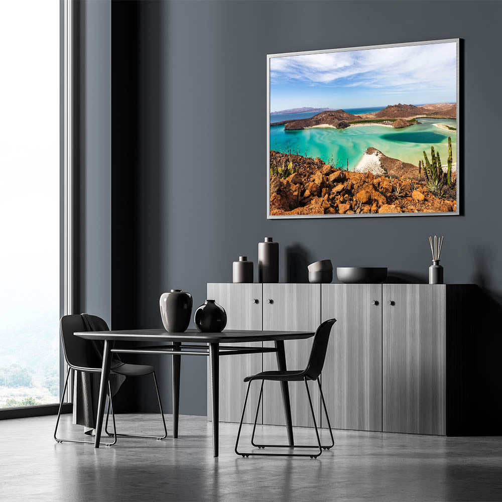 Experience the breathtaking beauty of Baja California Sur with this captivating wall art, featuring a stunning contrast between the vibrant turquoise waters of a serene bay and the rugged desert landscape that surrounds it. The vivid colors and dramatic terrain create a scene that perfectly captures the unique allure of Baja's coastal environments.