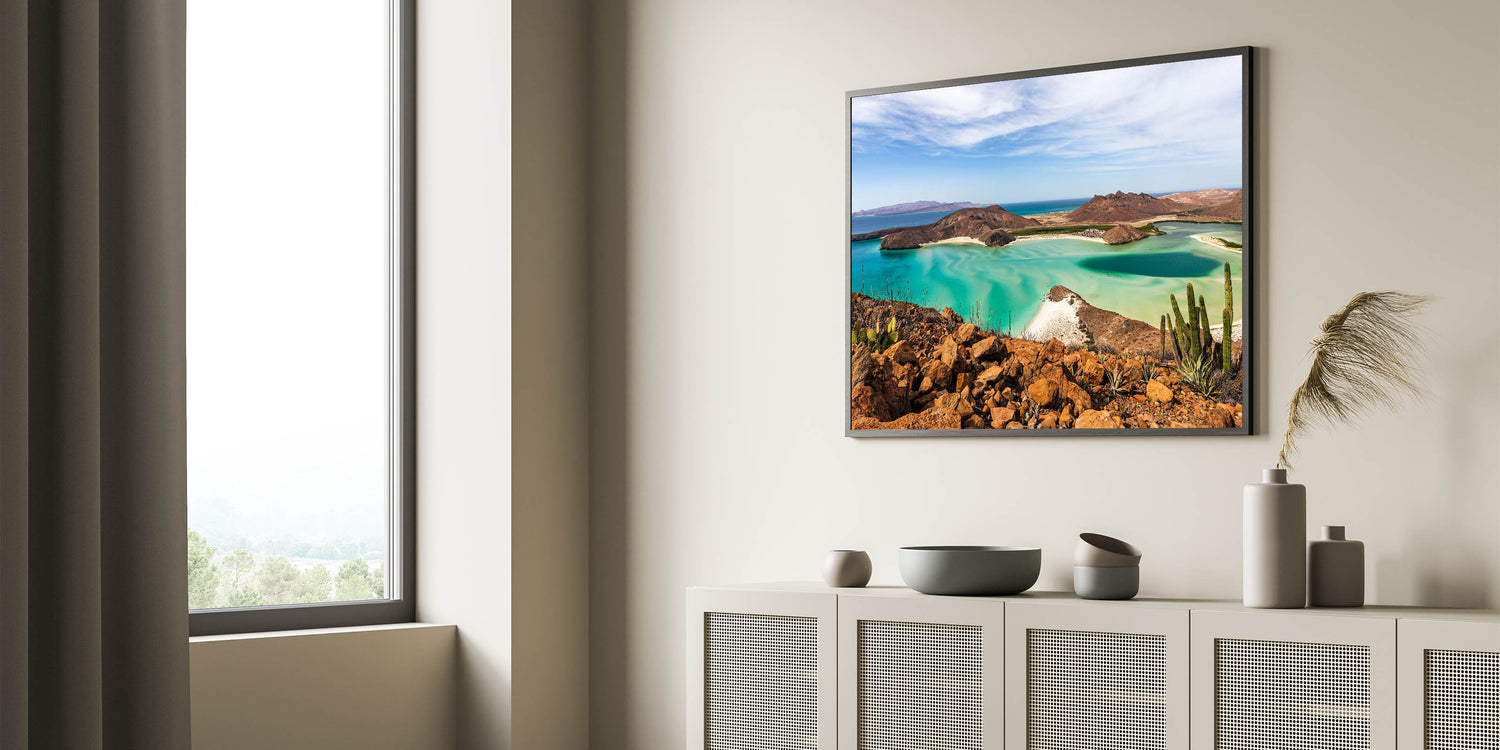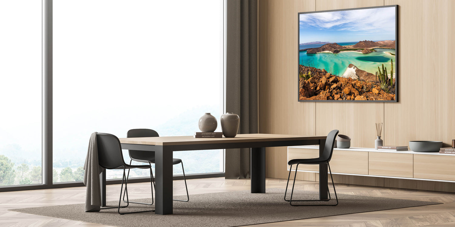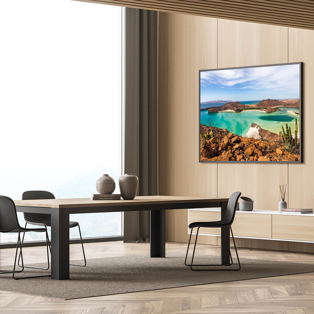 Experience the breathtaking beauty of Baja California Sur with this captivating wall art, featuring a stunning contrast between the vibrant turquoise waters of a serene bay and the rugged desert landscape that surrounds it. The vivid colors and dramatic terrain create a scene that perfectly captures the unique allure of Baja's coastal environments.