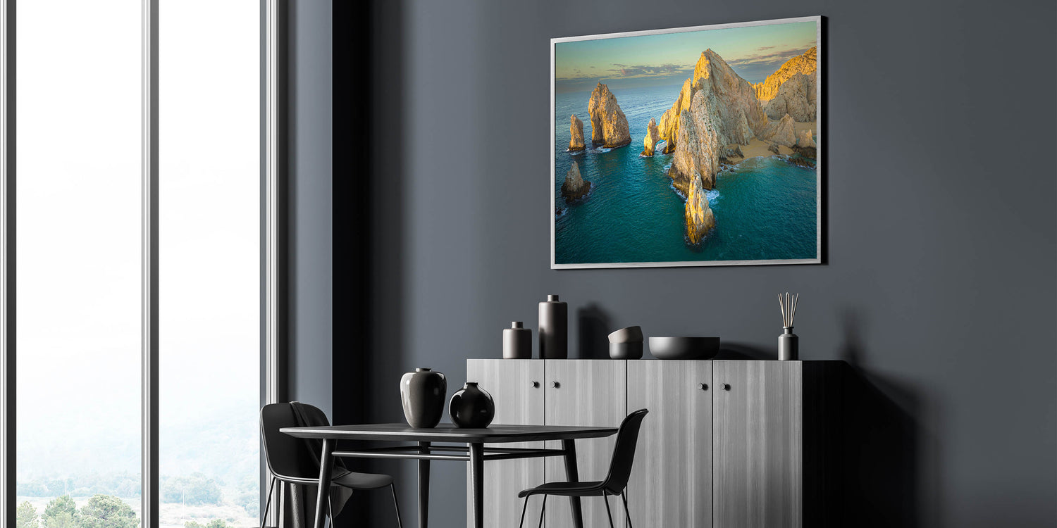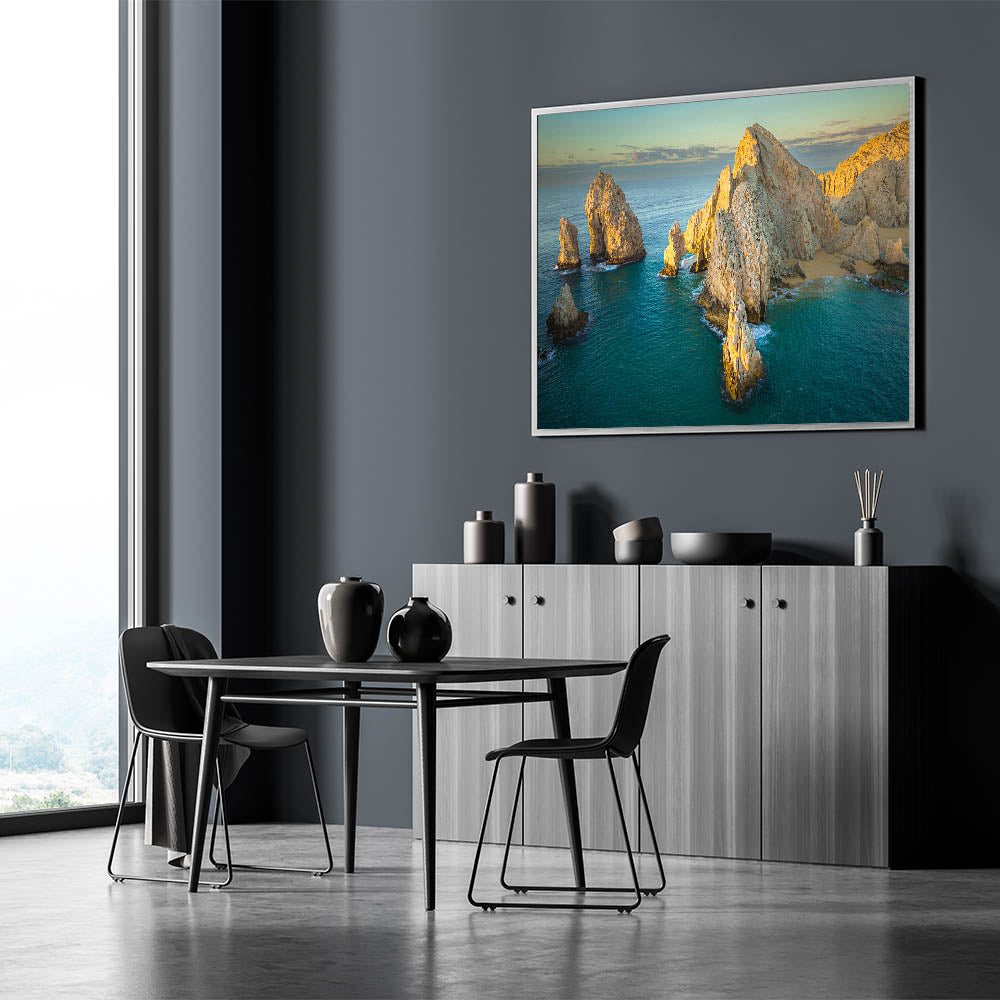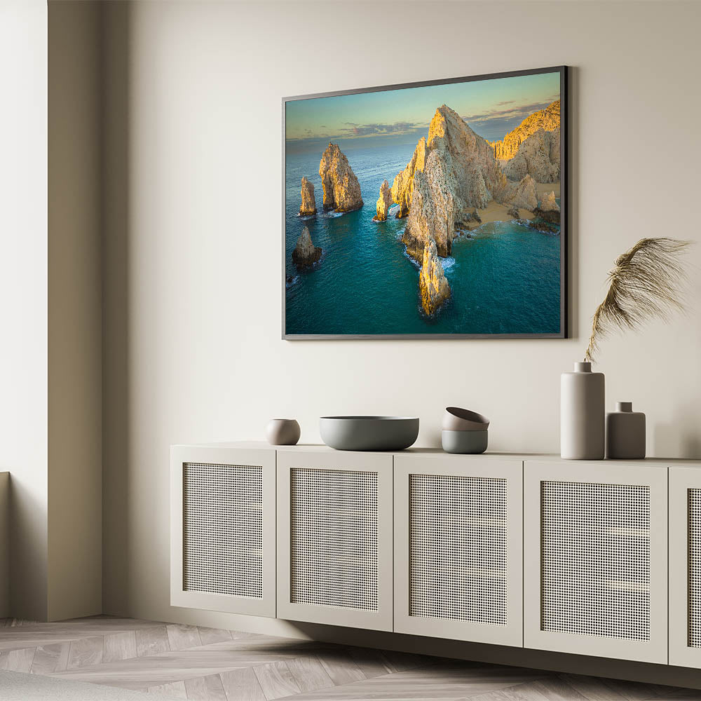 Bring the tranquil beauty of Baja California into your space with this stunning wall art, showcasing the sunlit coastal cliffs and natural arches of Mexico’s Baja Peninsula. The calm turquoise waters and golden sunlight create a peaceful scene that embodies the serene charm of Baja's coastline.