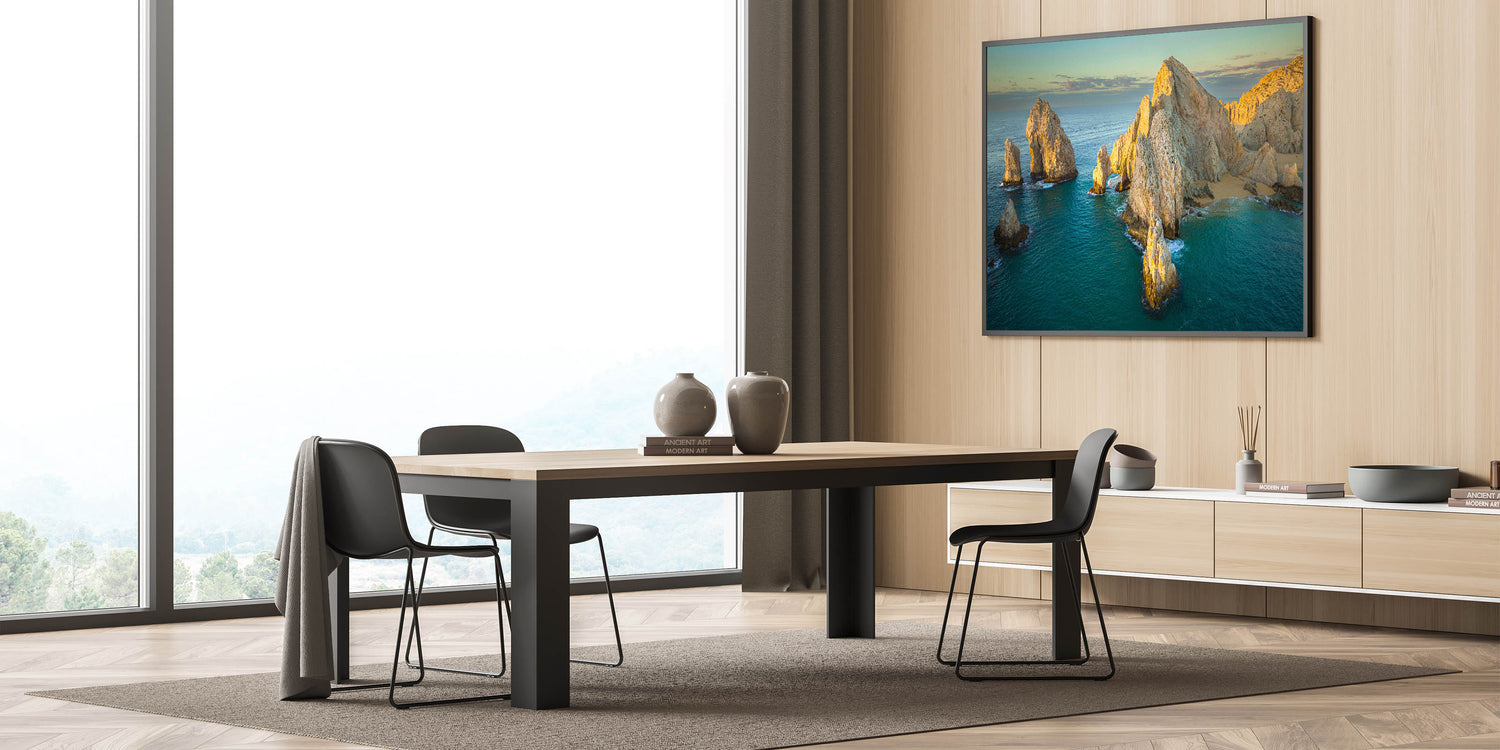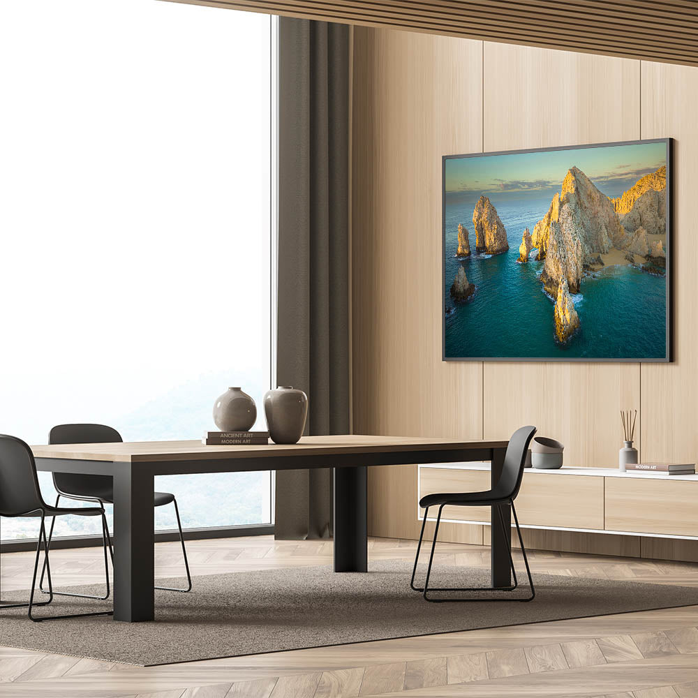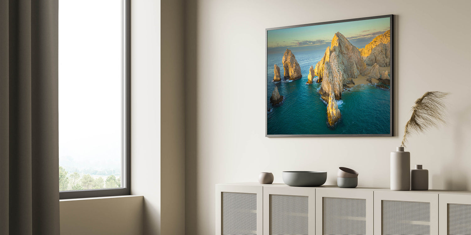 Bring the tranquil beauty of Baja California into your space with this stunning wall art, showcasing the sunlit coastal cliffs and natural arches of Mexico’s Baja Peninsula. The calm turquoise waters and golden sunlight create a peaceful scene that embodies the serene charm of Baja's coastline.