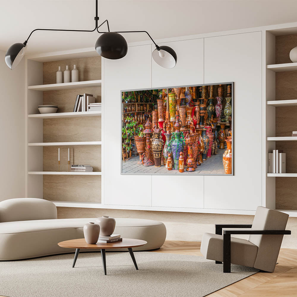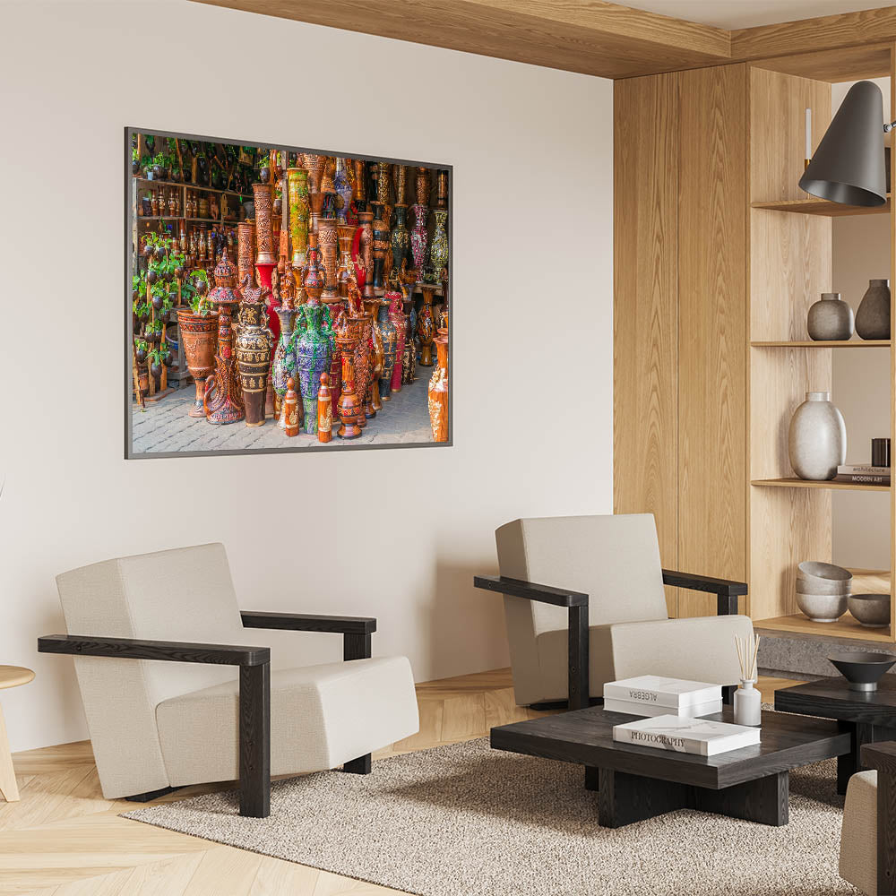 Add a splash of vibrant culture to your space with this stunning wall art featuring the intricate and colorful handicrafts of Bangladesh. This artwork captures the essence of Bangladeshi artistry, showcasing an array of beautifully crafted vases, pots, and decor pieces that highlight the region's rich cultural heritage.