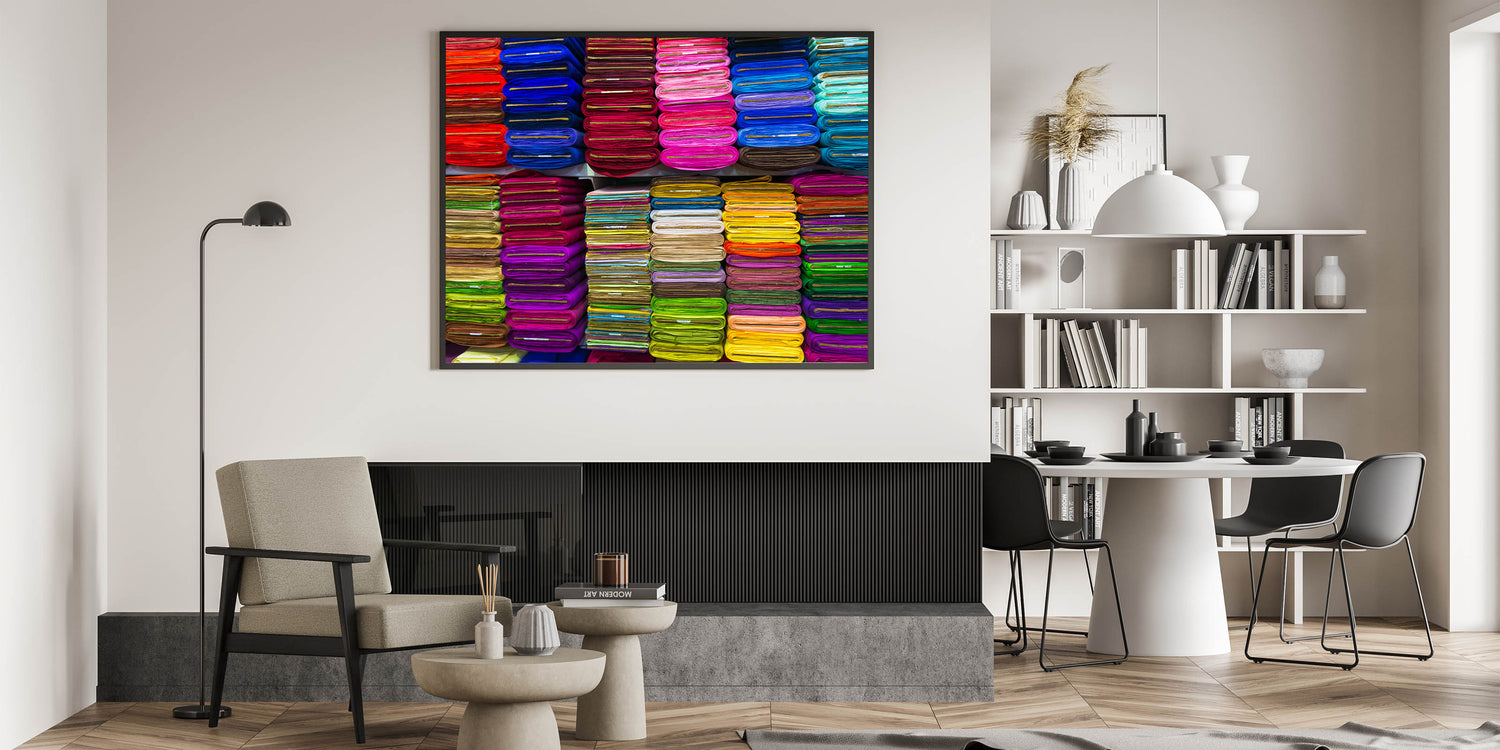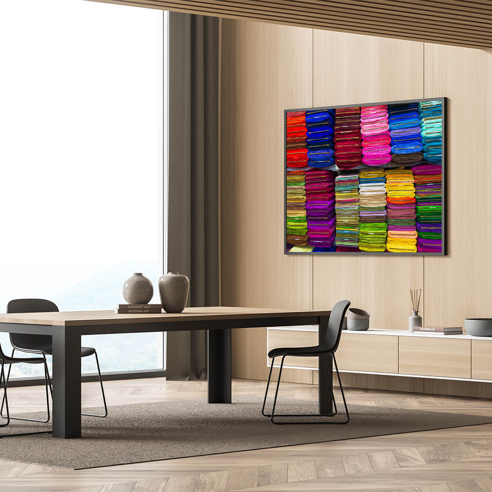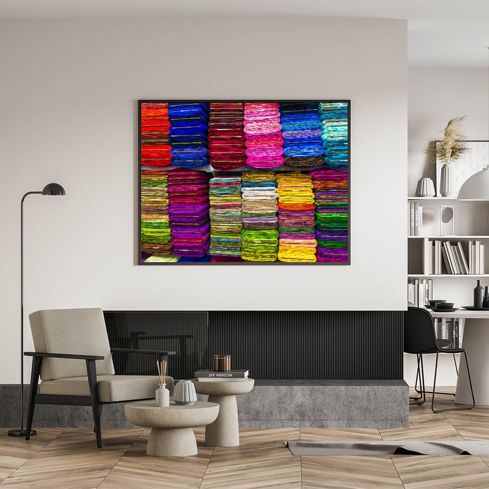 Brighten up your space with this stunning wall art featuring a vibrant display of traditional Bangladeshi fabrics. This artwork captures the essence of Bangladesh's rich textile heritage, showcasing an array of colorful, neatly folded fabrics that reflect the region's love for bold and vivid colors.