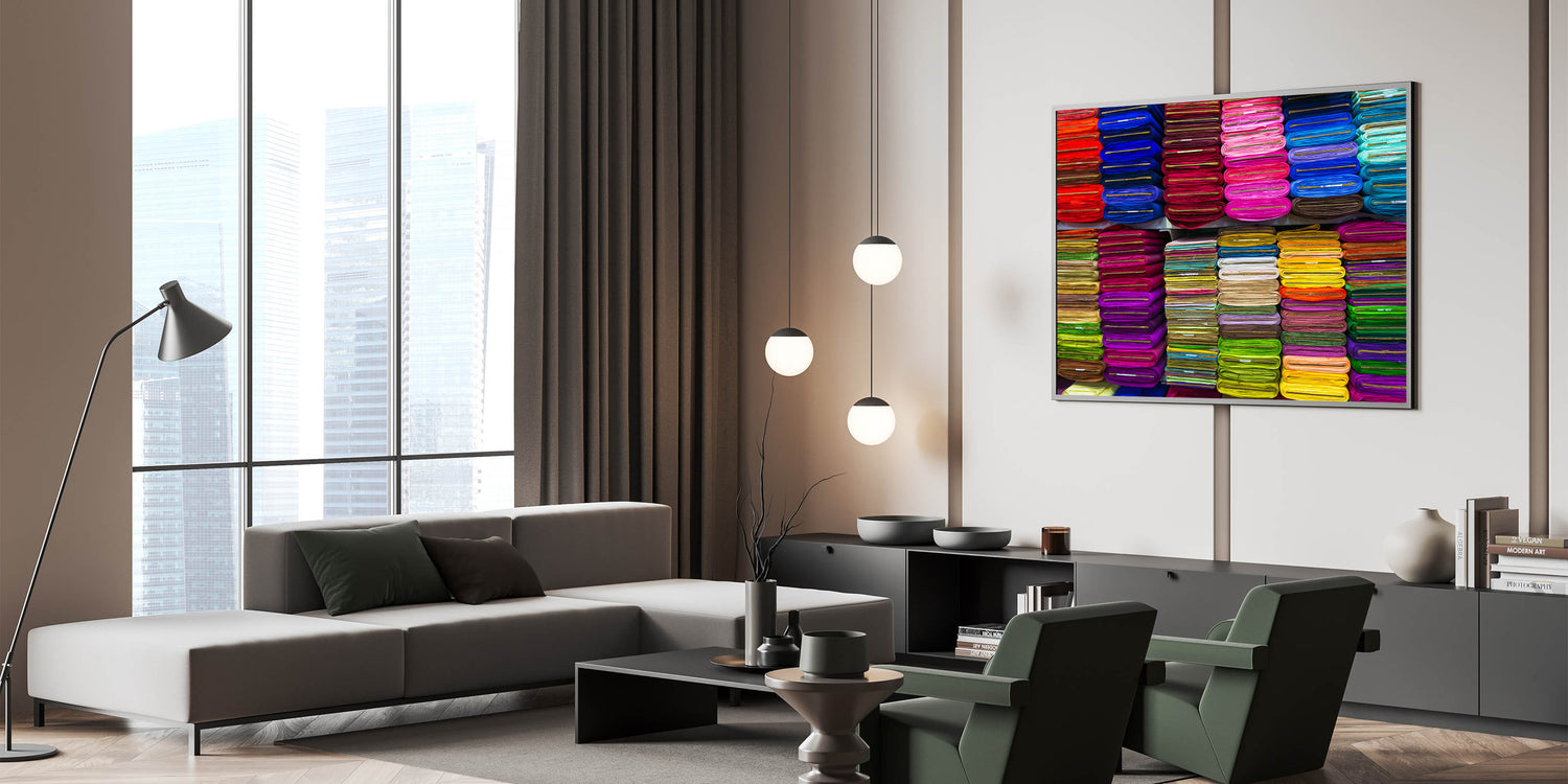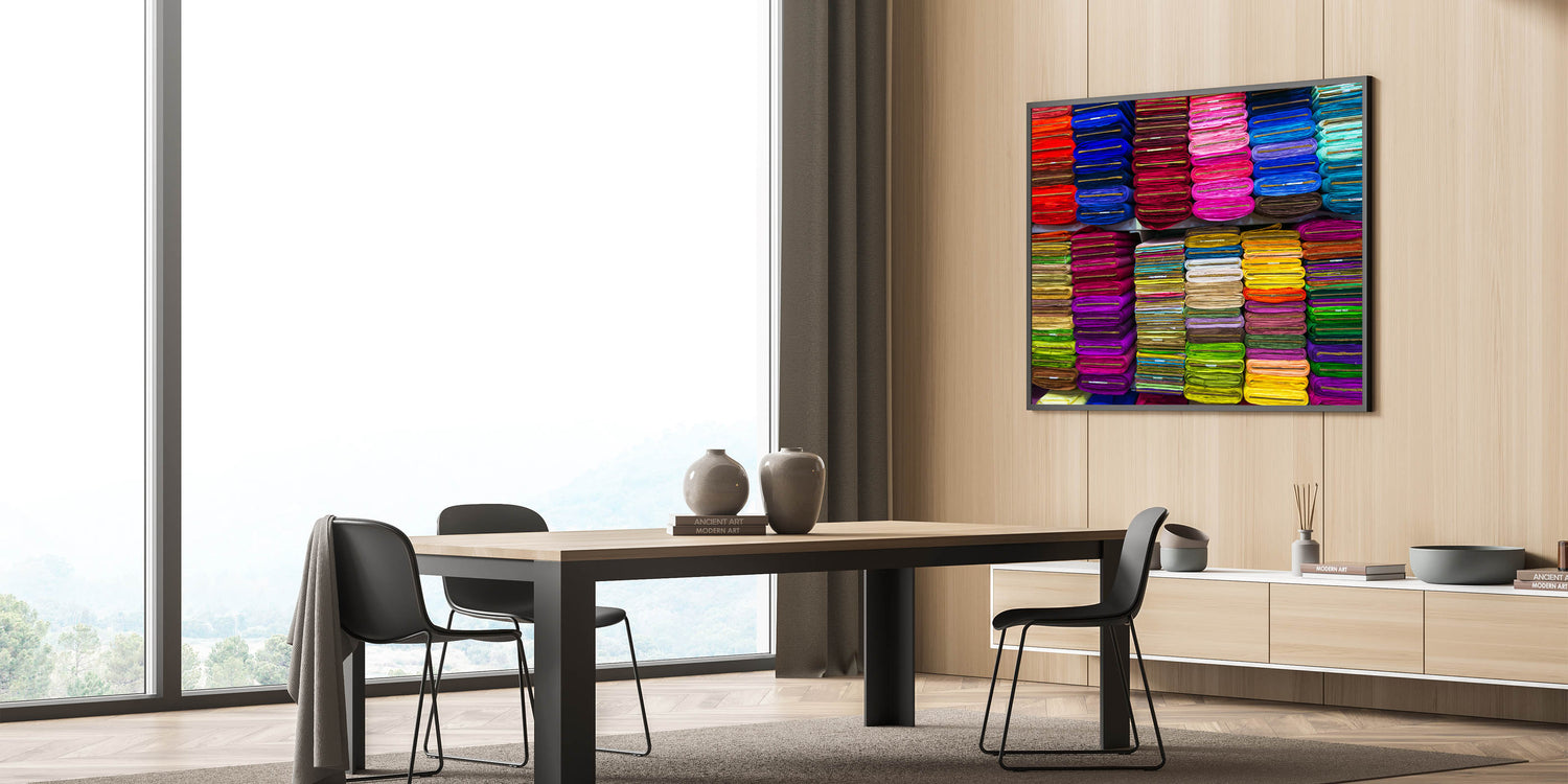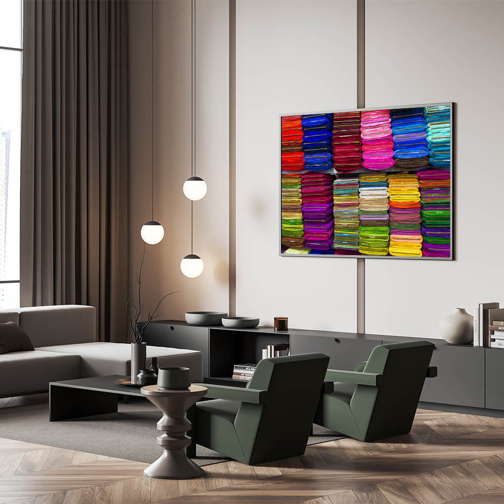 Brighten up your space with this stunning wall art featuring a vibrant display of traditional Bangladeshi fabrics. This artwork captures the essence of Bangladesh's rich textile heritage, showcasing an array of colorful, neatly folded fabrics that reflect the region's love for bold and vivid colors.