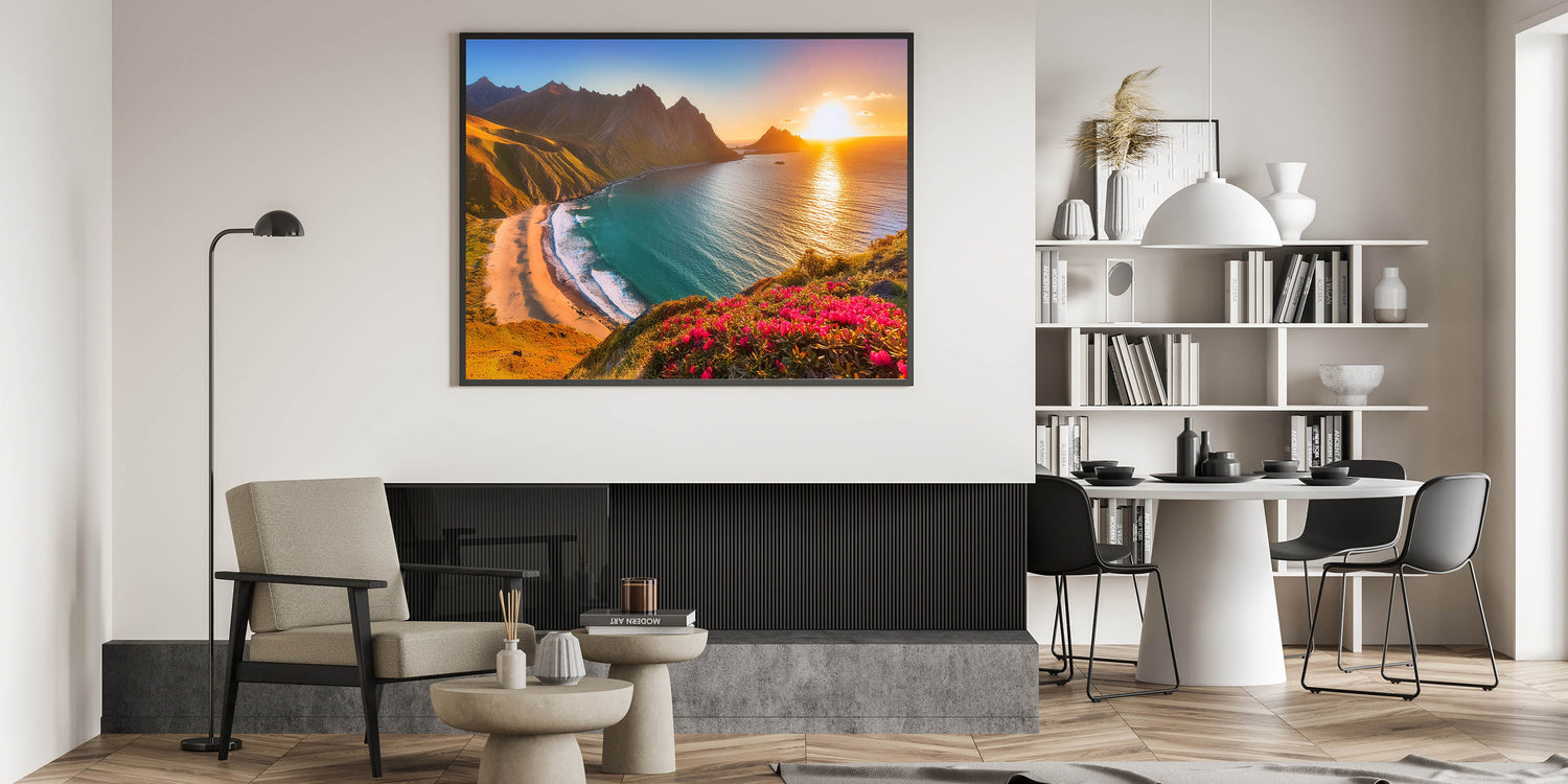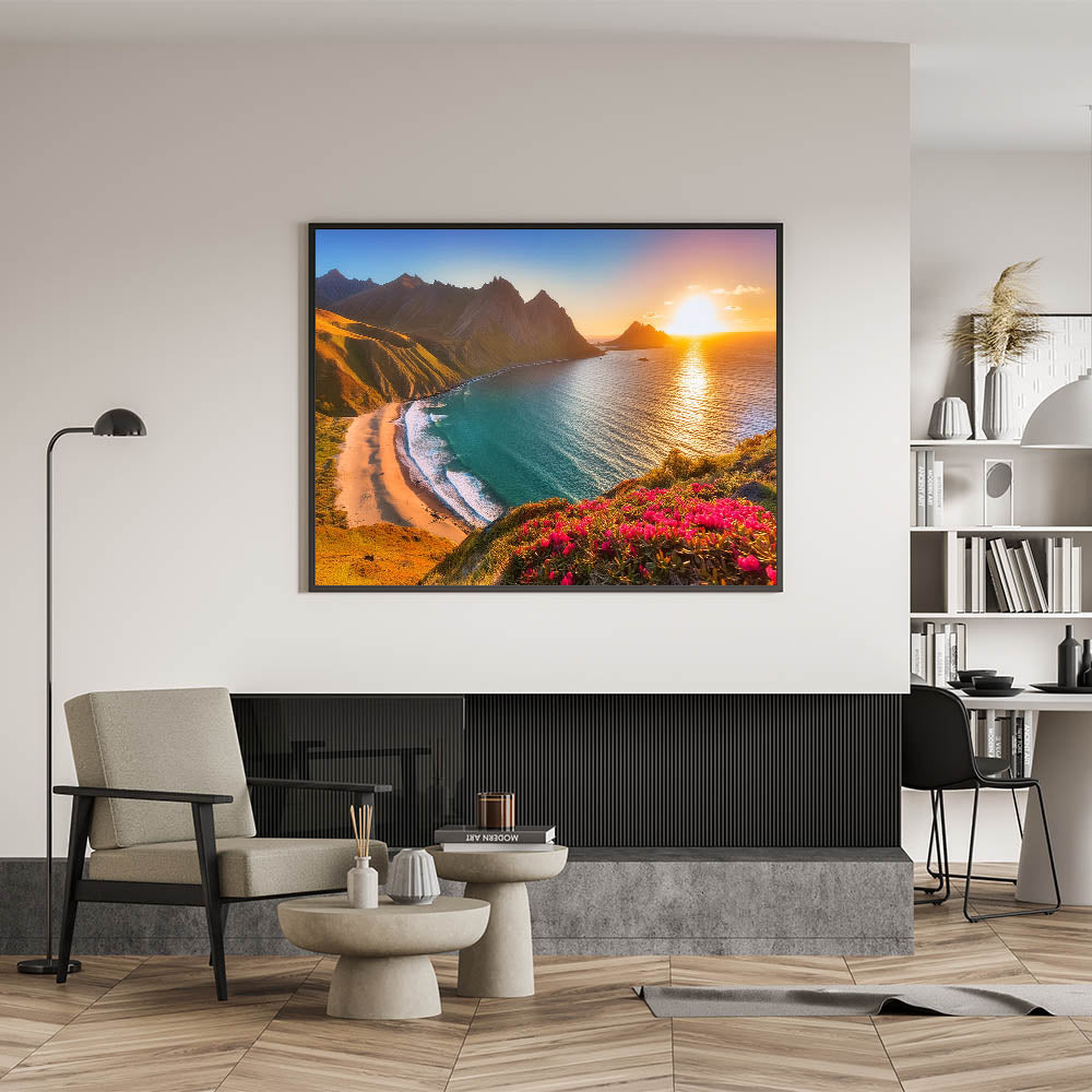 Embrace the breathtaking beauty of nature with this stunning Barbados wall art, featuring a dramatic coastal view of mountains, turquoise waters, and vibrant flowers bathed in the golden glow of sunset. The intricate details of the landscape, combined with the rich colors of the setting sun, create a mesmerizing scene that captures the essence of untouched paradise. This artwork is perfect for those looking to bring a piece of tropical tranquility and natural beauty into their homes.