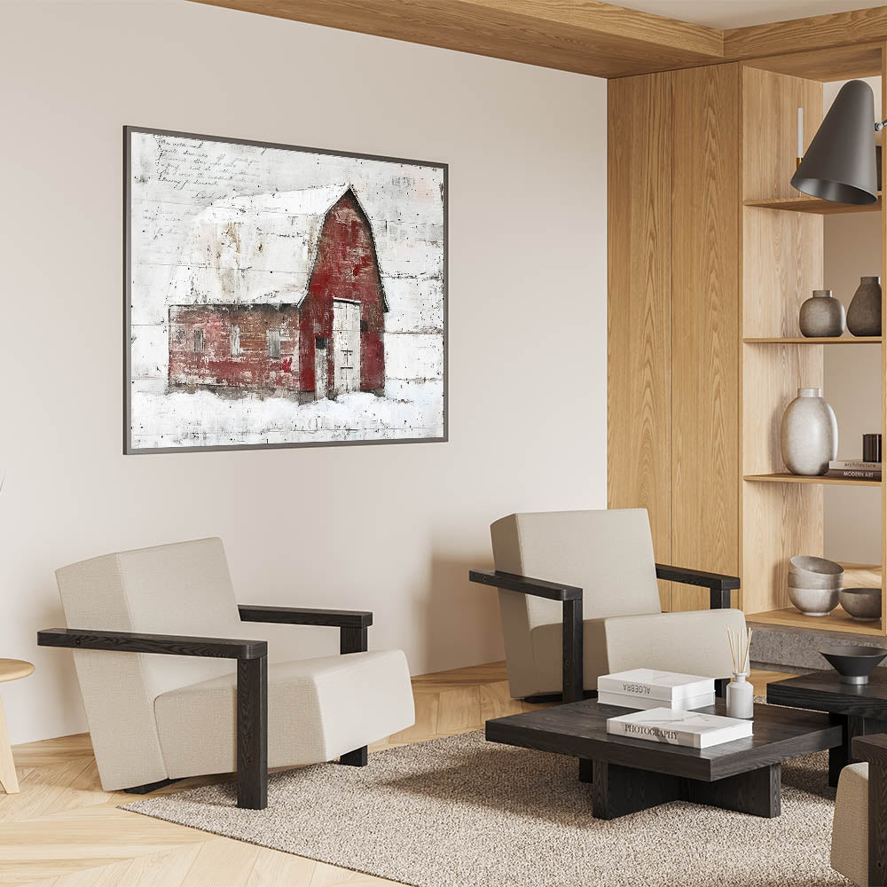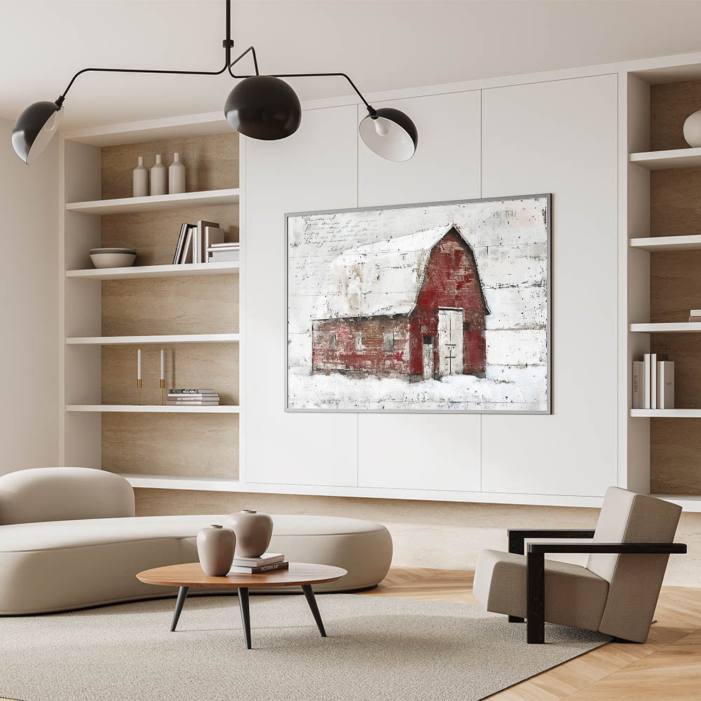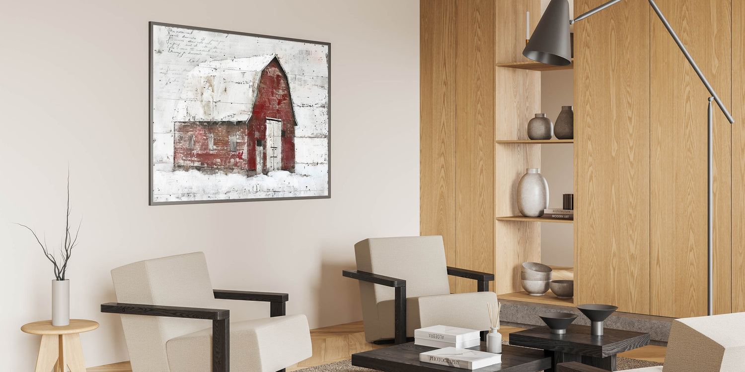 Bring the charm of rural countryside into your home with this rustic red and white barn wall art. Featuring a beautifully weathered red barn alongside a classic farmhouse, this artwork evokes the serenity of country life. The muted tones and distressed textures create a nostalgic and welcoming feel, making it the perfect addition to any farmhouse-inspired space. Whether you’re looking to decorate your living room, kitchen, or hallway, this barn landscape art will enhance the cozy, rustic atmosphere of your home.