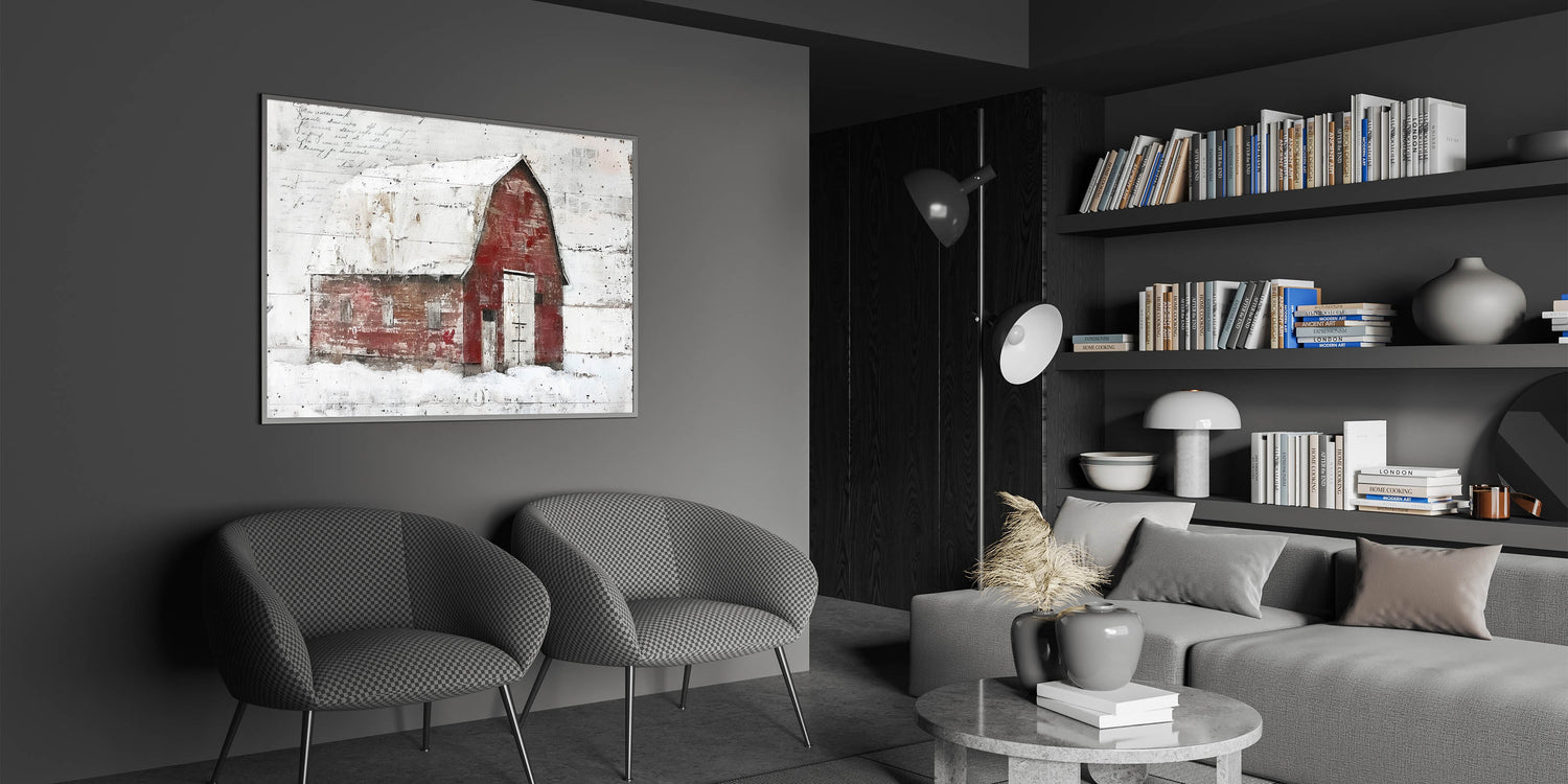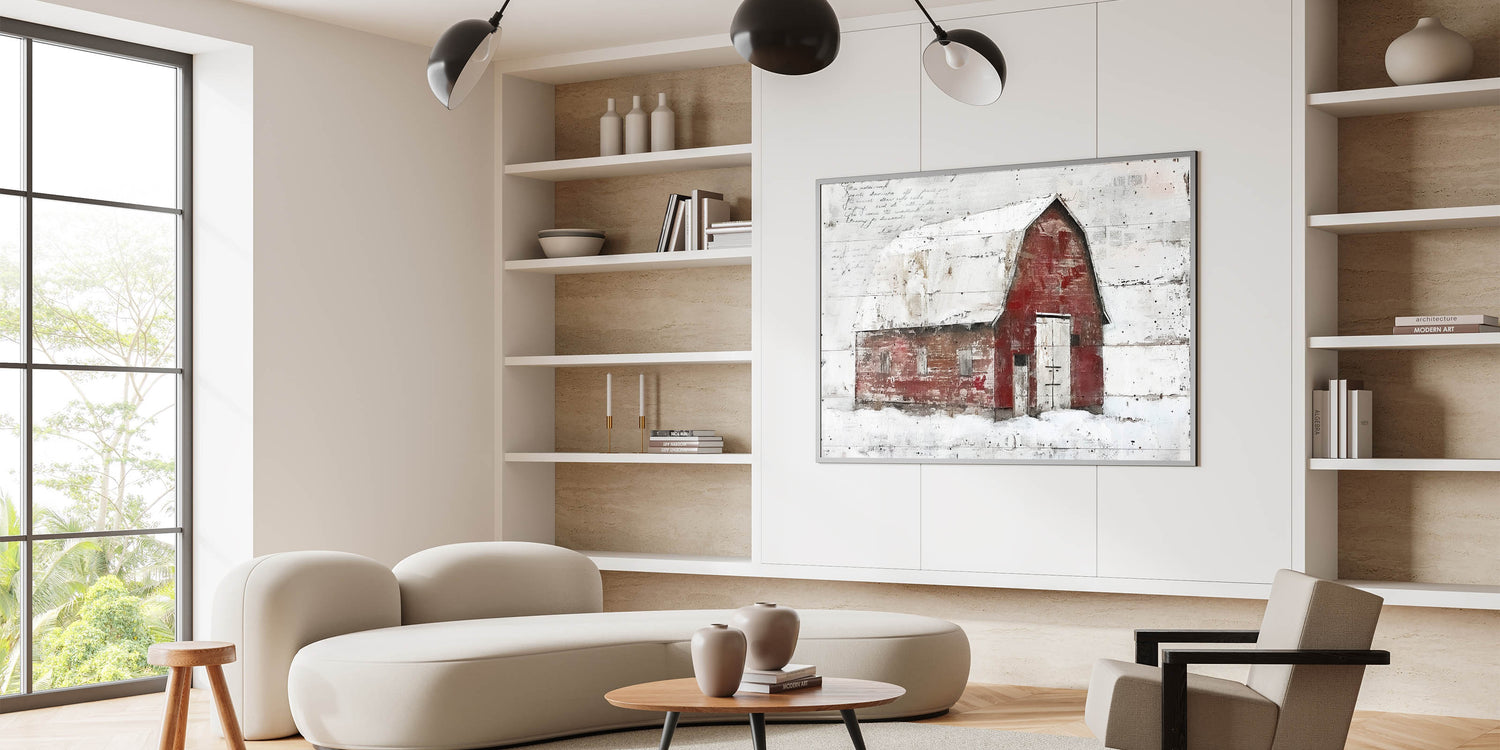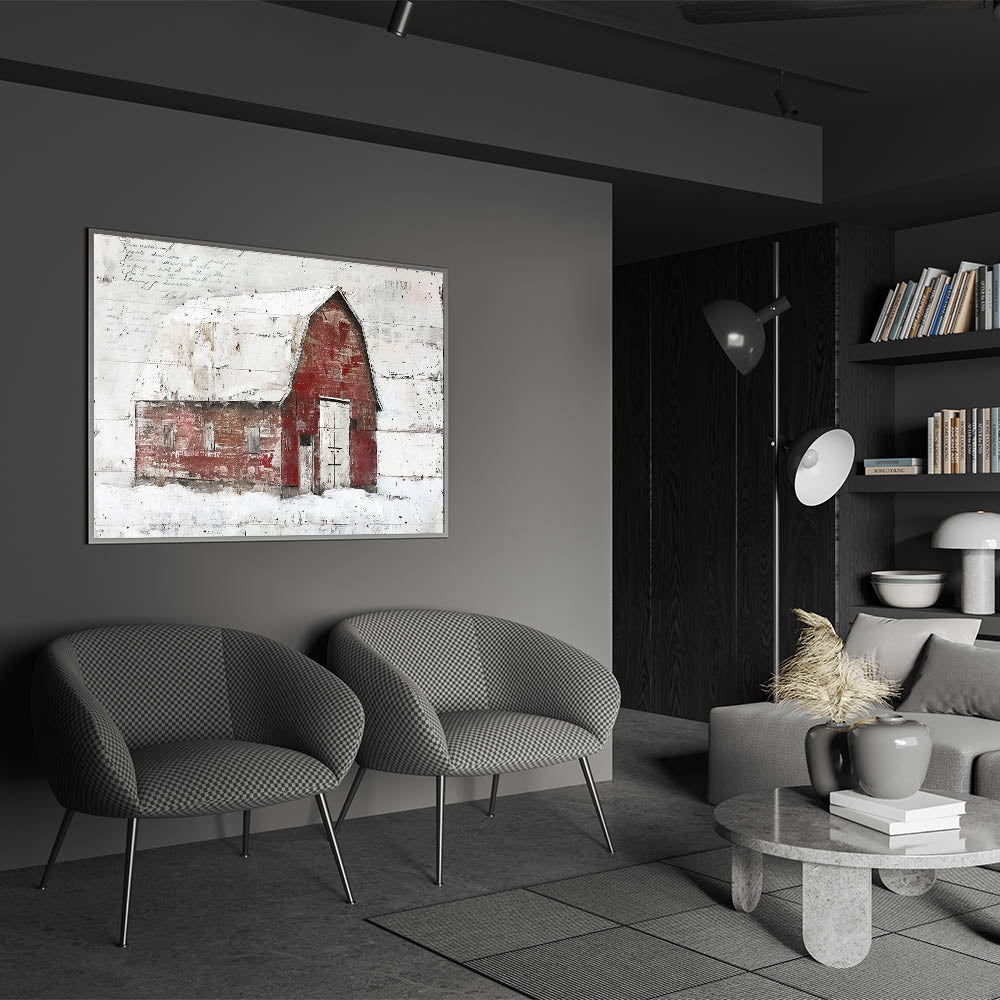 Bring the charm of rural countryside into your home with this rustic red and white barn wall art. Featuring a beautifully weathered red barn alongside a classic farmhouse, this artwork evokes the serenity of country life. The muted tones and distressed textures create a nostalgic and welcoming feel, making it the perfect addition to any farmhouse-inspired space. Whether you’re looking to decorate your living room, kitchen, or hallway, this barn landscape art will enhance the cozy, rustic atmosphere of your home.
