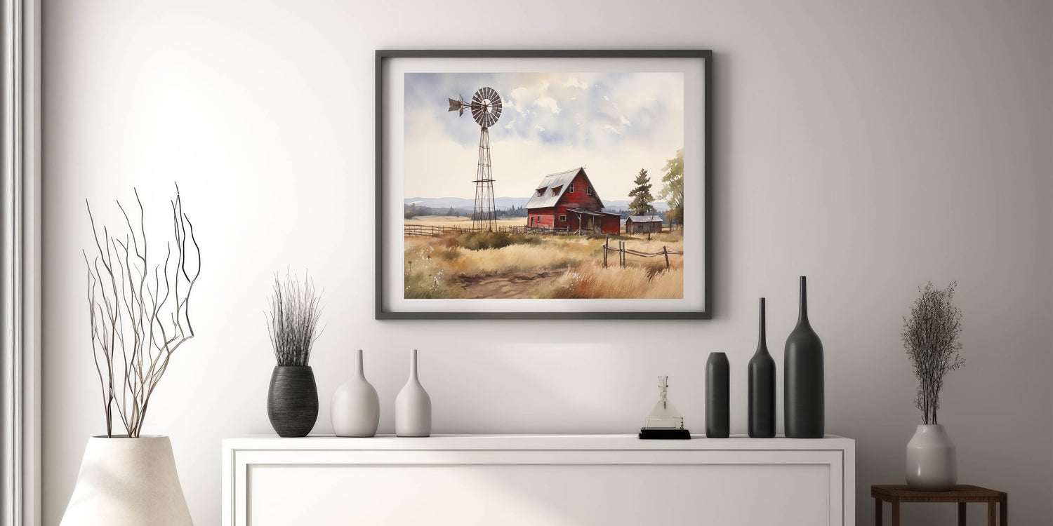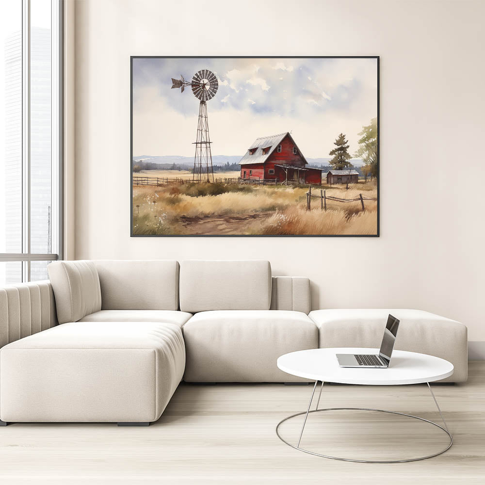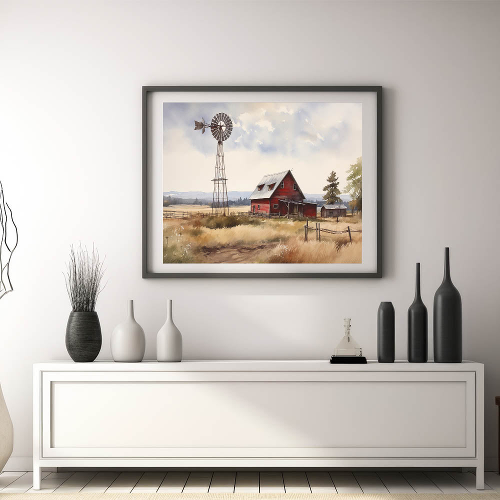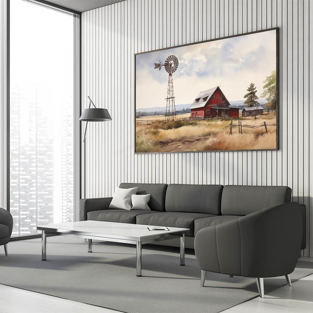 Capture the essence of rural serenity with this stunning golden fields barn landscape wall art. This artwork features a classic red barn set against rolling hills of golden wheat and lush green fields, creating a vivid contrast that brings the scene to life. The beautifully composed scene evokes the tranquility and charm of the countryside, making it a perfect addition to any farmhouse or rustic-themed decor.