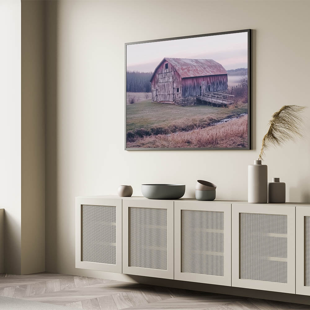 Immerse yourself in the tranquil beauty of rural landscapes with this rustic barn wall art. This photograph showcases a weathered wooden barn with a stone foundation, complete with a charming wooden bridge crossing a gentle stream. Set against a soft, misty backdrop, the pastel hues of the sky and countryside add a peaceful and timeless charm, perfect for farmhouse-inspired interiors.