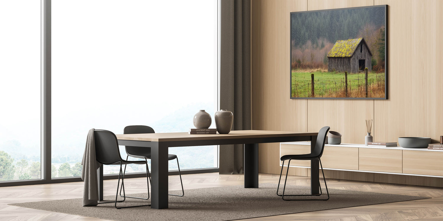 Capture the charm of nature and rural life with this rustic moss-covered barn wall art. This artwork features a weathered wooden barn surrounded by lush greenery and a serene forest backdrop. The barn's mossy roof adds a touch of character, while the soft natural tones evoke the tranquility of countryside living. This piece is perfect for farmhouse and rustic-inspired interiors.