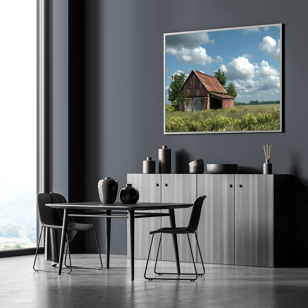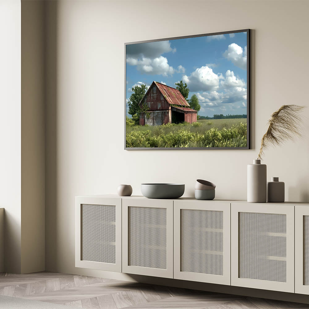 Capture the essence of rural charm with this rustic red barn wall art. This artwork features an aged, weathered barn set against a backdrop of open fields and a serene blue sky filled with fluffy clouds. The rich textures and natural colors of the barn create a sense of nostalgia, making it a perfect addition to any farmhouse or country-inspired space.