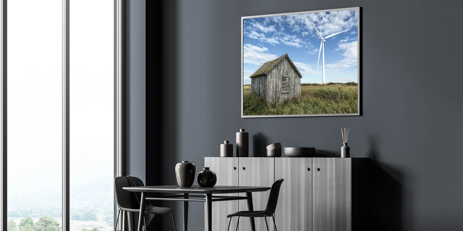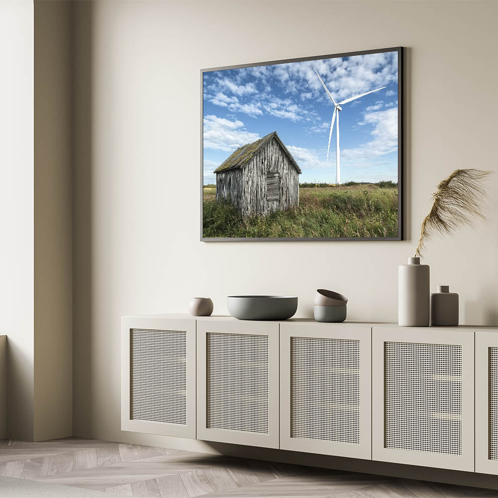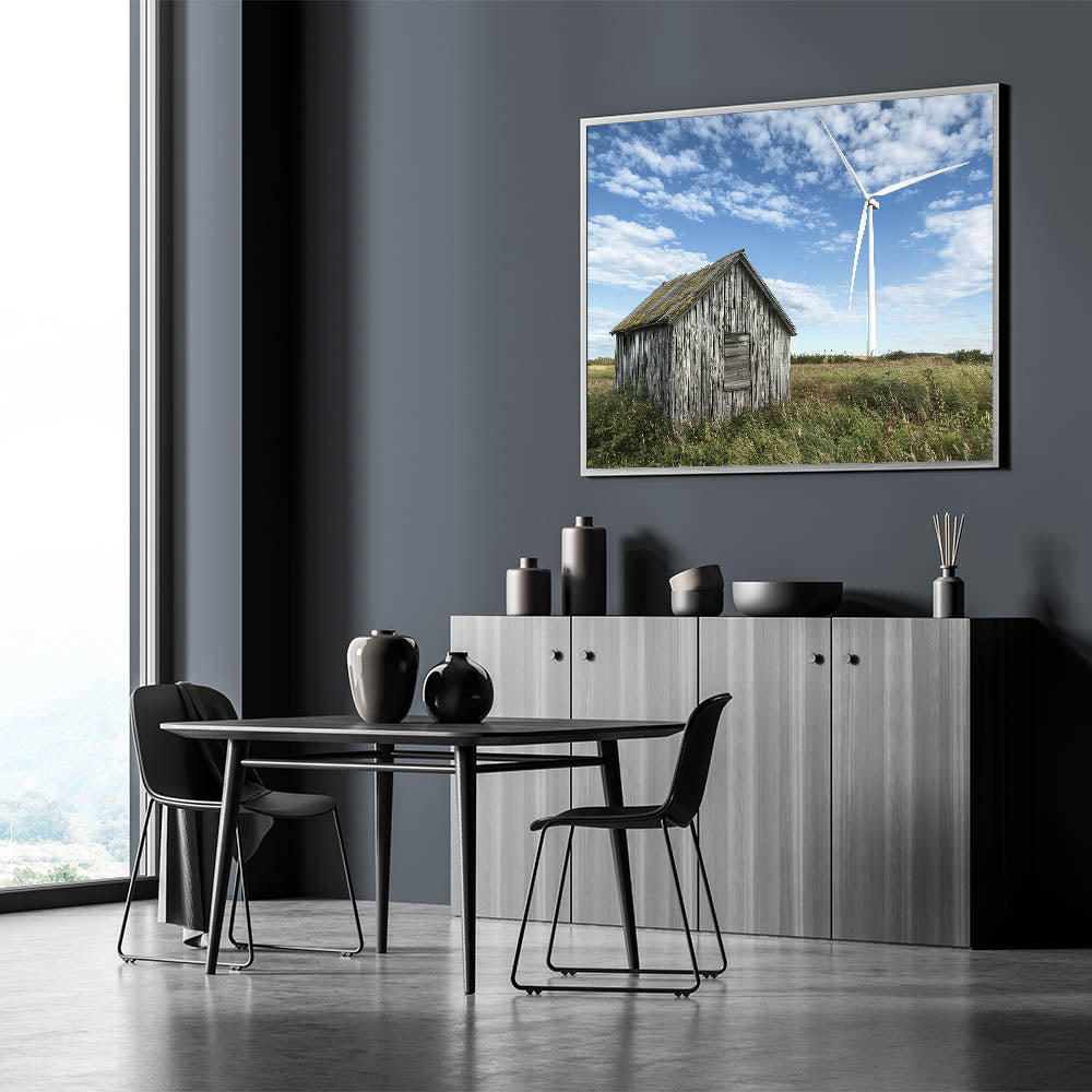 Bring the harmony of tradition and modernity into your space with this stunning barn landscape photography. This artwork features a weathered wooden barn set in lush grasslands, contrasted with a sleek white wind turbine under a vibrant blue sky. The rustic charm of the barn paired with the clean, modern lines of the windmill creates a unique visual story, perfect for farmhouse or contemporary country-style decor.