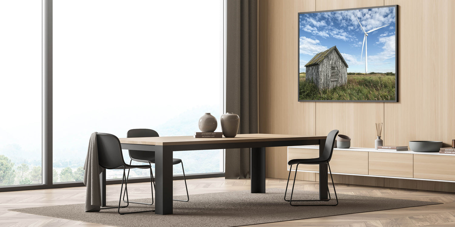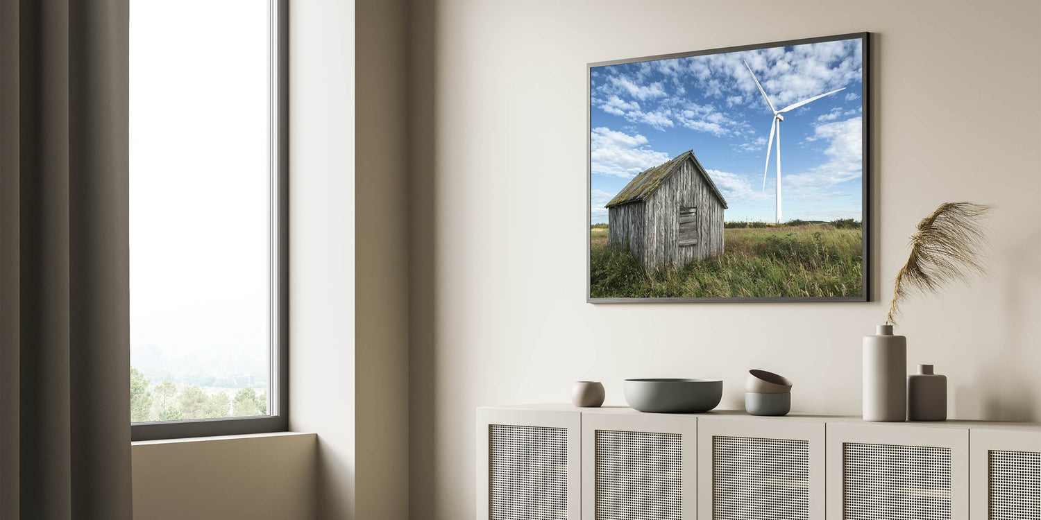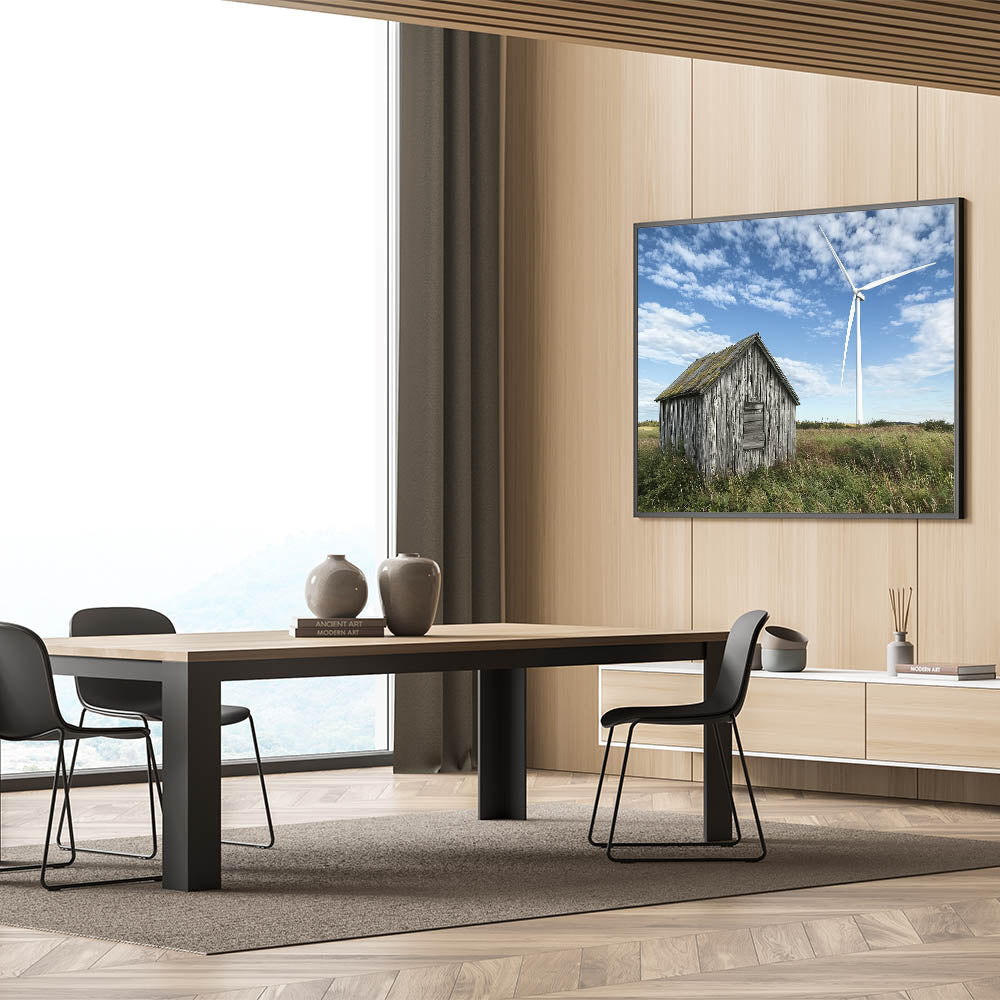 Bring the harmony of tradition and modernity into your space with this stunning barn landscape photography. This artwork features a weathered wooden barn set in lush grasslands, contrasted with a sleek white wind turbine under a vibrant blue sky. The rustic charm of the barn paired with the clean, modern lines of the windmill creates a unique visual story, perfect for farmhouse or contemporary country-style decor.