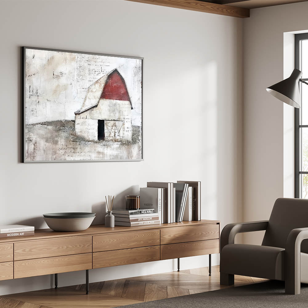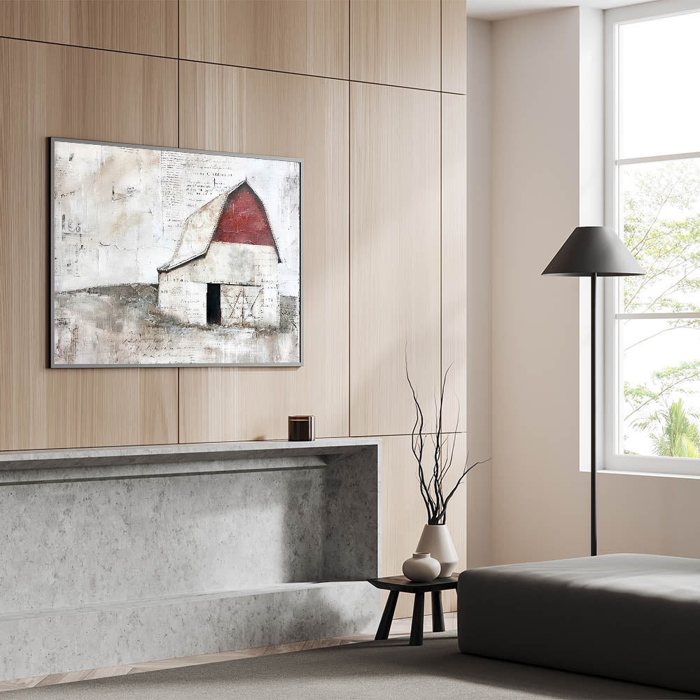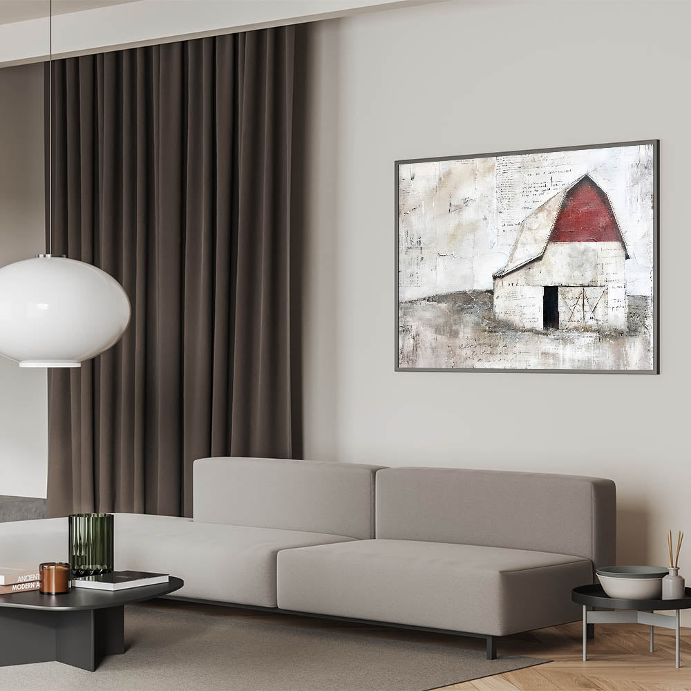 • Depicts a weathered red barn with an aged, distressed finish, ideal for country-inspired and farmhouse decor.