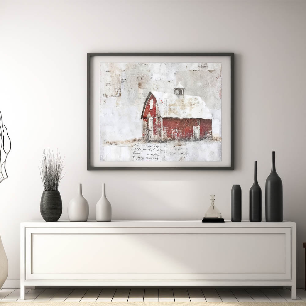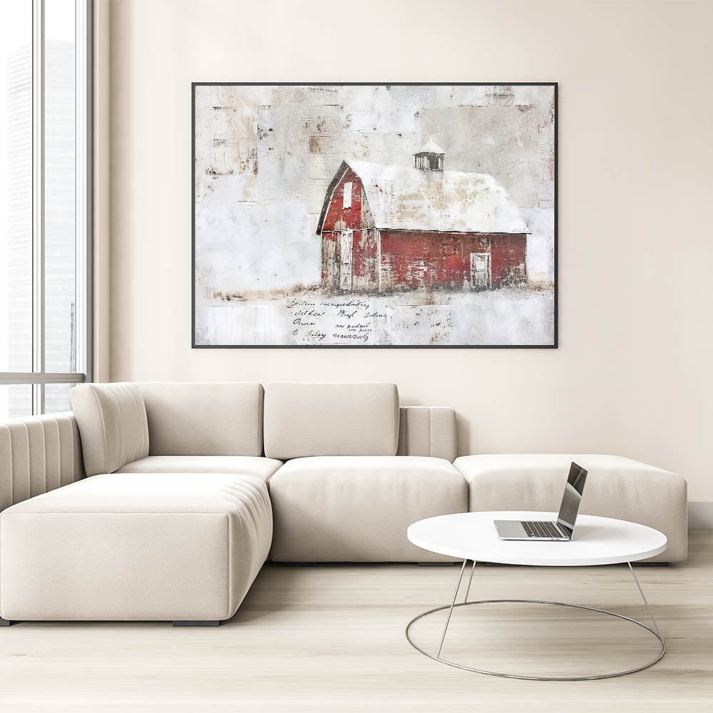 • Depicts a weathered red barn with a whitewashed roof, ideal for country-inspired and farmhouse decor.
