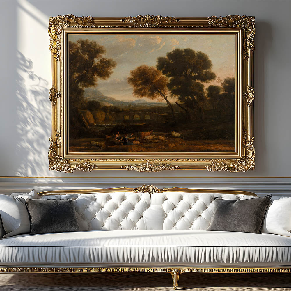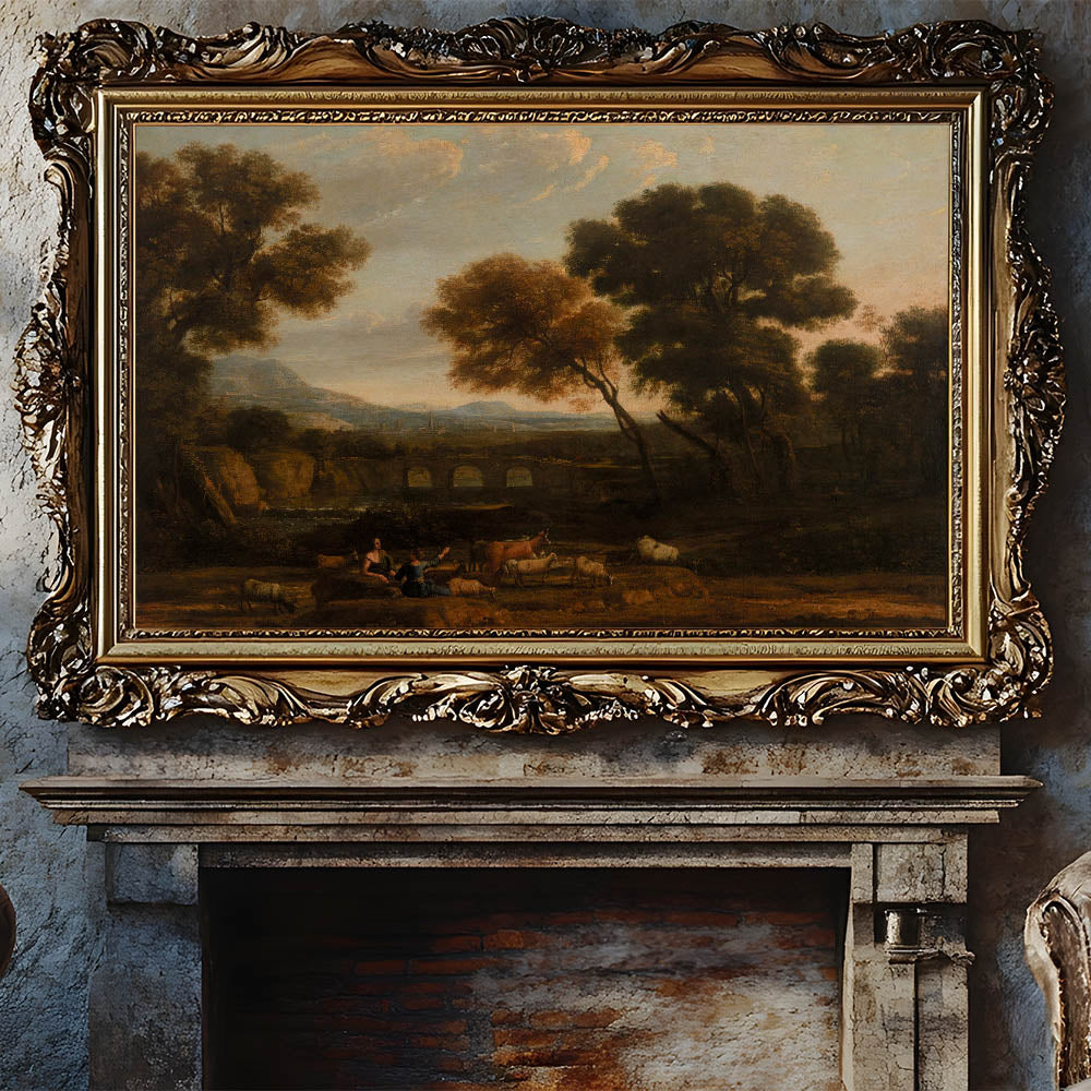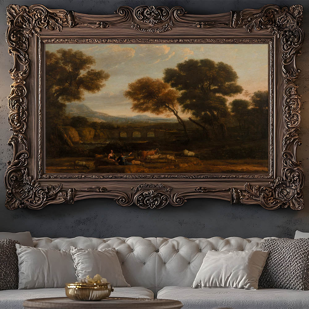 Transform your space with this stunning Baroque pastoral landscape art print. Featuring a tranquil countryside scene, this artwork showcases shepherds and their grazing flock amidst a serene landscape of lush trees, flowing rivers, and distant hills. The rich colors and intricate details evoke the peaceful beauty of rural life, capturing the timeless elegance of the Baroque period.